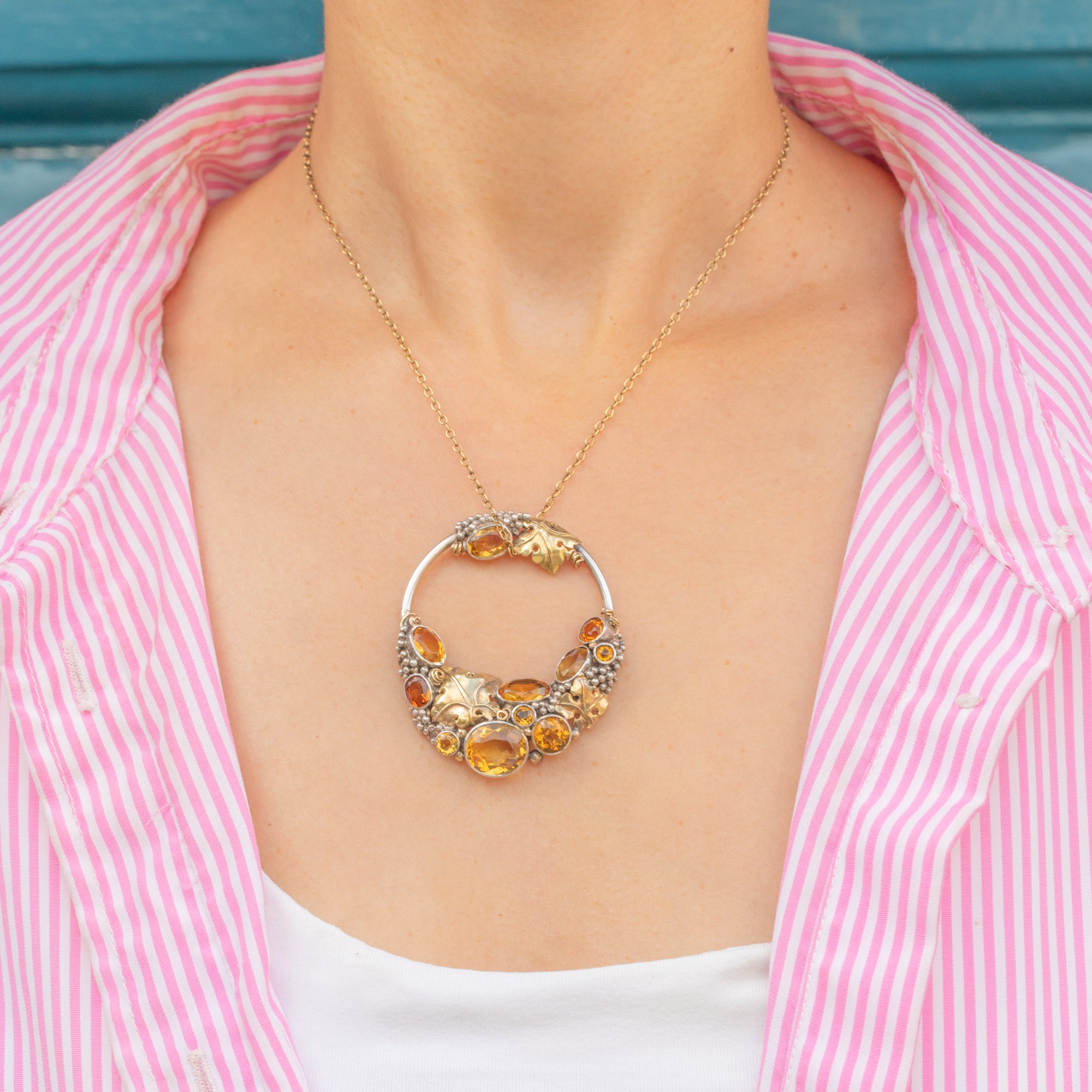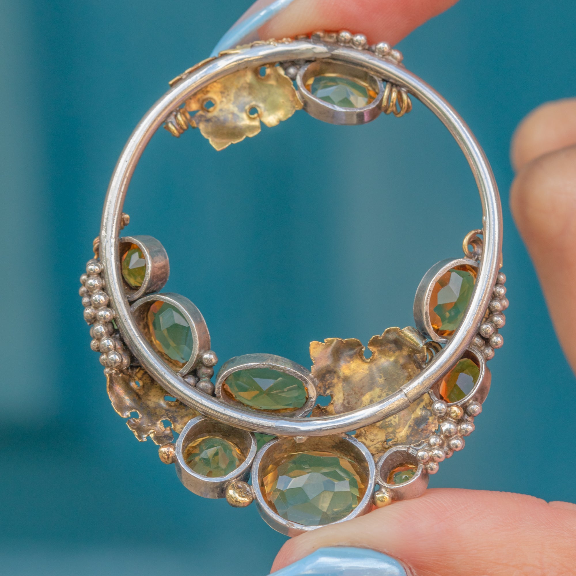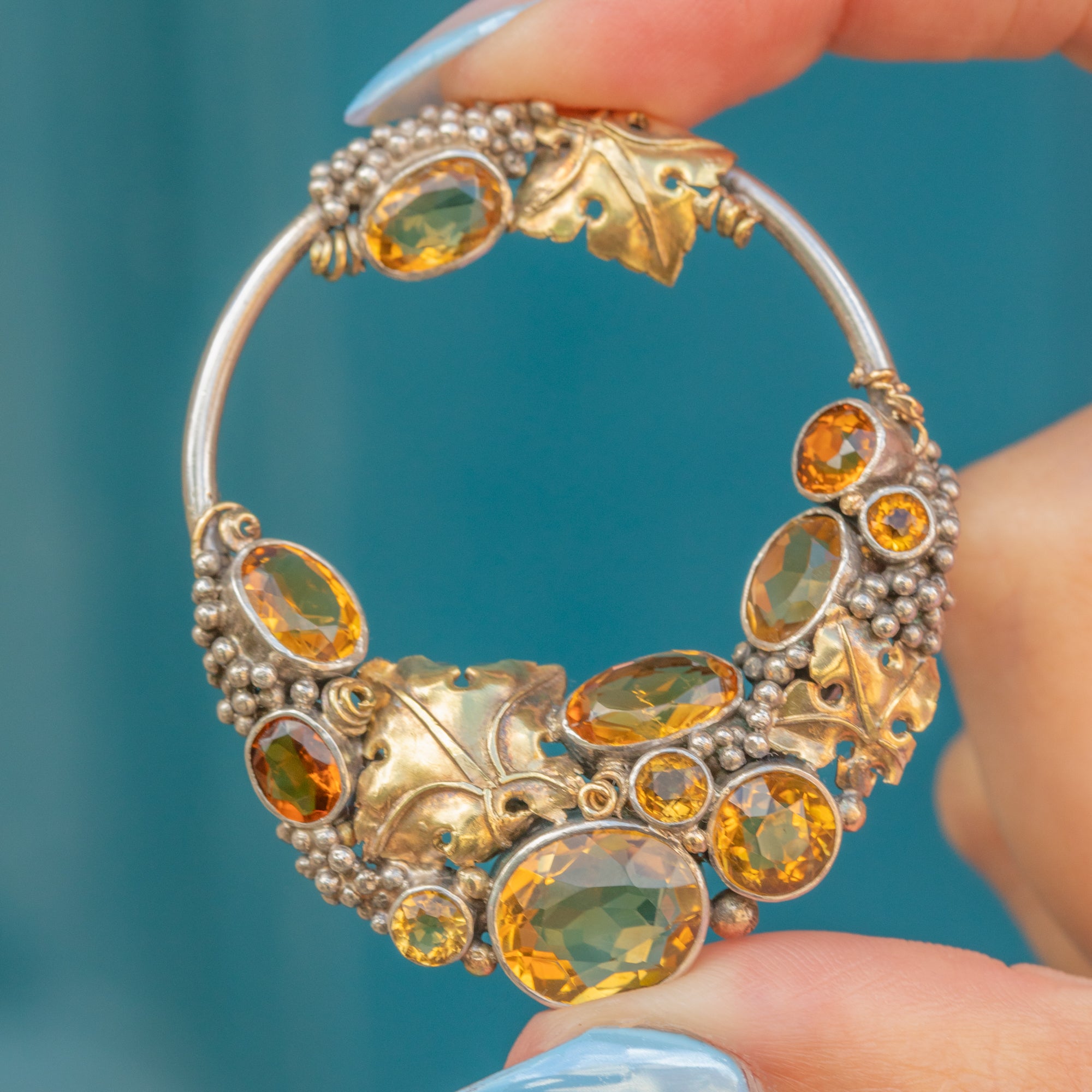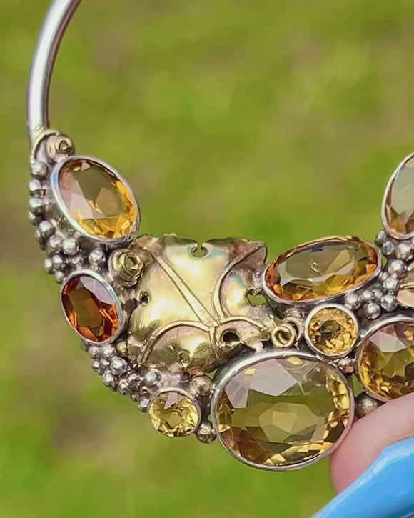 The roundel form is crafted from solid Silver and displays 7.64 carats of syrupy Citrines artfully arranged amongst granulated "grape" details, accented by orantely formed 18ct Gold leaves.