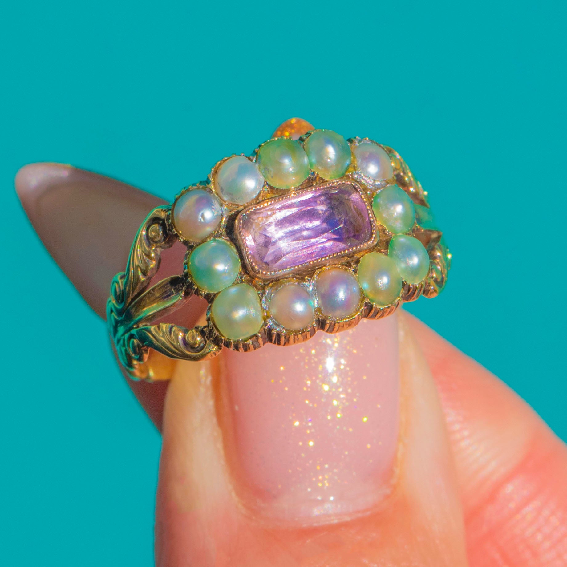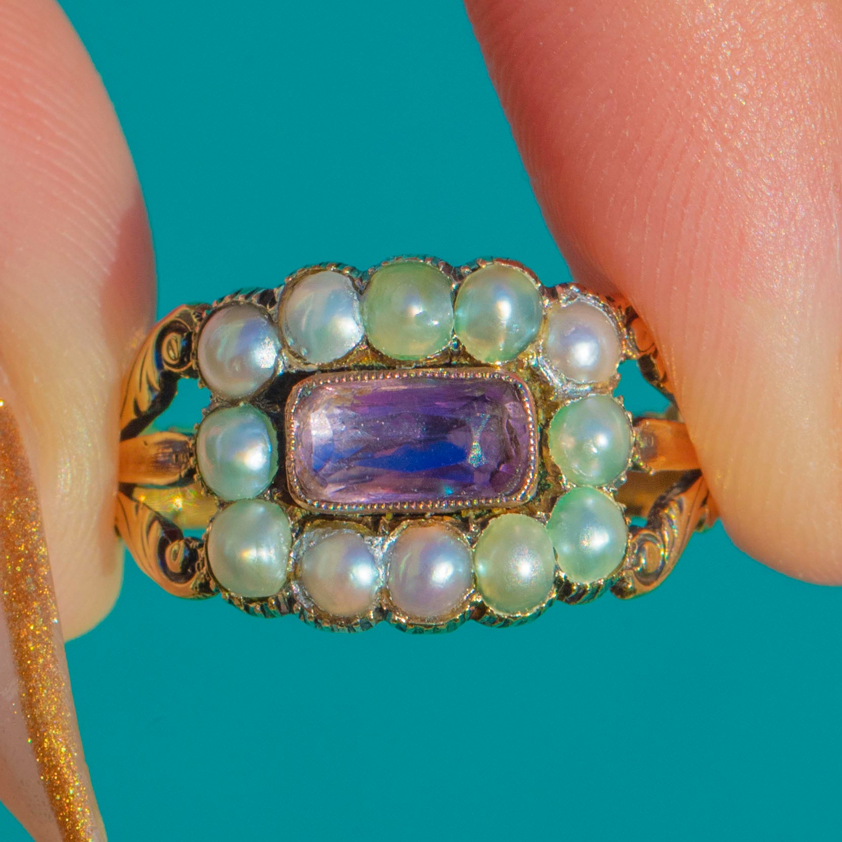 A glorious 19th Century Georgian ring, circa 1820. Crafted in rich 15ct Gold and set with a rectangular Rose-de-France Amethyst framed by a halo of luminous Pearls. The contrast between the lilac Amethyst and the soft, glowing Pearls gives the ring a dreamy, romantic feel that is unmistakably antique.
