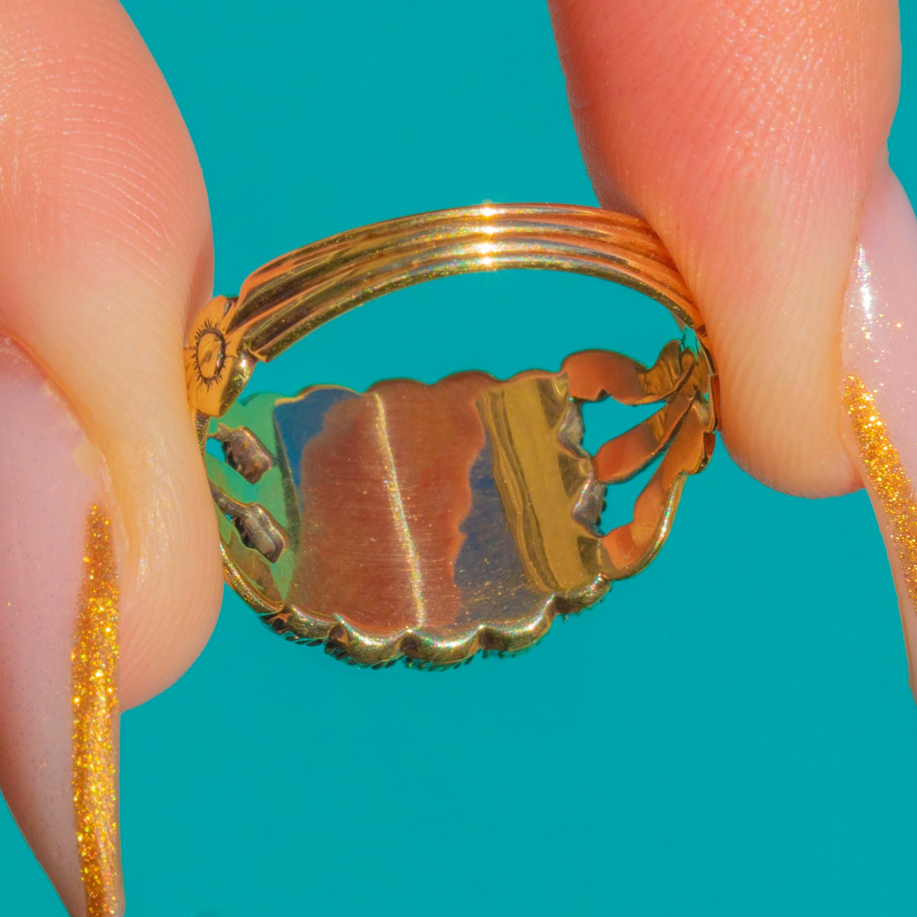 The shoulders are beautifully chased with scrolling motifs, leading to a slender tapering band that feels delicate yet characterful on the hand.