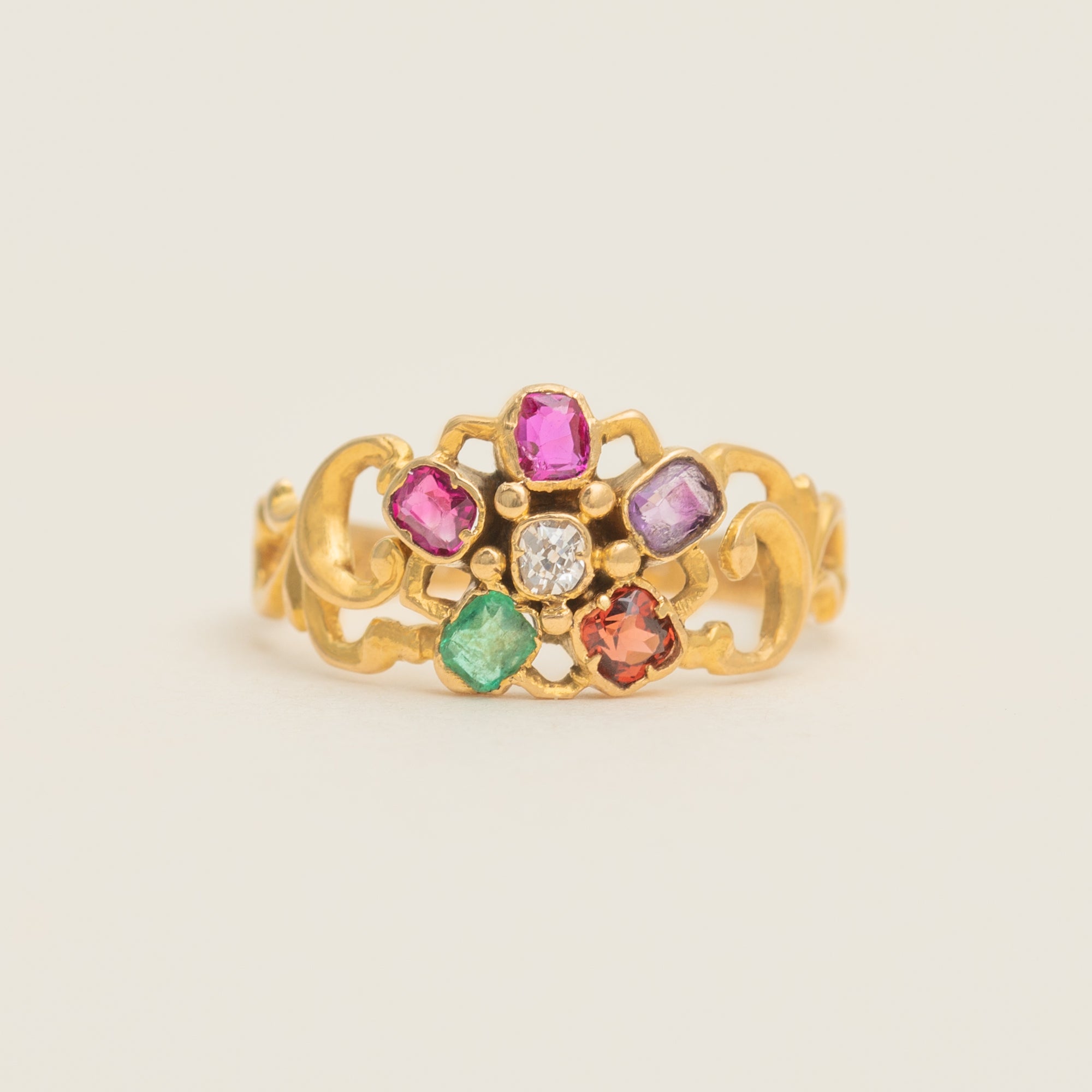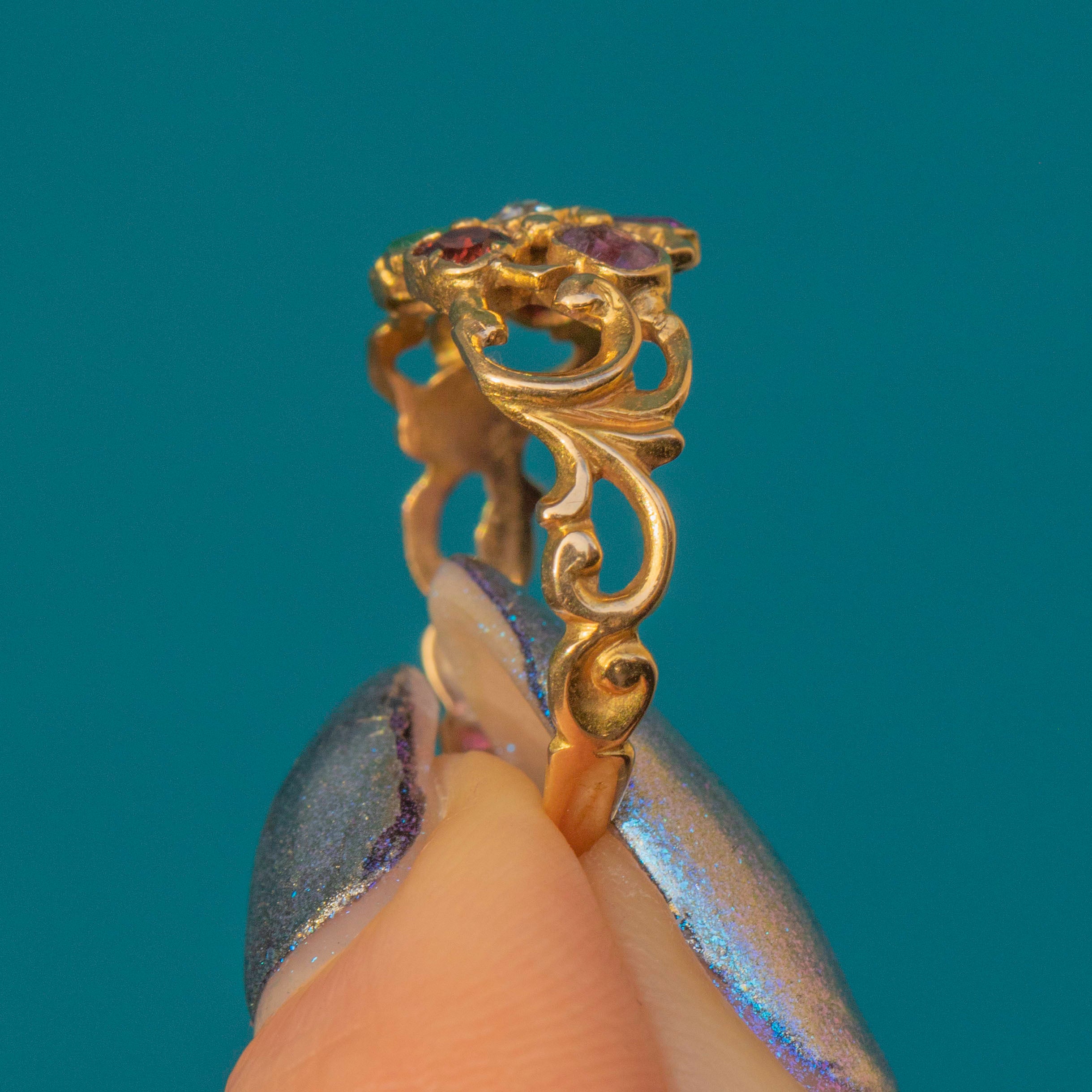 Fall in love with this romantic early Victorian 18ct Gold acrostic pansy flower ring! The ring has been beautifully constructed with wispy openwork shoulders and a pansy flower with gemstones spelling out 'regard', namely a Ruby, Emerald, Garnet, Amethyst, Ruby and a Diamond.