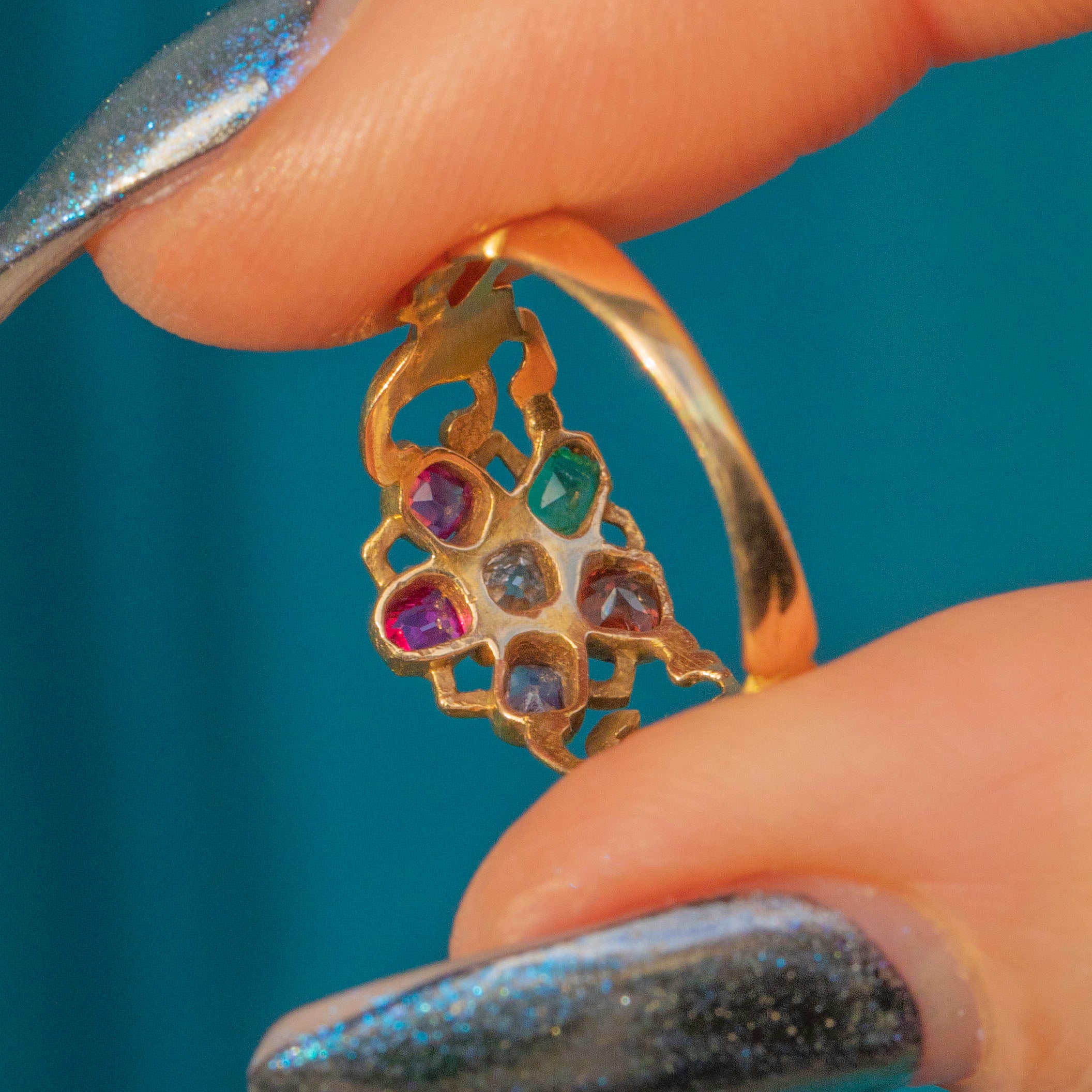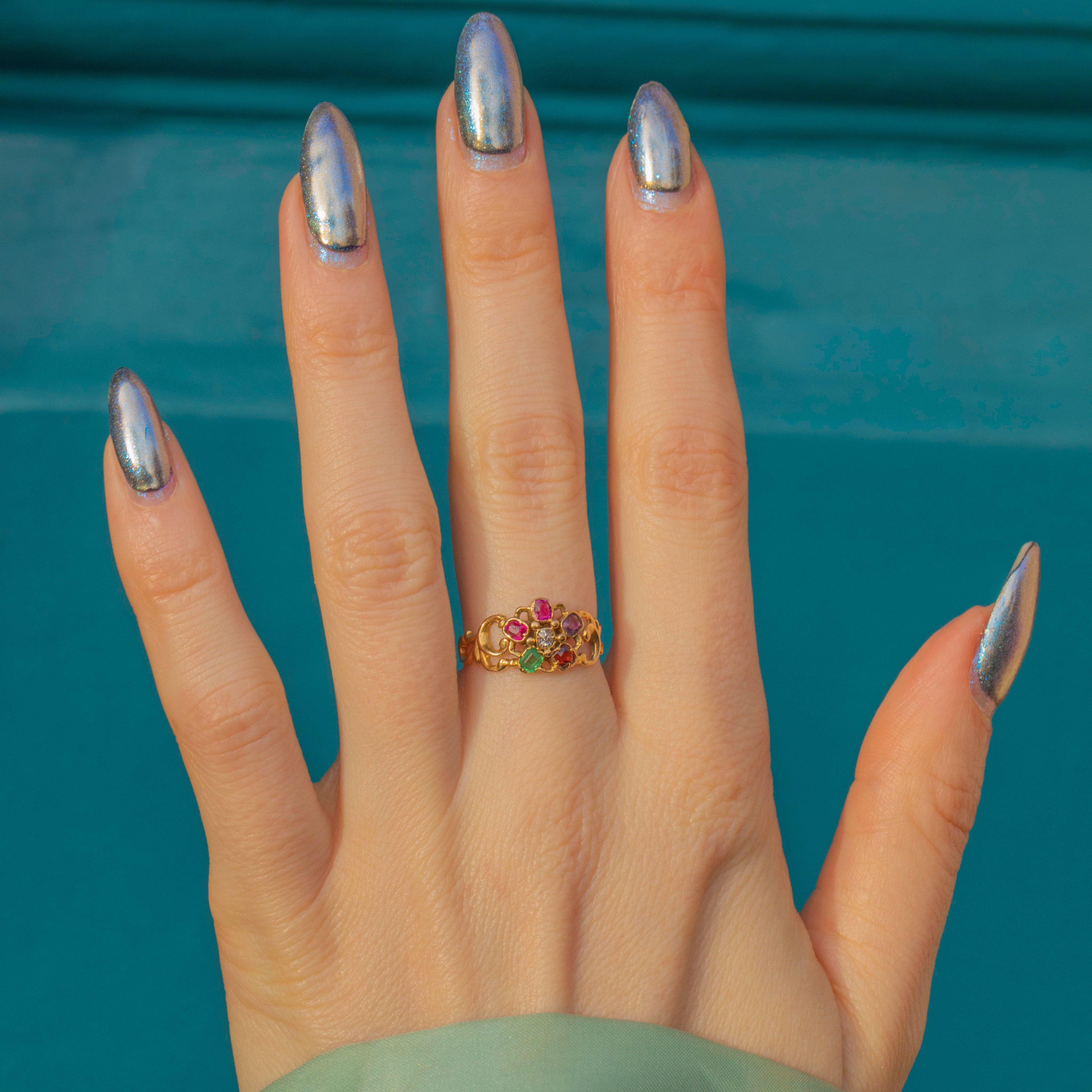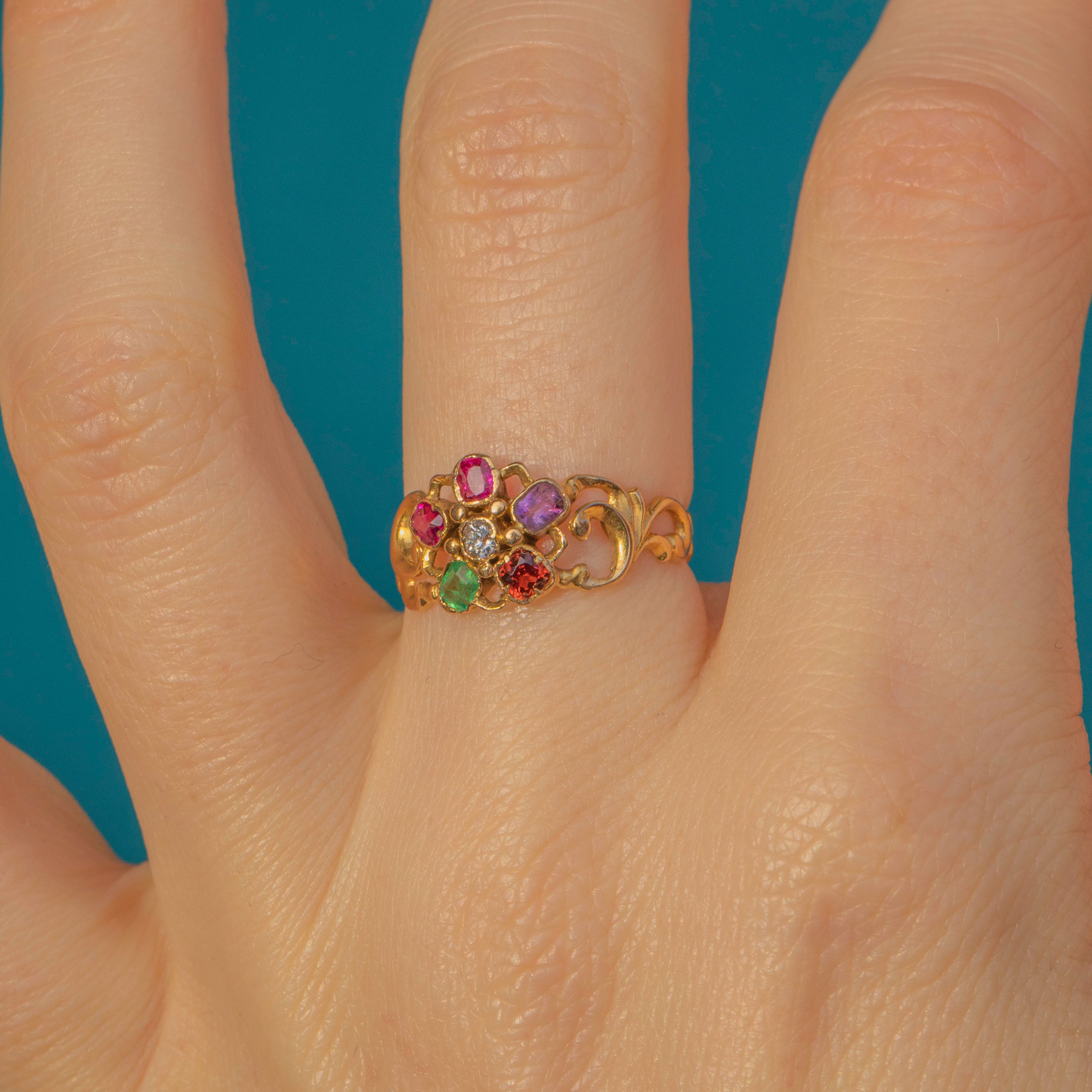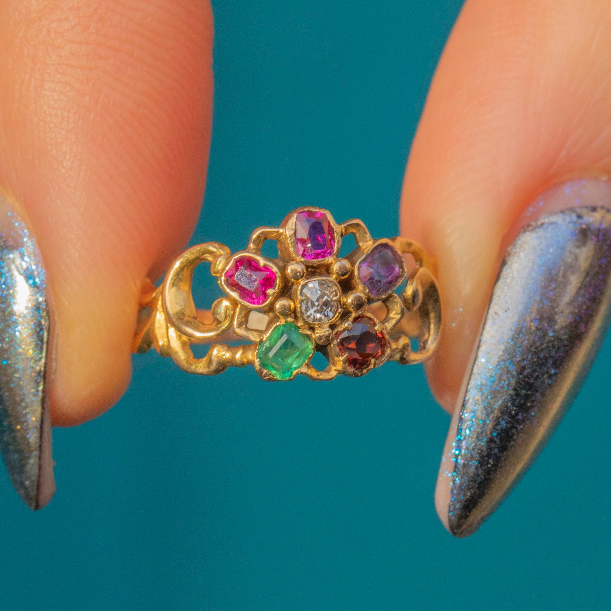 Popularised in the 1800's, acrostic rings were a way to secretly give messages to a loved one, and the owner of this ring is sure to have been thought of highly by its giver! This is a gorgeous early Victorian ring for your collection.