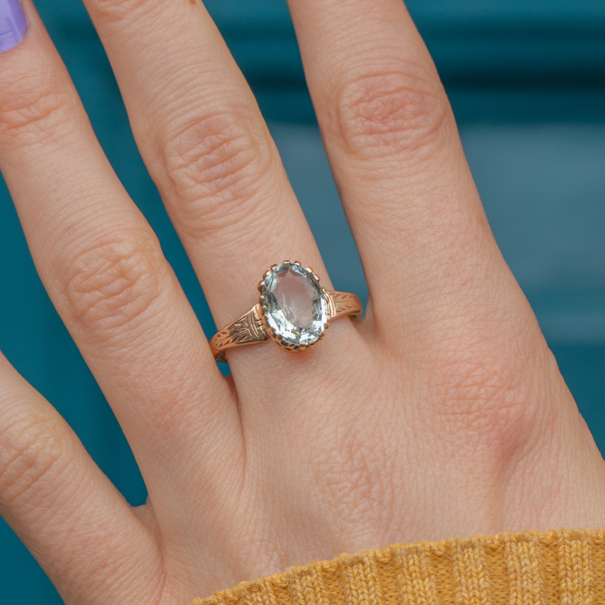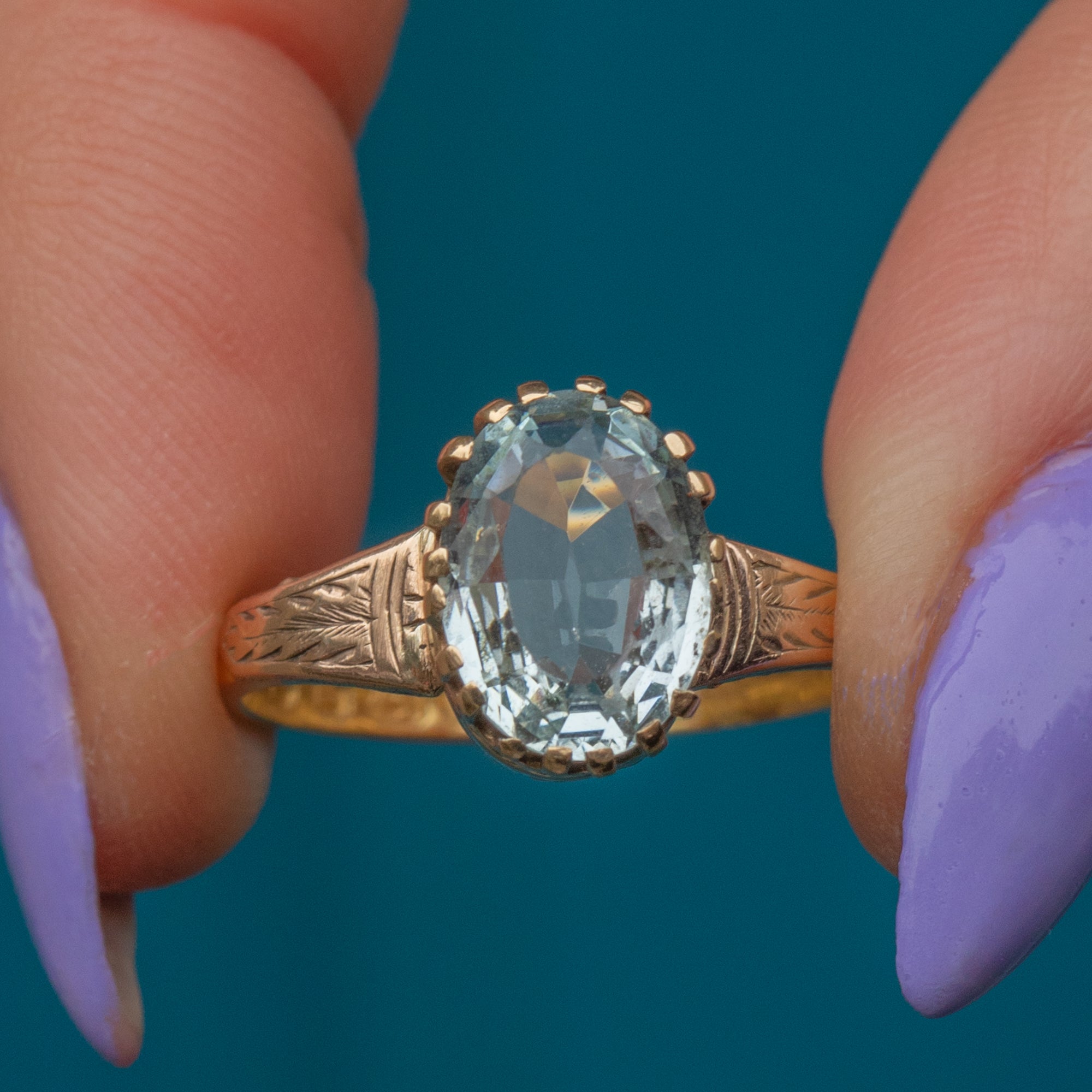 Early Victorian 18ct Gold Aquamarine Ring c.1866, Engraved Shoulders