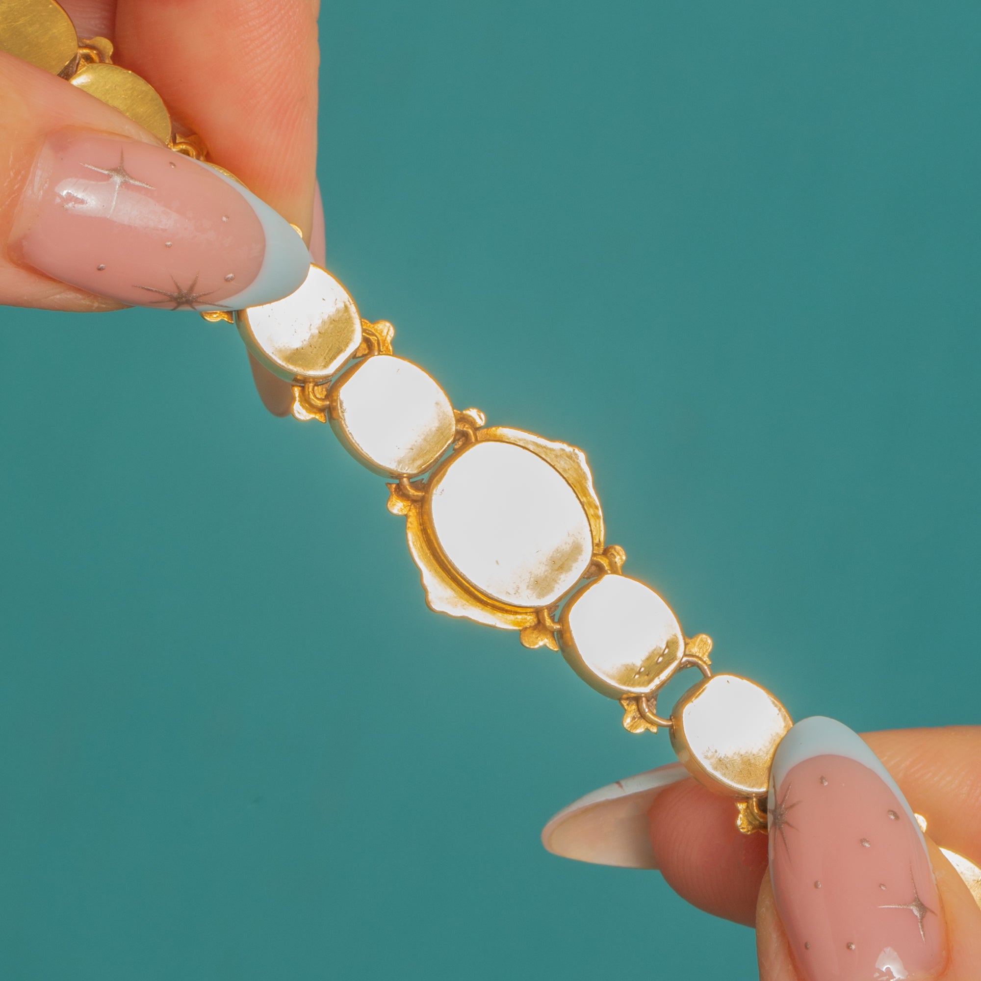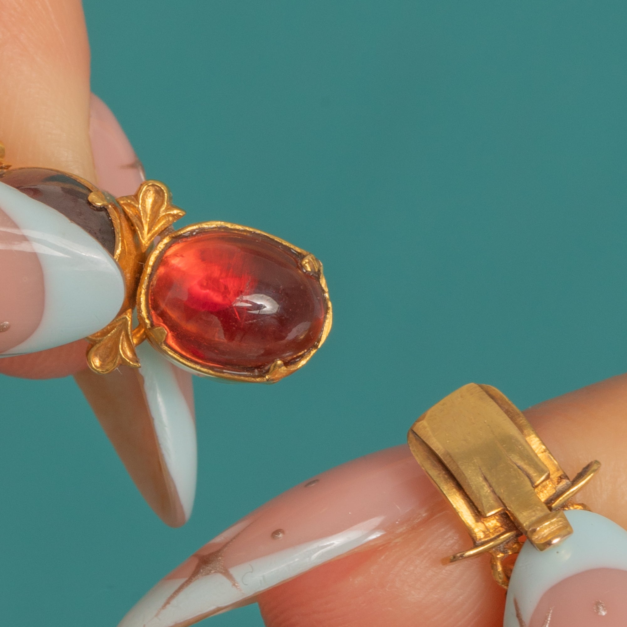 Romance and refinement abound in this Early Victorian rivière bracelet, crafted in rich 18ct Gold and set with glowing Garnet cabochons. The oval stones are beautifully arranged with a subtle graduation to a larger central gem, framed by delicate foliate details and trefoil spacers that lend a refined, botanical rhythm across the wrist.