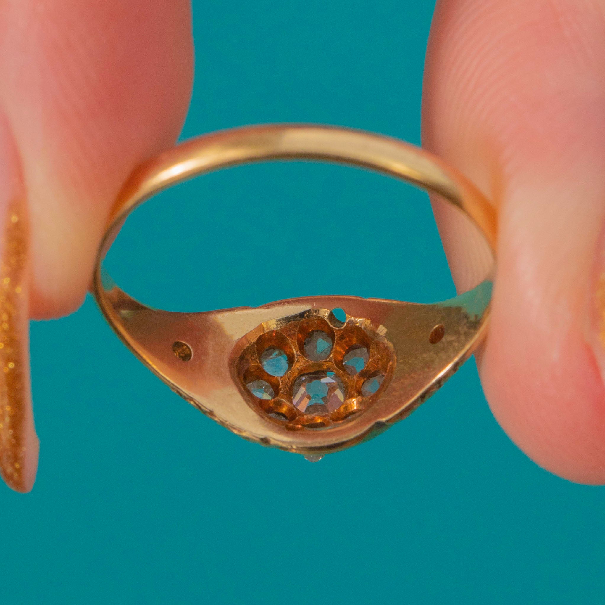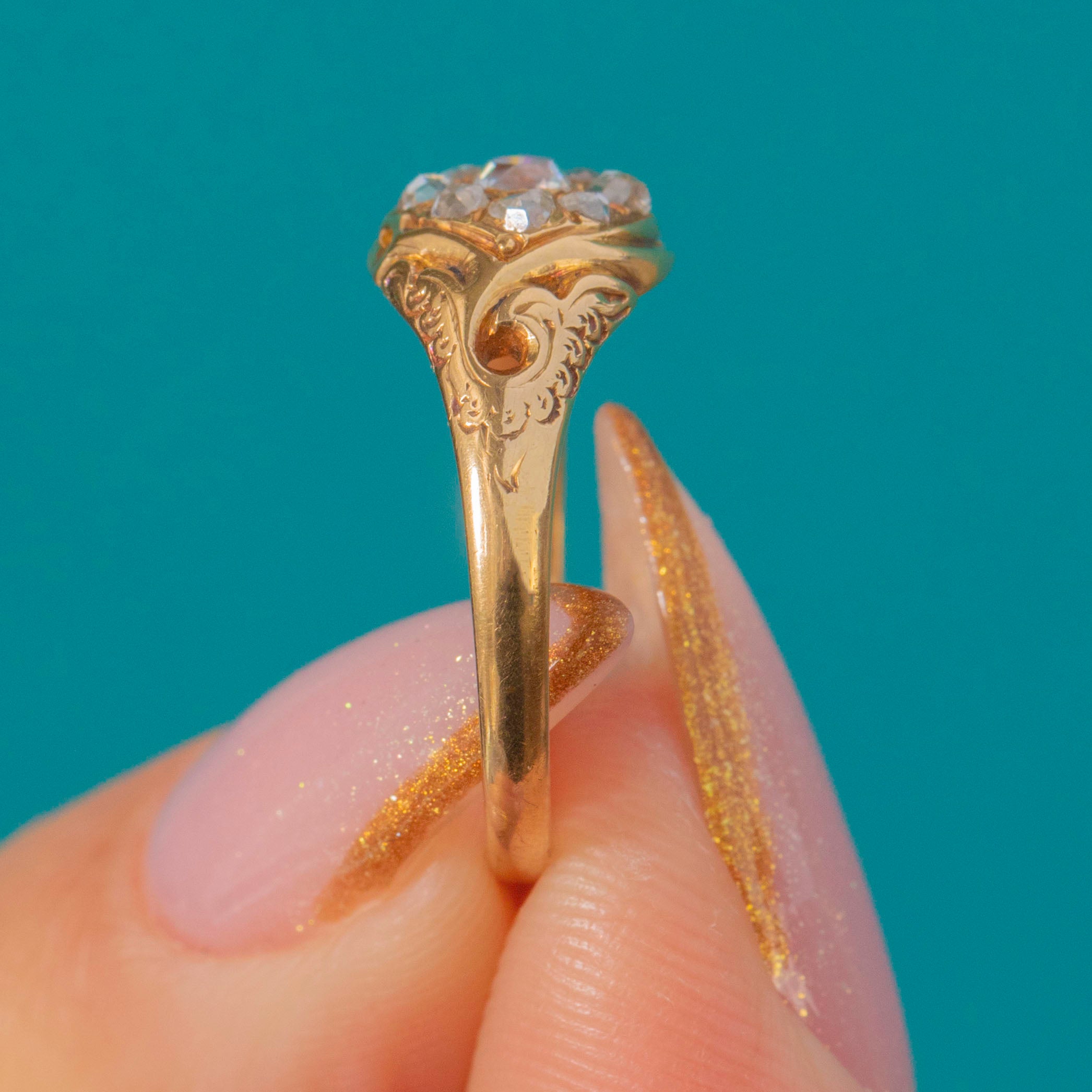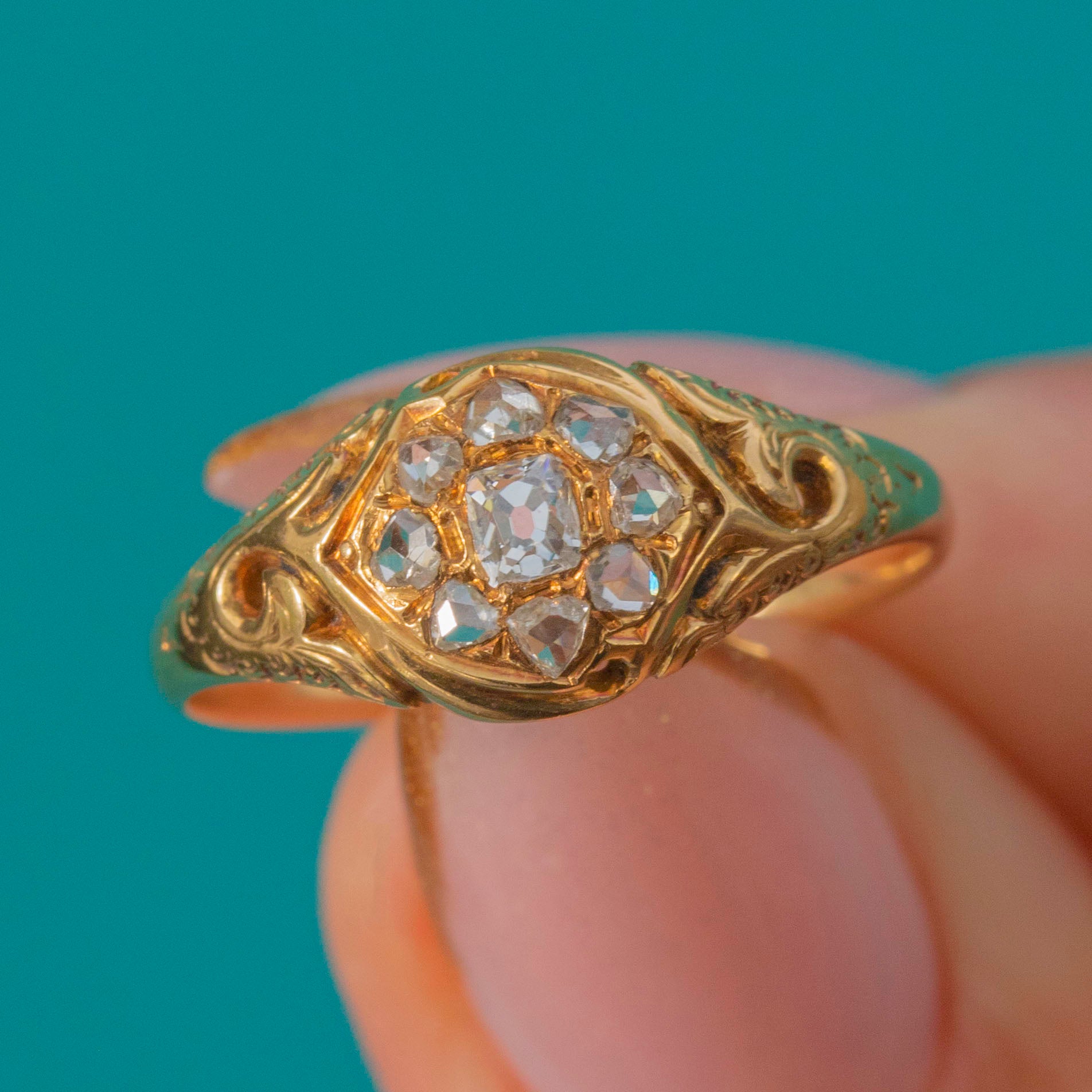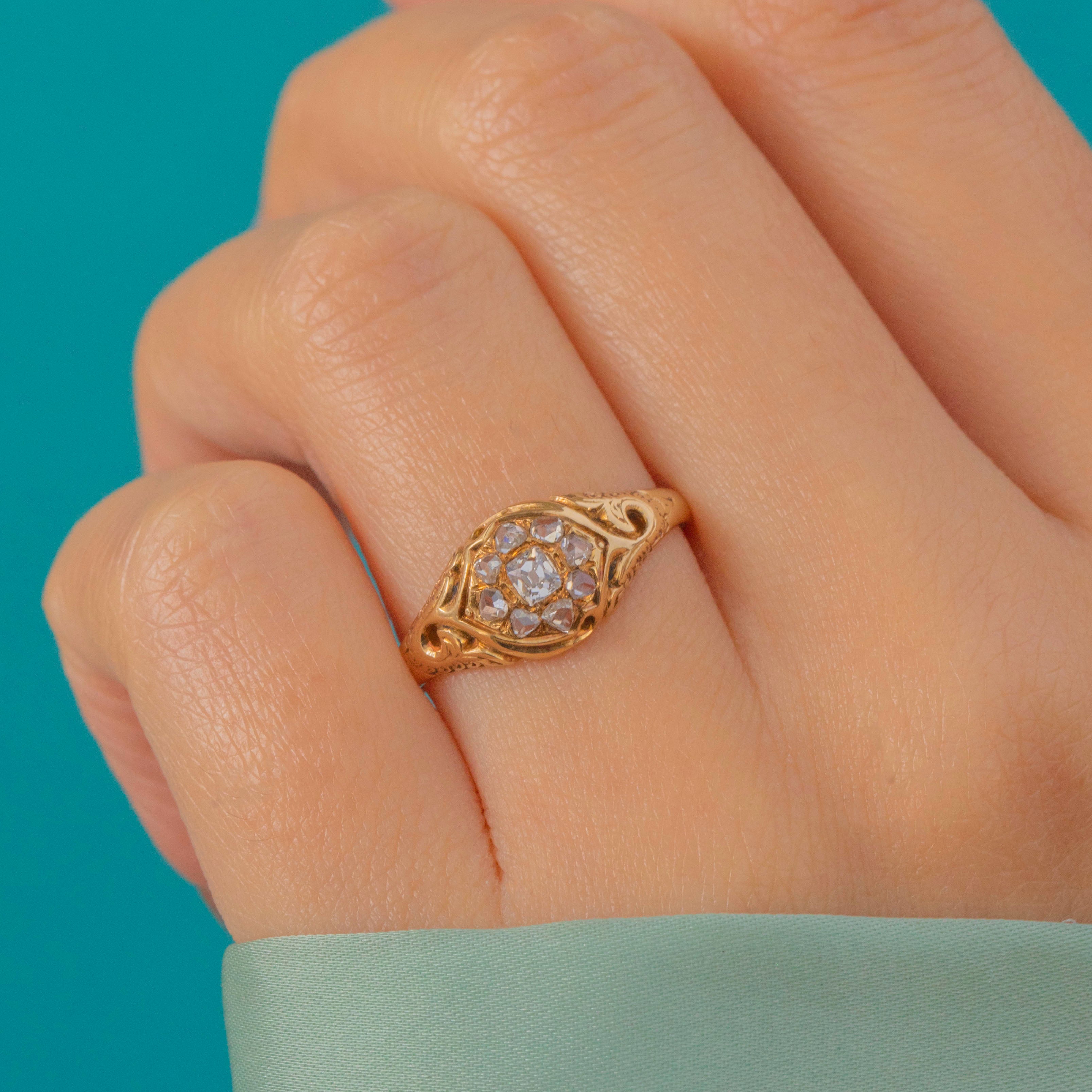 This exquisite 18ct Gold early Victorian cluster ring sparkles with a central old mine-cut Diamond surrounded by delicate rose-cut accents, all set in a beautifully detailed 18ct Gold mount. The openwork shoulders and engraved scrolls are quintessential of the 1850s, full of charm and craftsmanship from the early days of the Diamond engagement ring tradition.