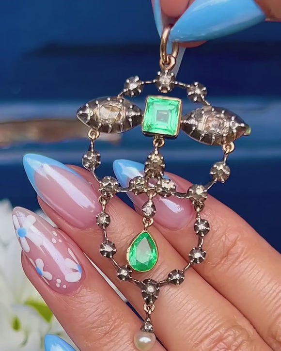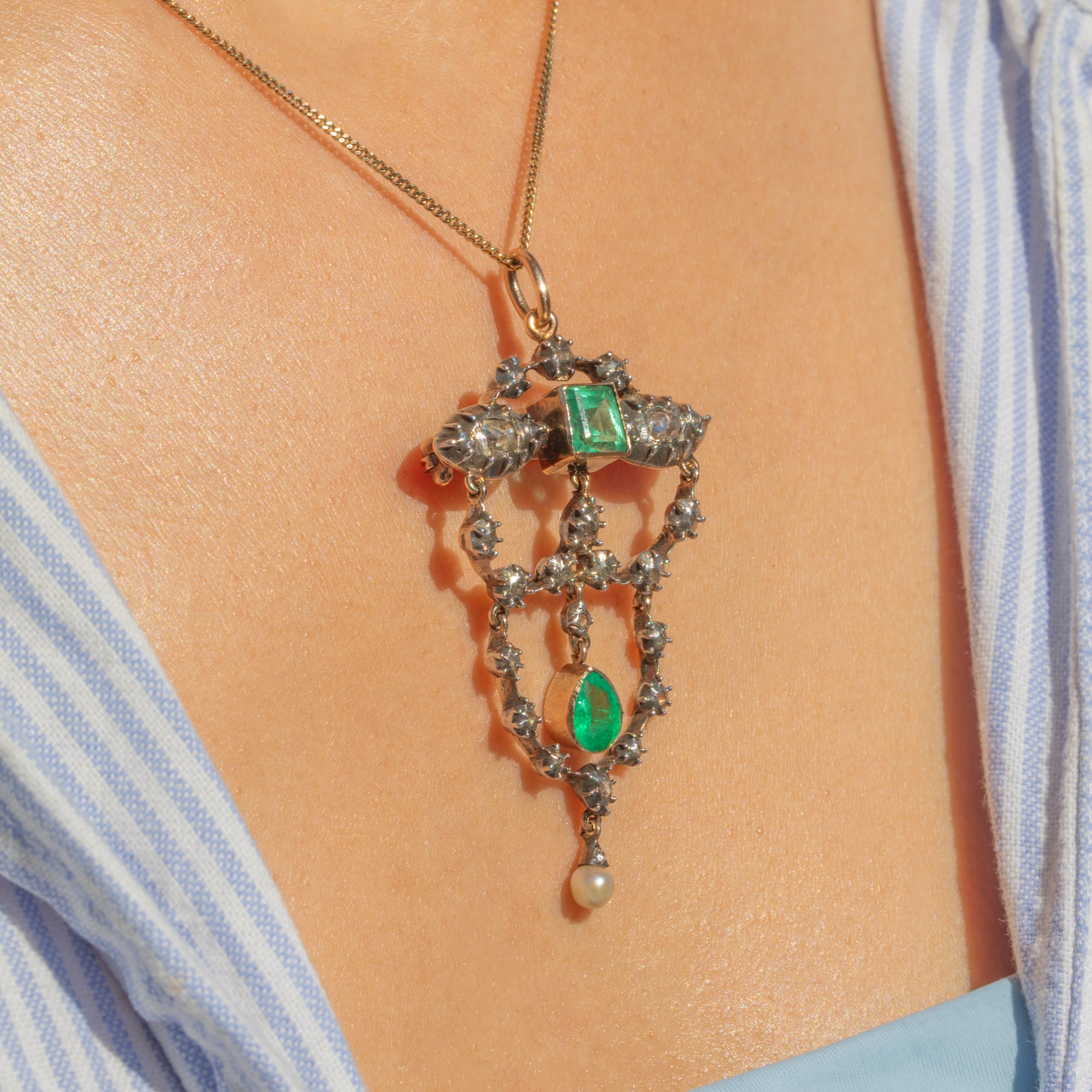 Crafted from 18ct Gold and Silver, as was typical of the Victorian era, this pendant displays 1.45cts of vibrant Emeralds, one with a regal square-cut and the other a delicate pear-cut, and rose-cut Diamonds in traditional piecrust settings, with an enchanting Pearl accent at the base of the drop.