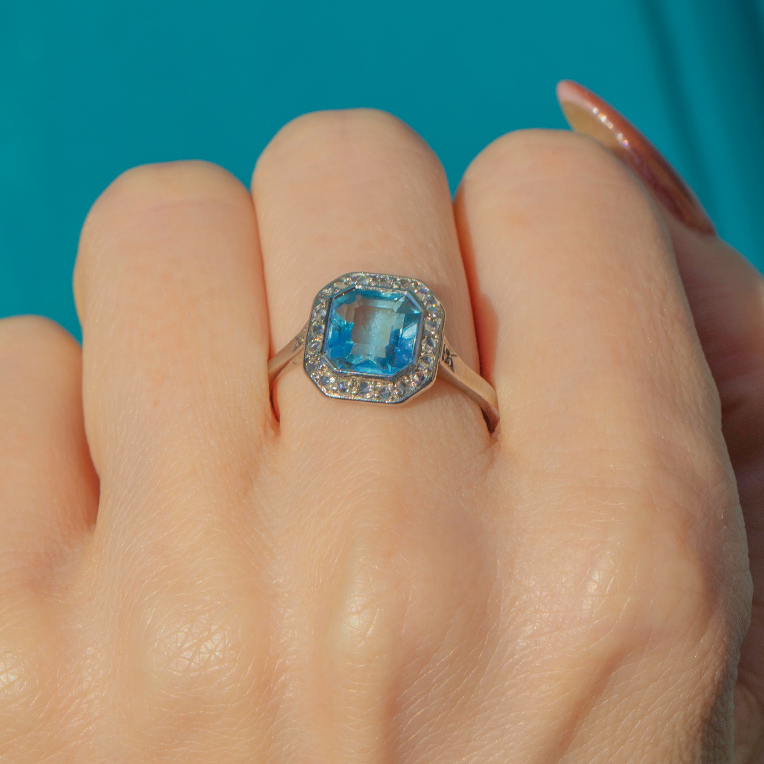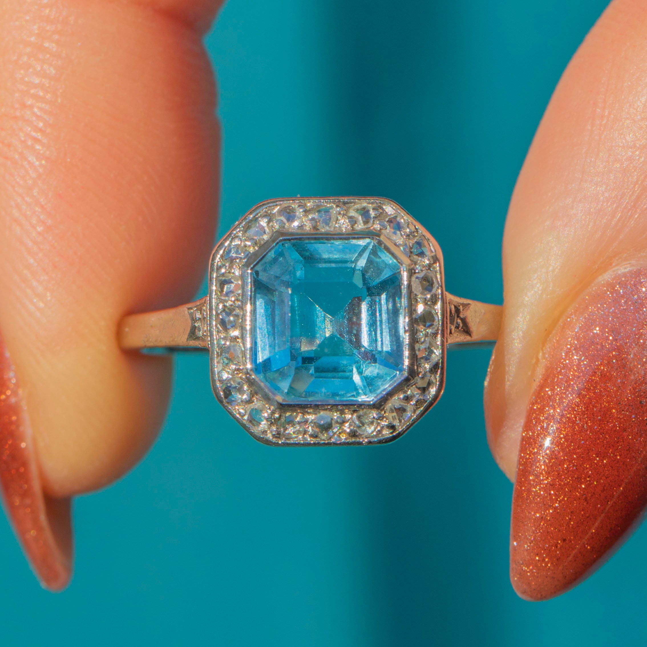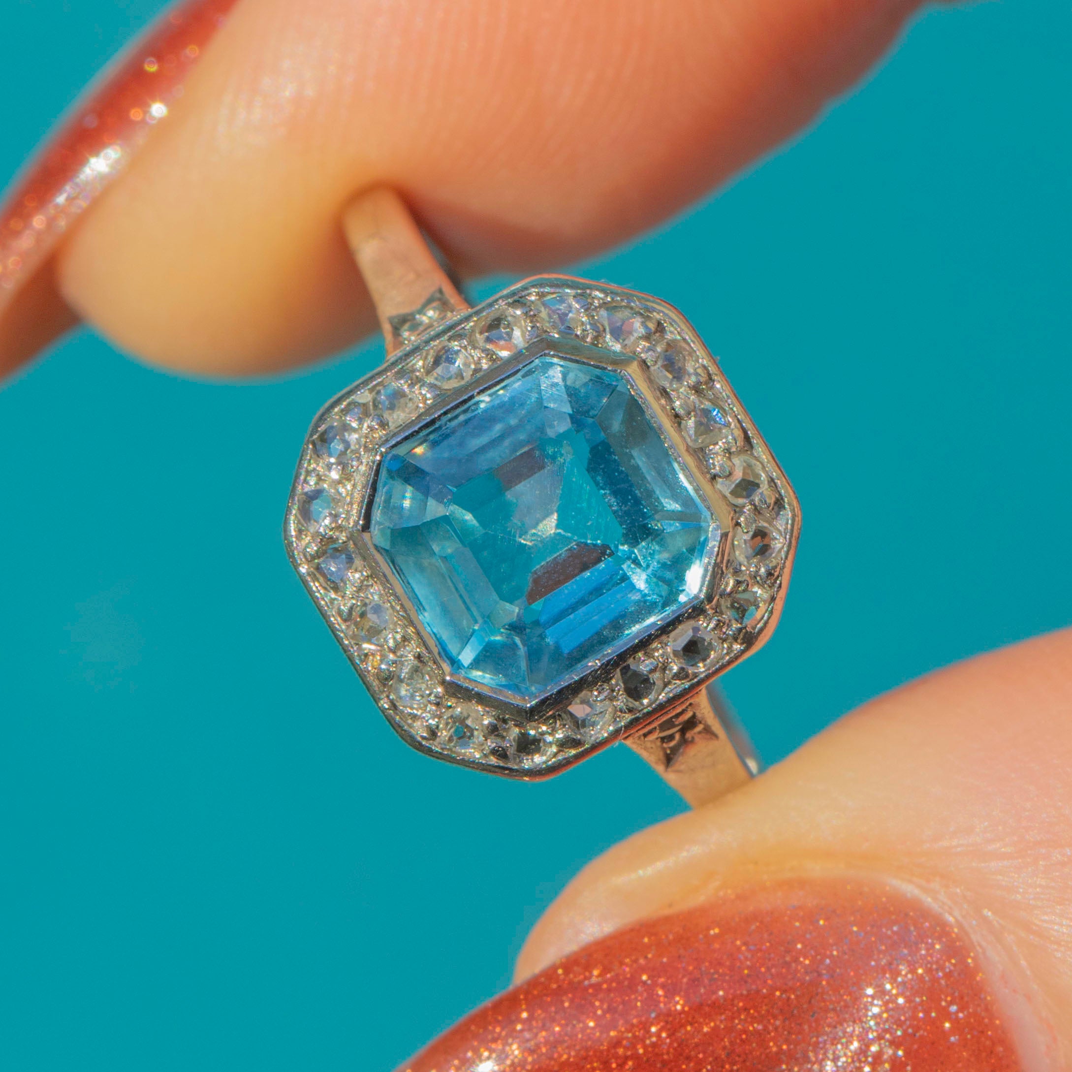 We are delighted to present this Edwardian 14ct Gold Aquamarine Diamond cluster ring! The ring is home to a 1.30ct icy blue Aquamarine, surrounded by sparkling rose-cut Diamonds that give this piece a princess-like feel.