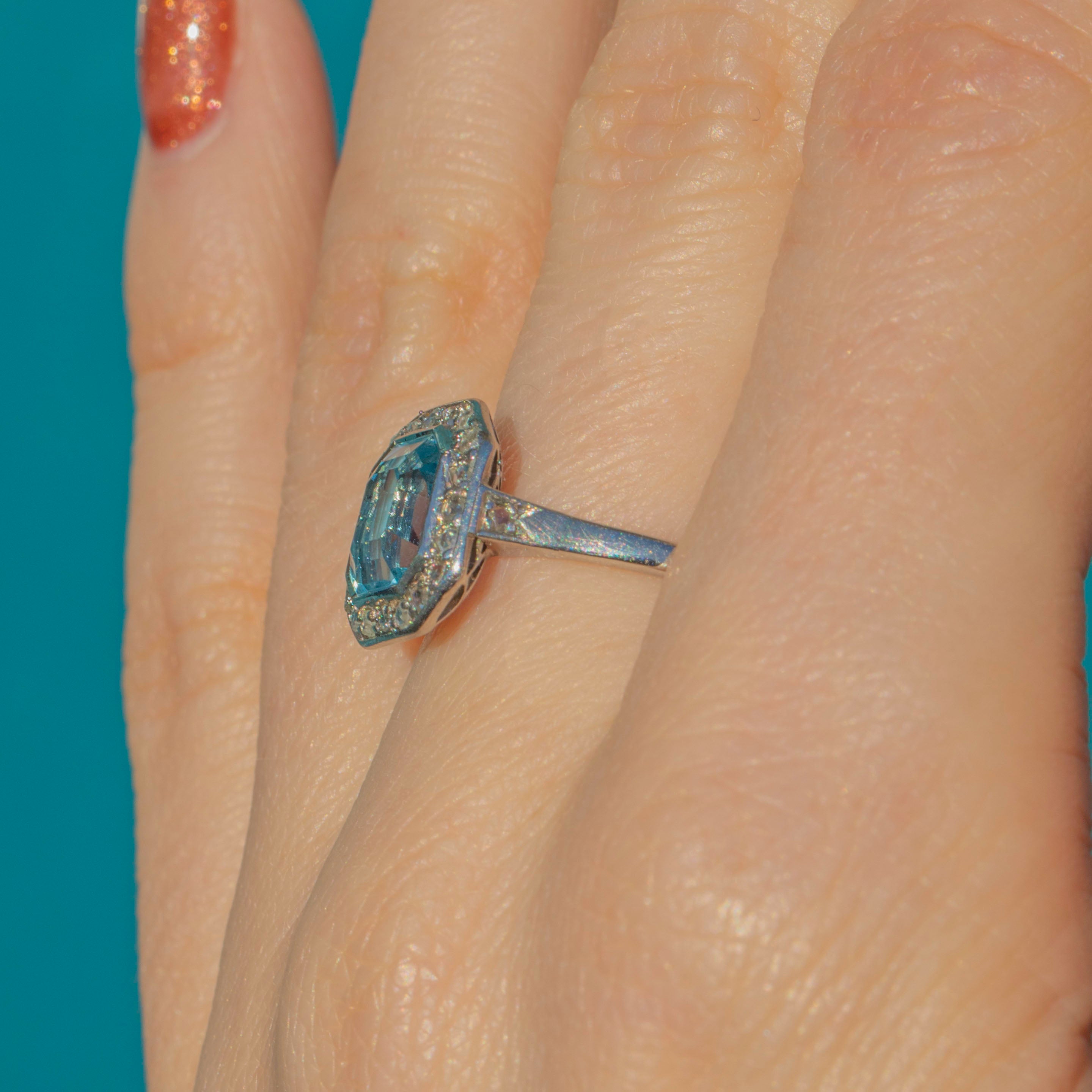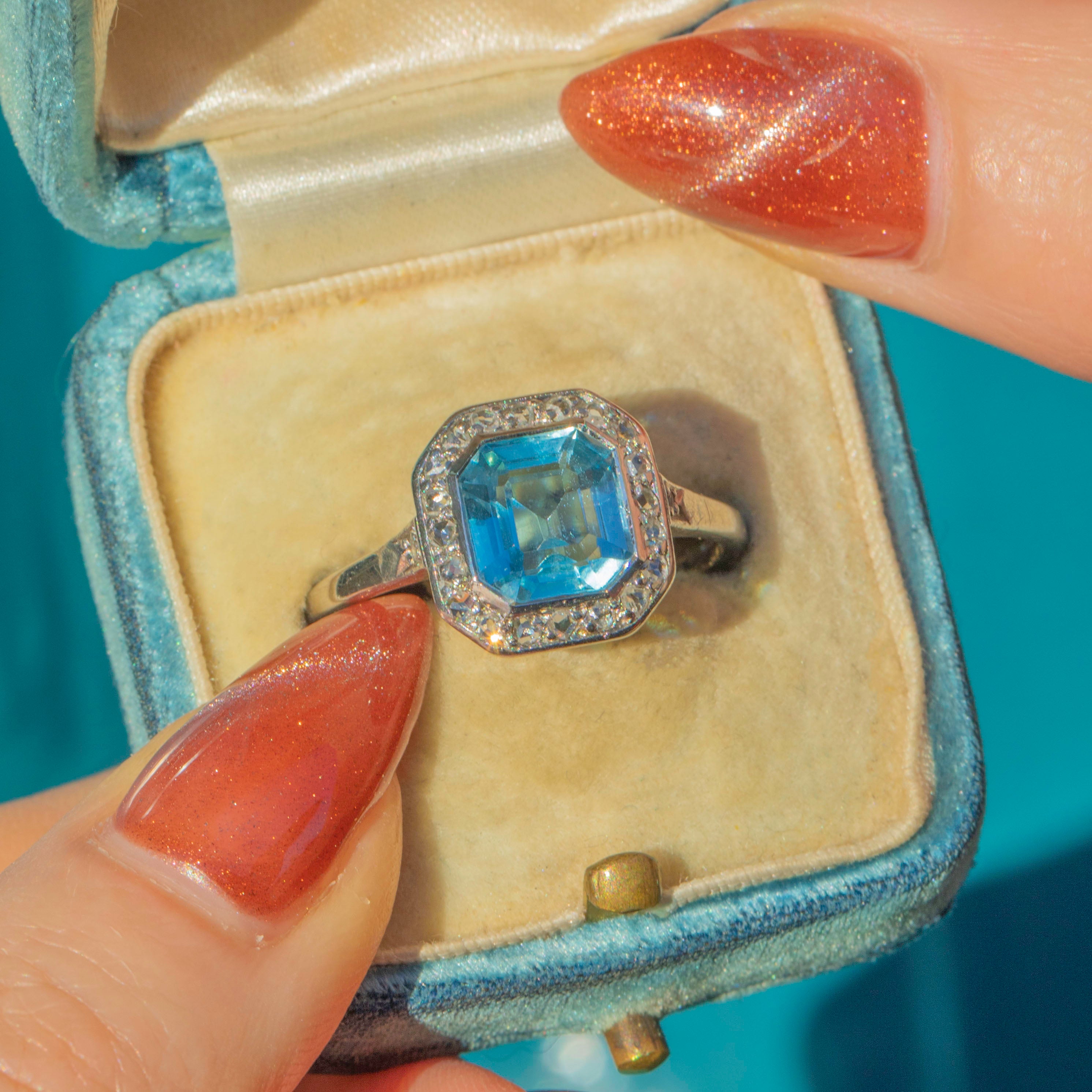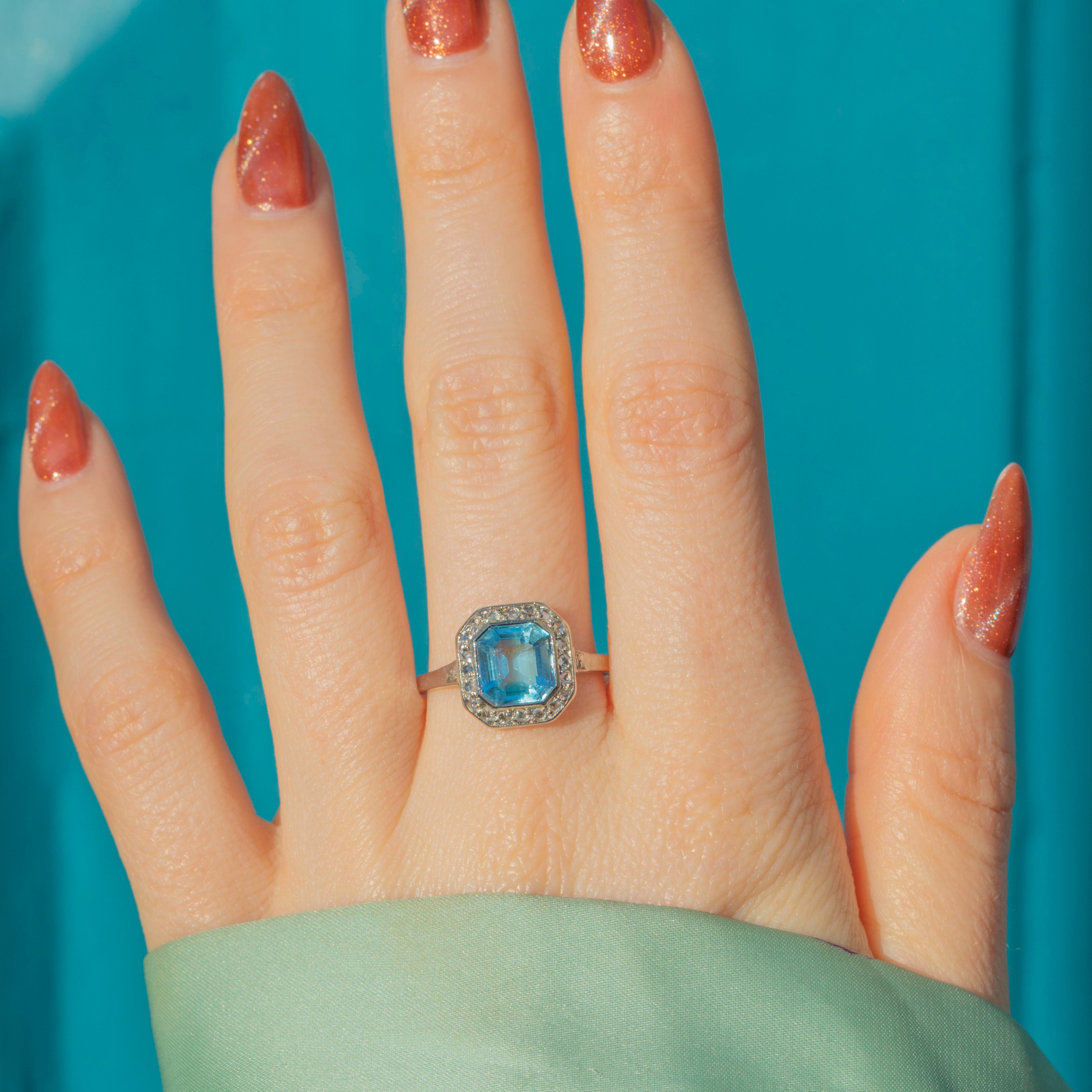 We are delighted to present this Edwardian 14ct Gold Aquamarine Diamond cluster ring! The ring is home to a 1.30ct icy blue Aquamarine, surrounded by sparkling rose-cut Diamonds that give this piece a princess-like feel.