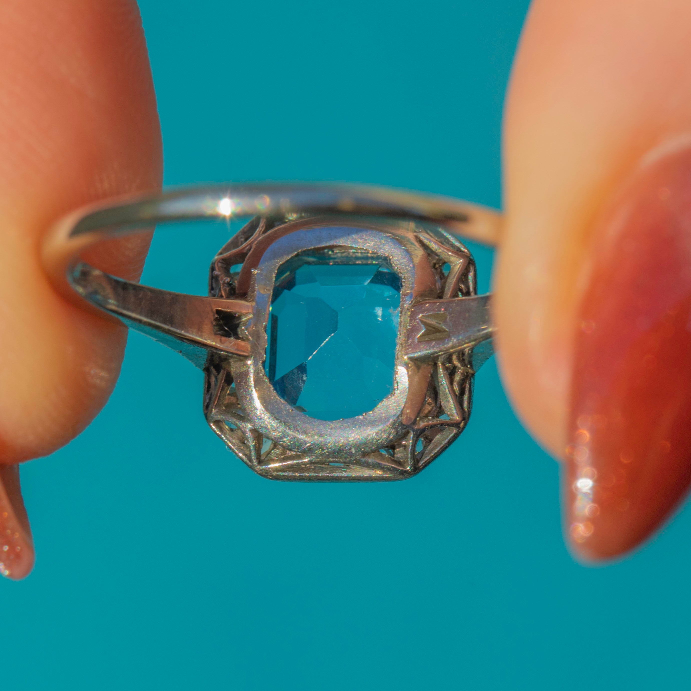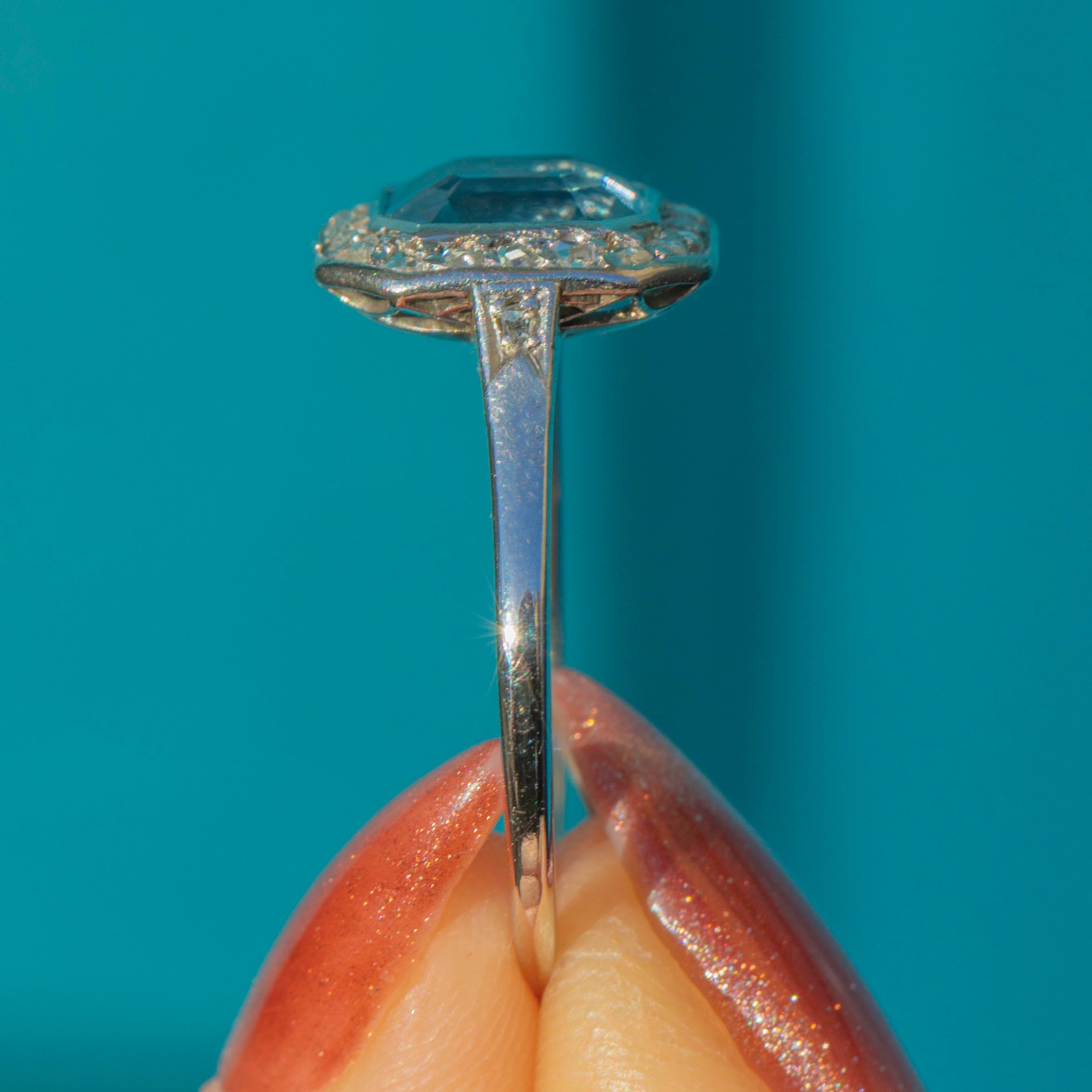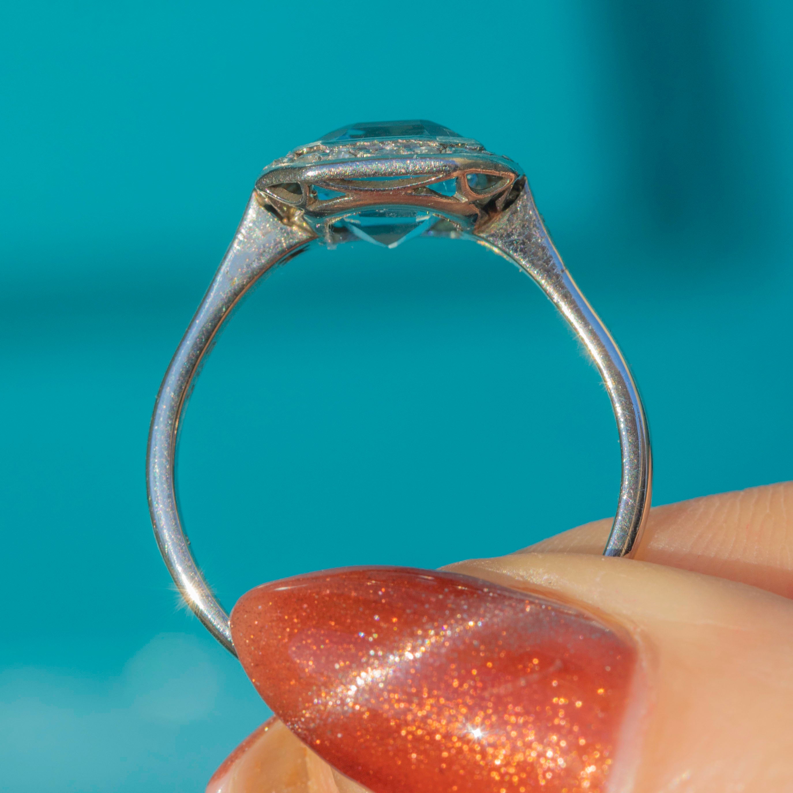MATERIALS: Tests as 14ct White Gold with Platinum settings, Aquamarine (1.30ct), Rose-Cut Diamonds.