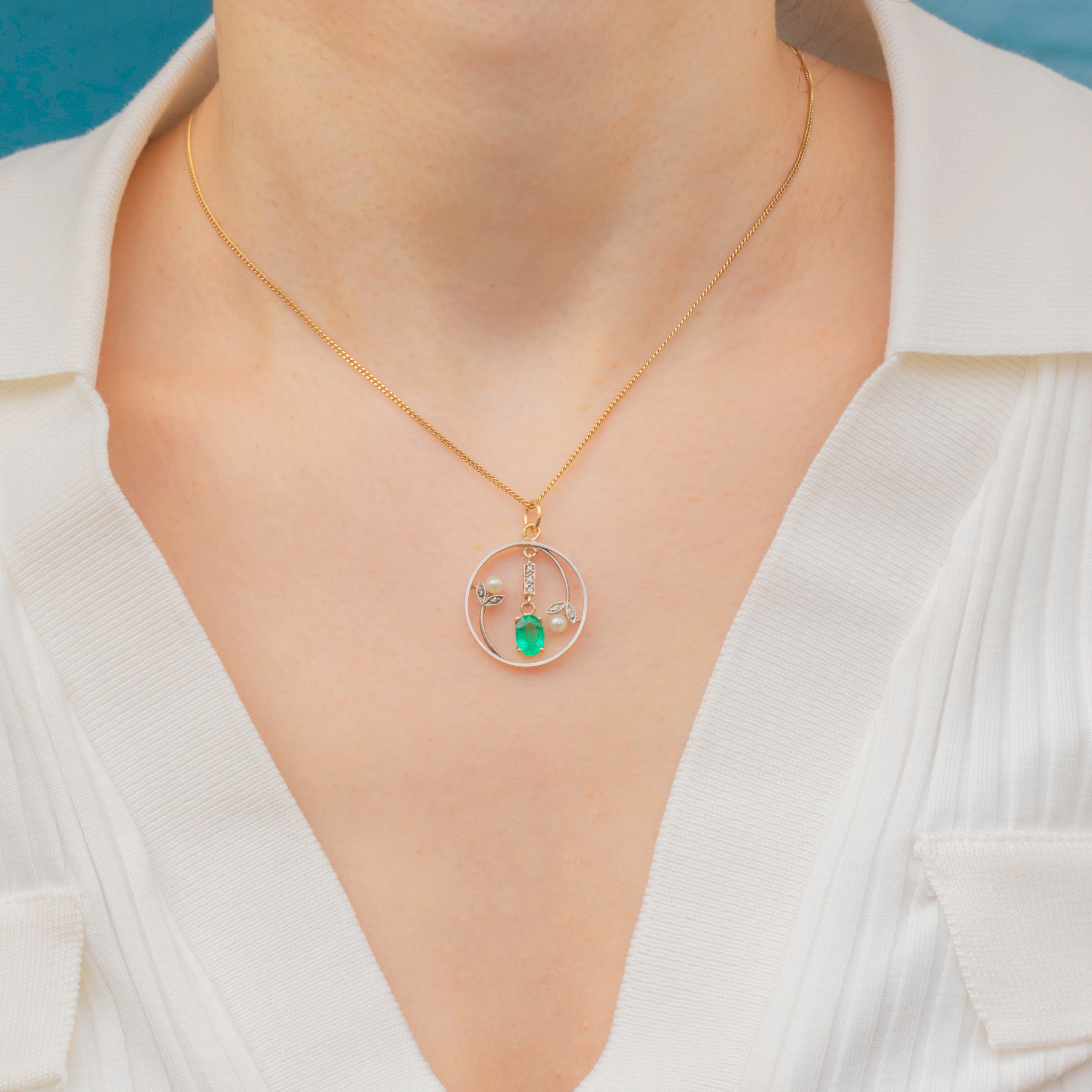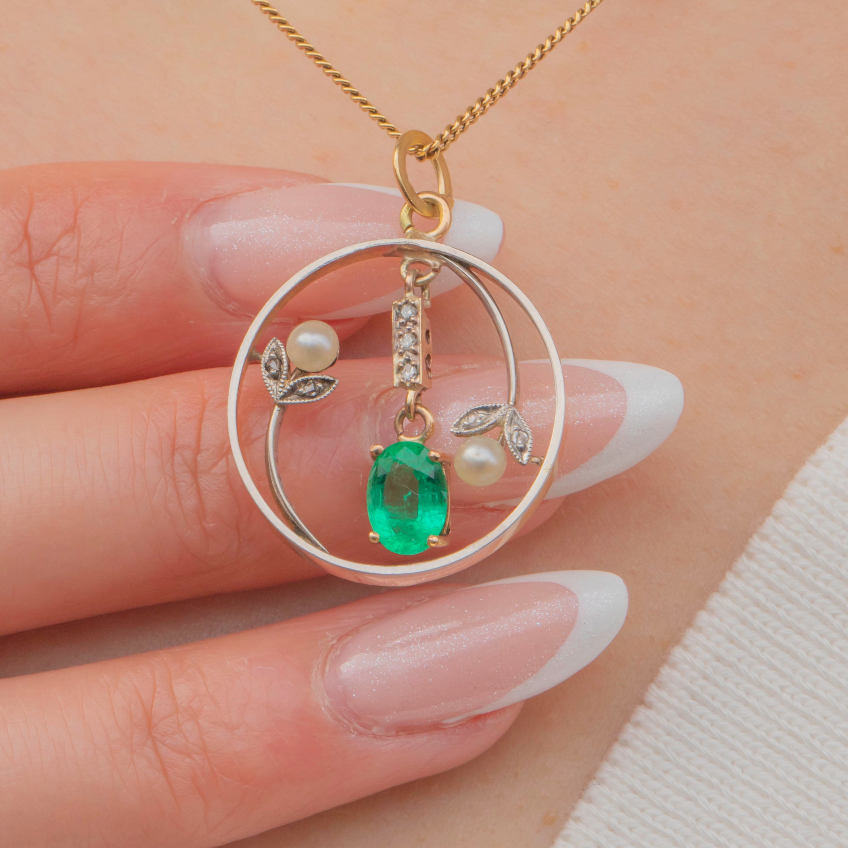 This striking Edwardian 15ct Gold Emerald Diamond flower pendant exudes feminine charm! Finely crafted from 15ct Gold and Platinum, the classically Edwardian roundel form displays an exquisite selection of gemstones, with its 0.46ct Emerald bound to grab your attention.