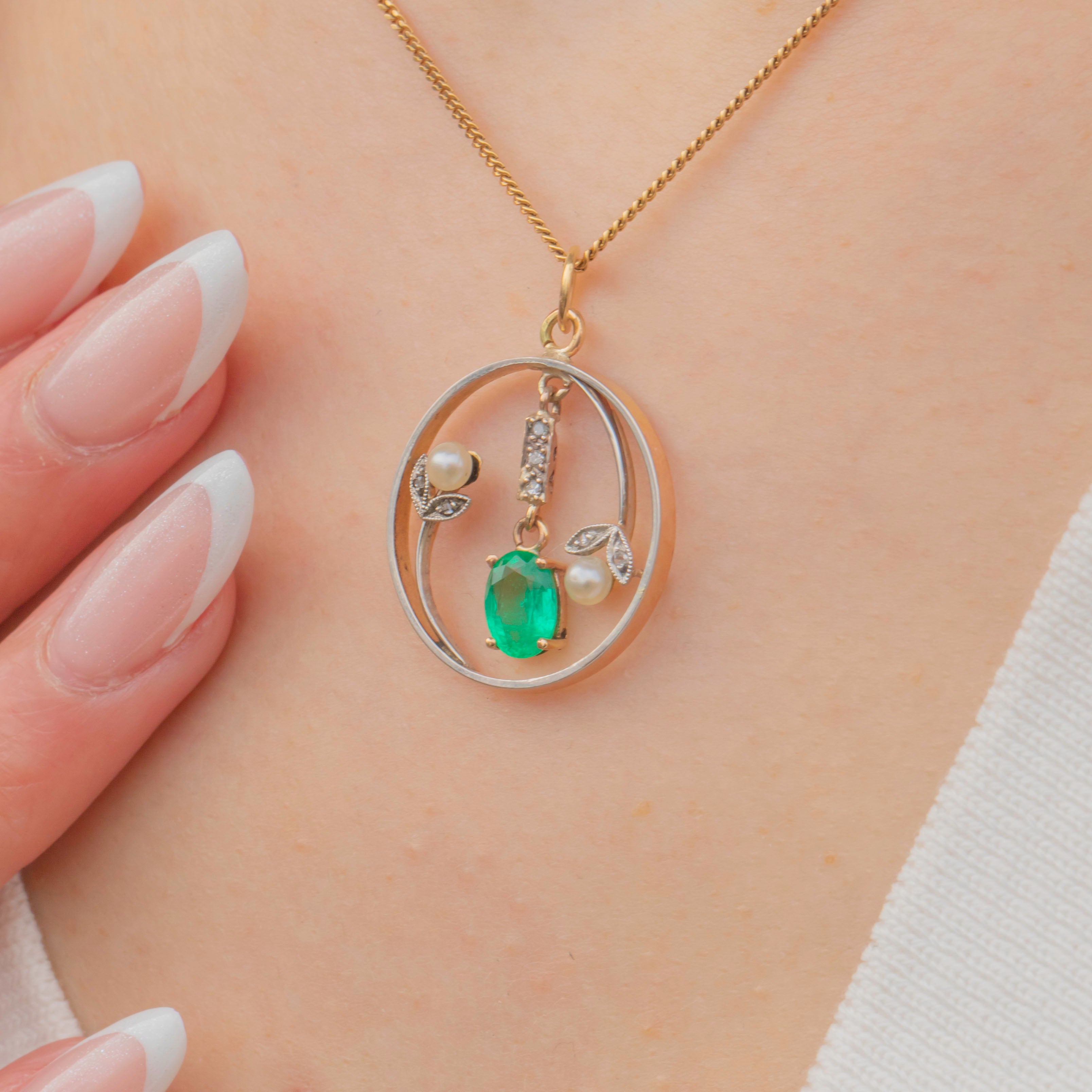 The vibrant grass-green Emerald is suspended from a Diamond-encrusted bar drop, providing this piece with lovely movement. Two floral forms curve elegantly around the central drop, their petals fanning out to display a linen white Pearl resting on top. With a unique and graceful design, this Edwardian pendant will make a standout addition to your collection!