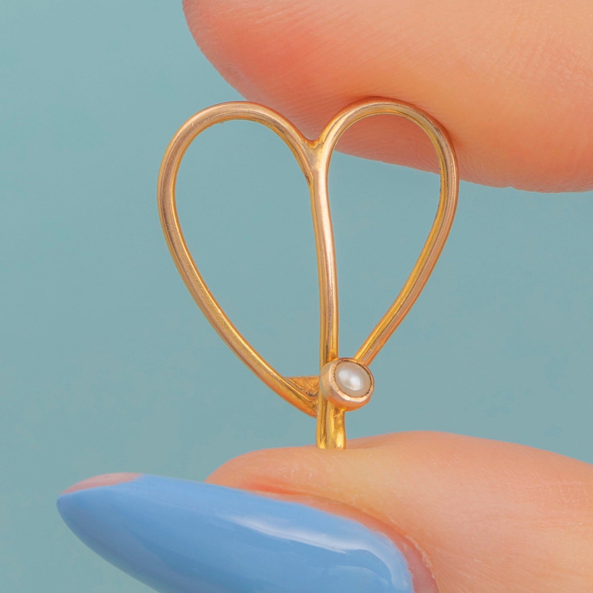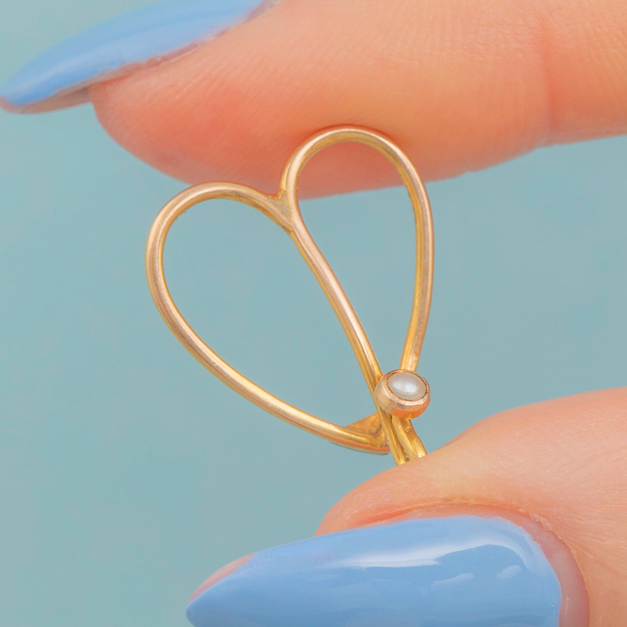 EXCELLENT. This Edwardian 15ct Gold heart slider pendant is in excellent condition. The pendant has retained its form well and the Gold is luscious with lovely reflective qualities. The Pearl is securely set and free from visible surface wear with its nacre fully intact. The 15CT stamp is clear and adds to this pendant's antique charm!