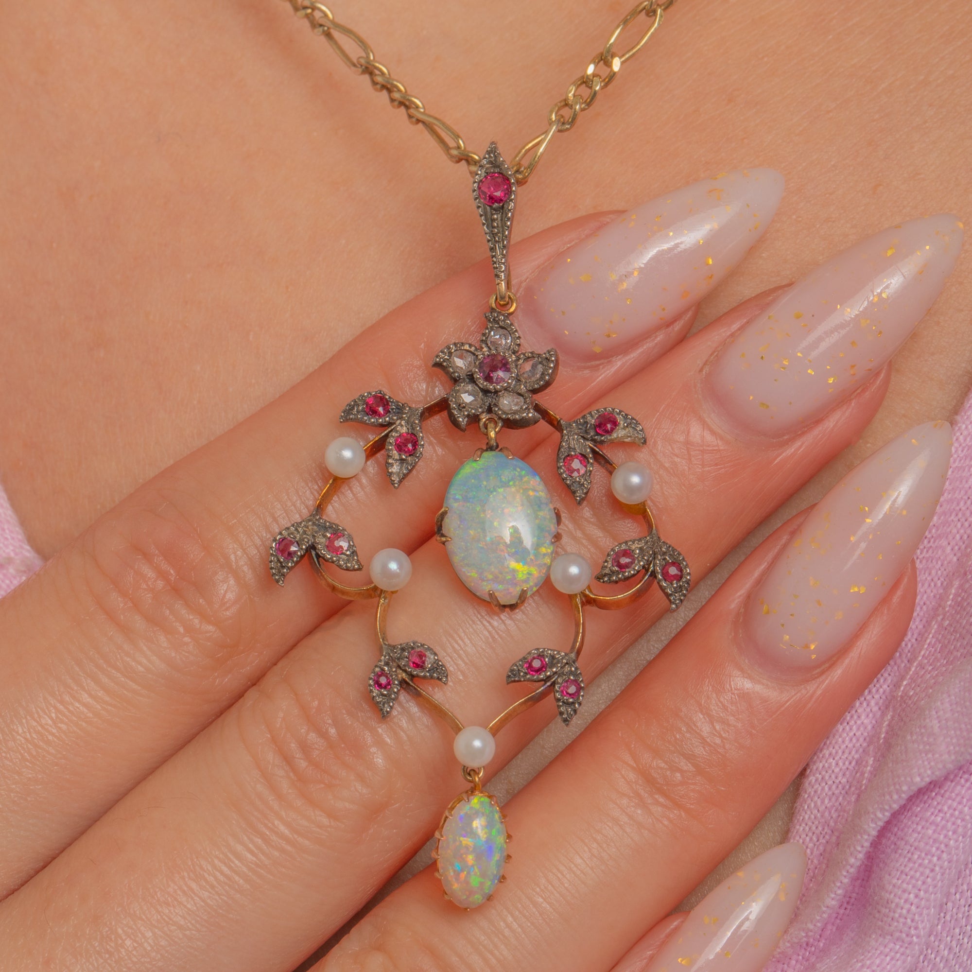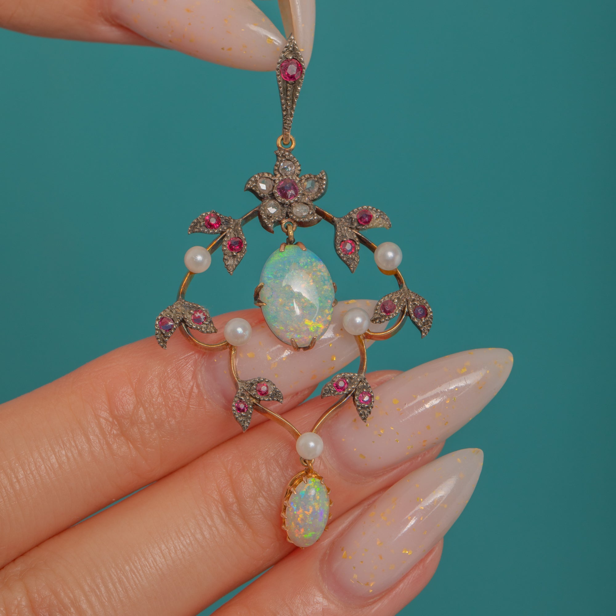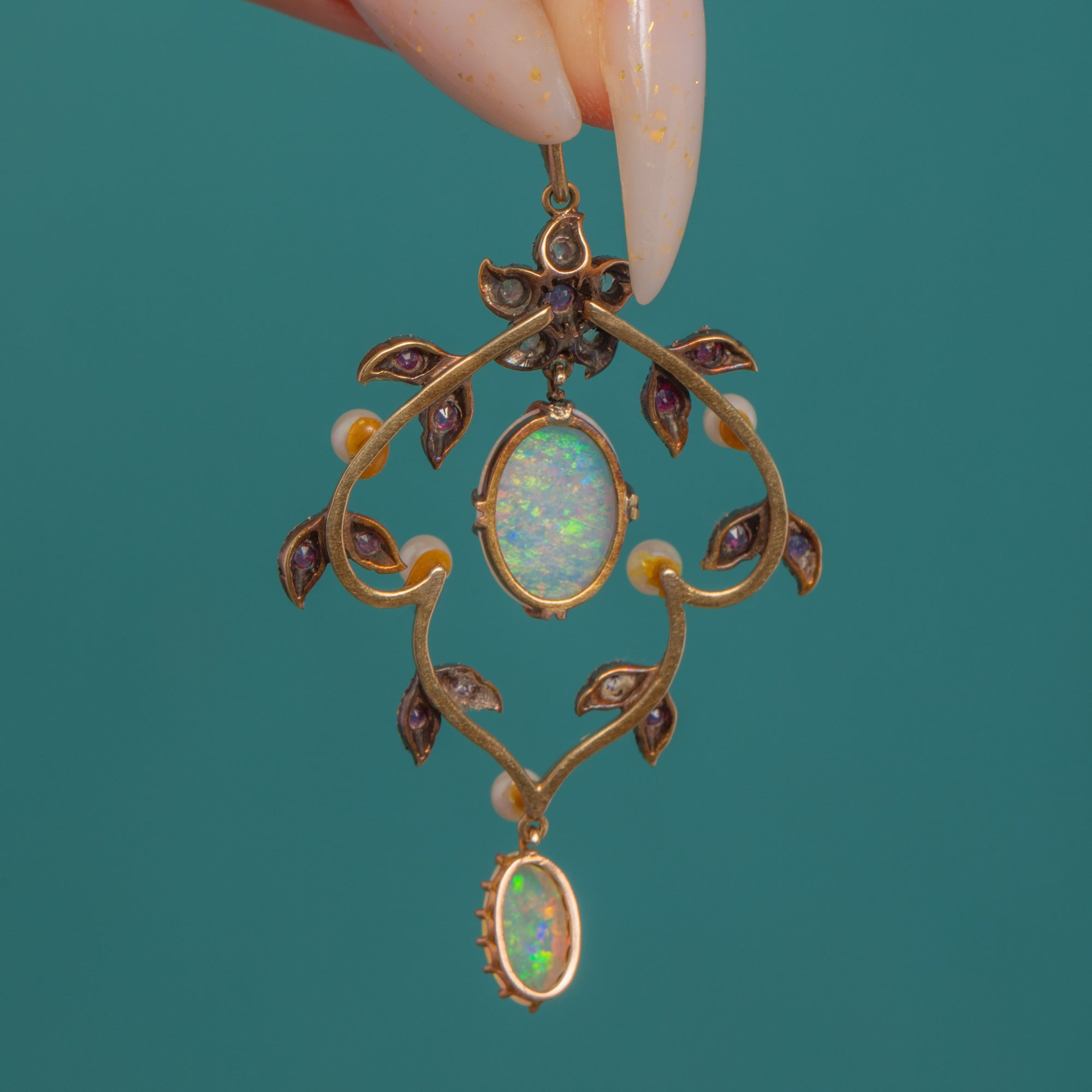 A dreamy Edwardian lavalier pendant, sculpted in 15ct Gold with Silver settings, its openwork foliate garland alive with delicate milgrain and pavé details. Two luminous Opal cabochons take centre stage, their milky bodies flashing blue, green and ember-orange, framed by twinkling Diamonds, vivid Ruby accents and tiny creamy Pearls.