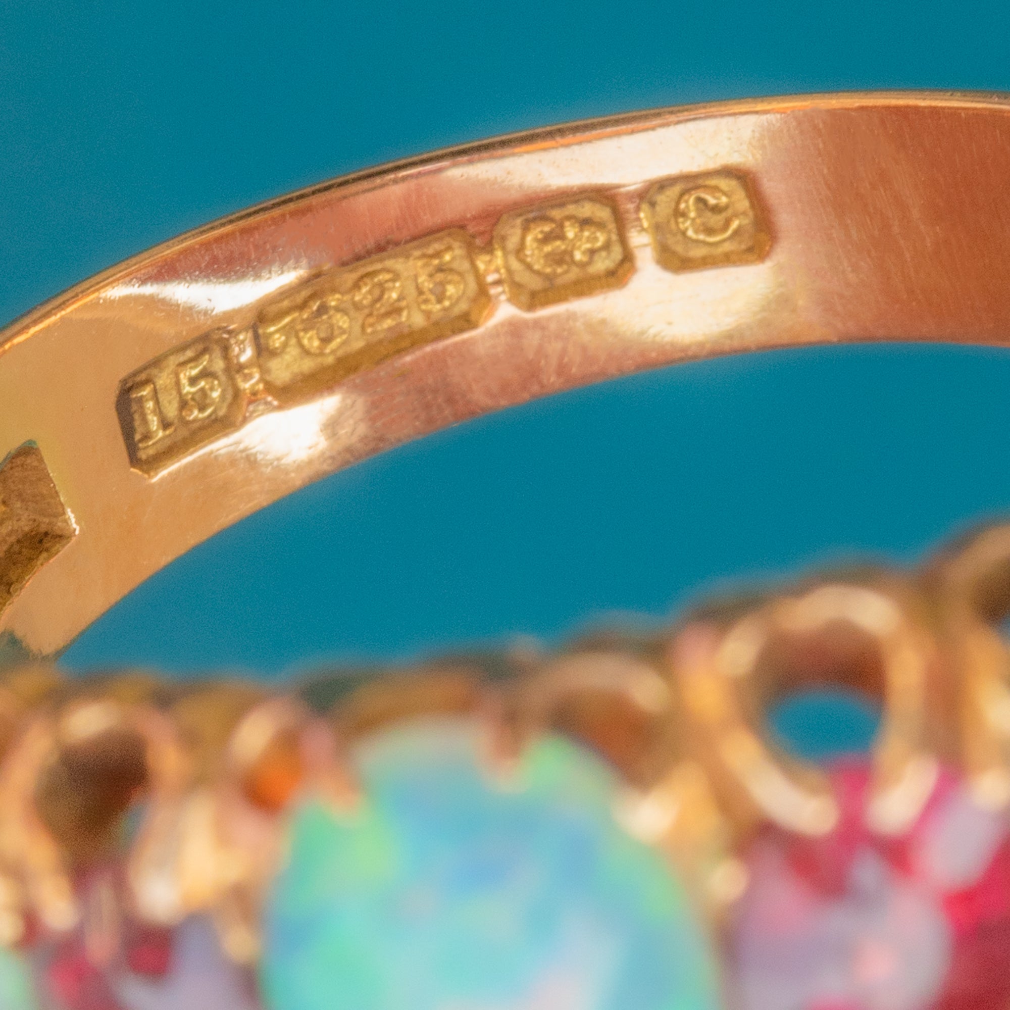 A resplendent antique ring, adorned by iridescent Opals and a vibrant Garnet, and Ruby to create a classic five stone ring. Each Opal projects a magical kaleidoscope of blues and greens, contrasted beautifully by the saturated fuchsia tones of the Ruby (right, hallmark facing) and Garnet (left, hallmark facing), all set in glossy 15ct Gold.
