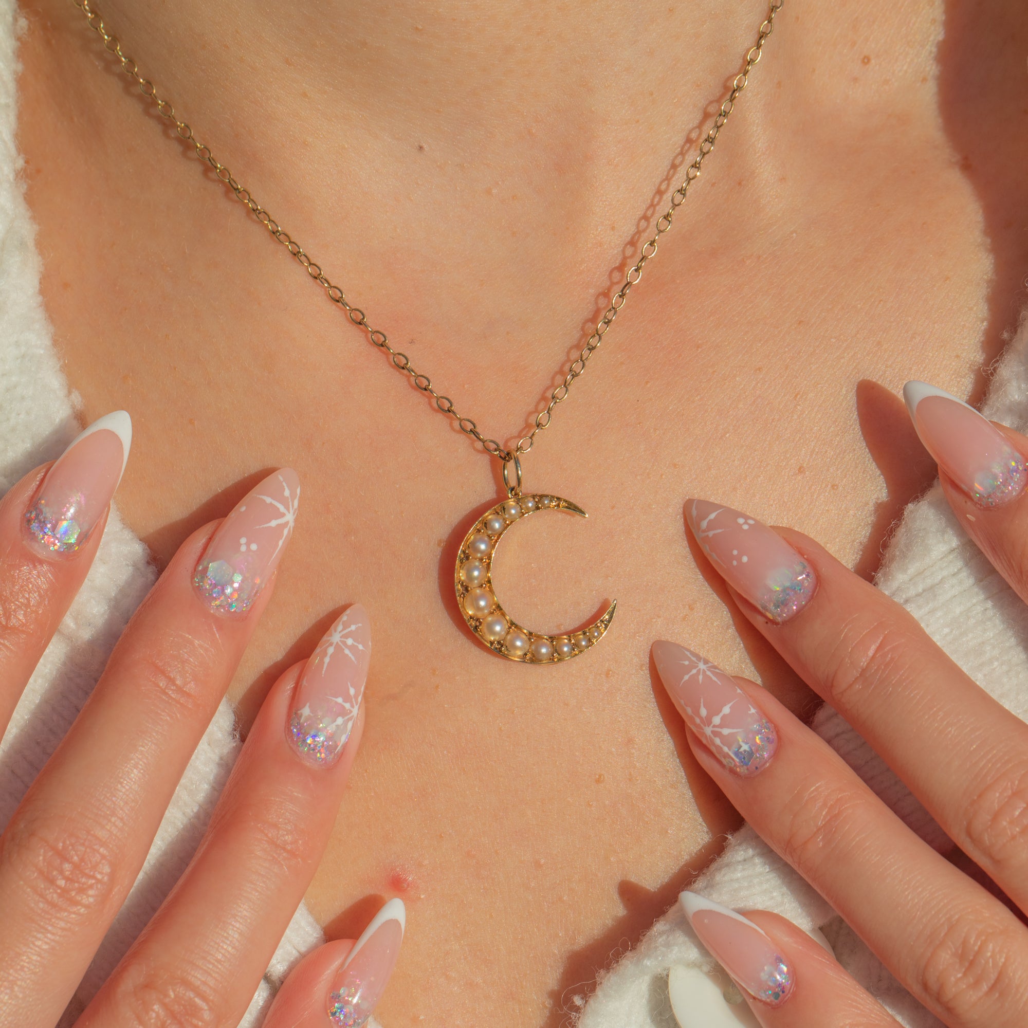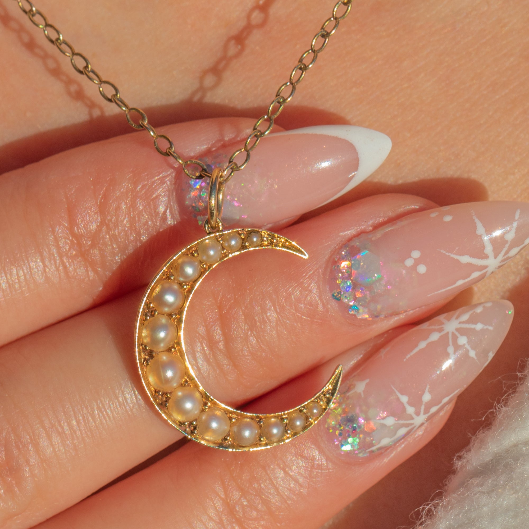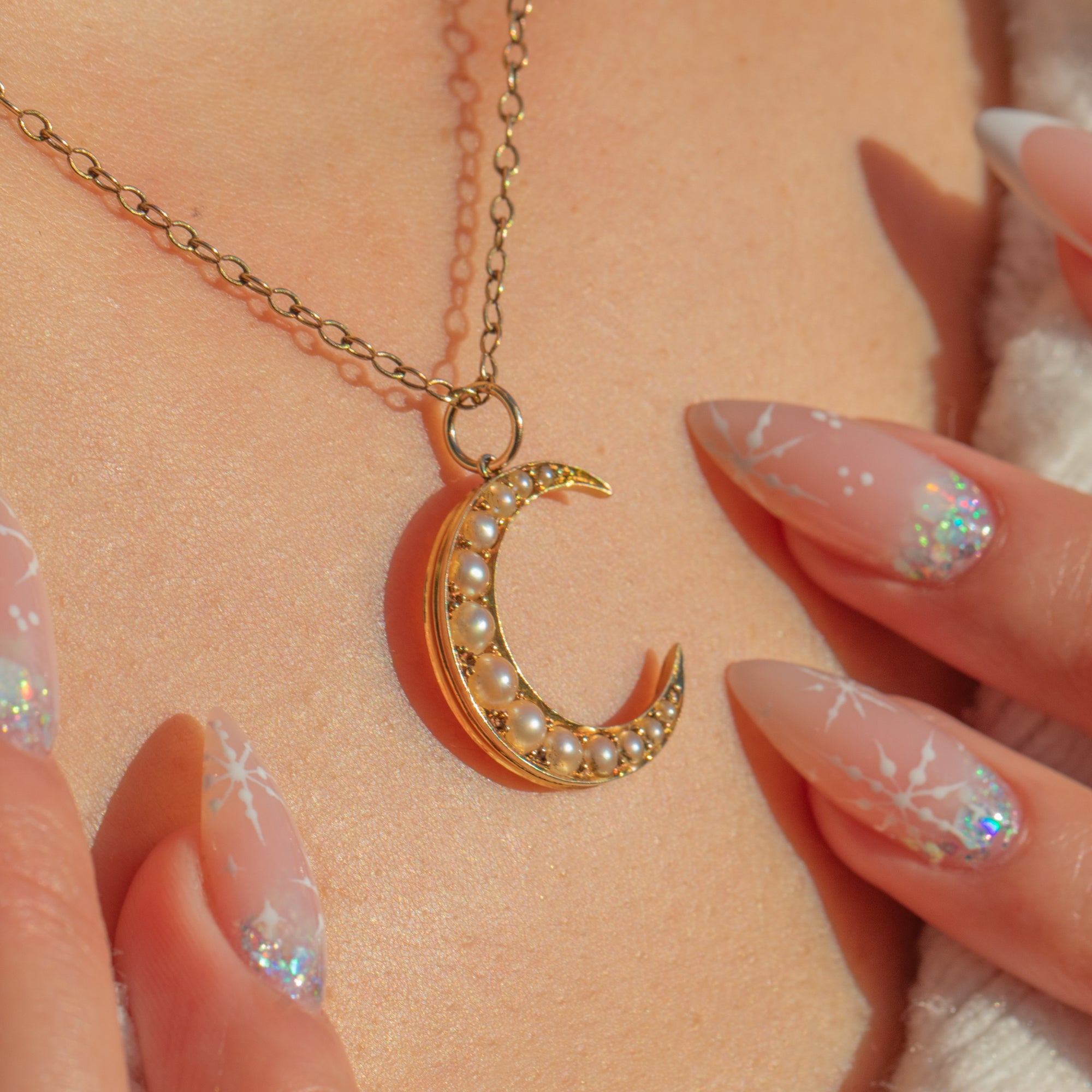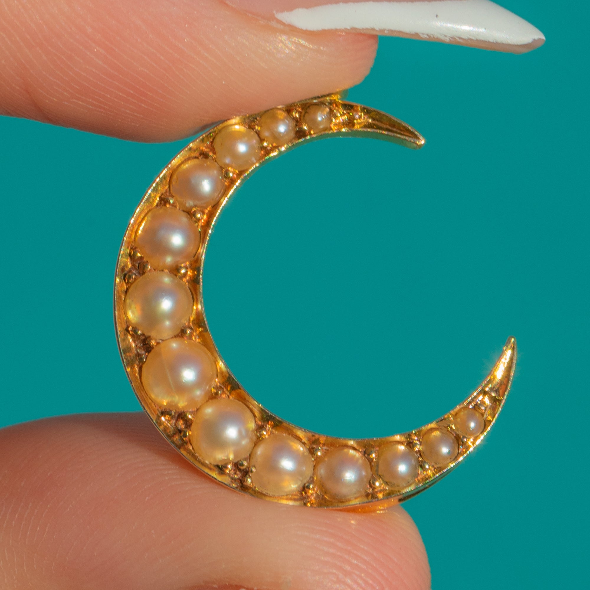 VERY GOOD: The Pearls are all original with no damaged or replaced stones, well-matched in colour and lustre. The Gold shows light surface wear consistent with age, with subtle evidence on the reverse of its former lace-pin fitting; settings are secure and the crescent presents beautifully from the front. Overall, a well-cared-for antique charm with gentle, age-appropriate wear.