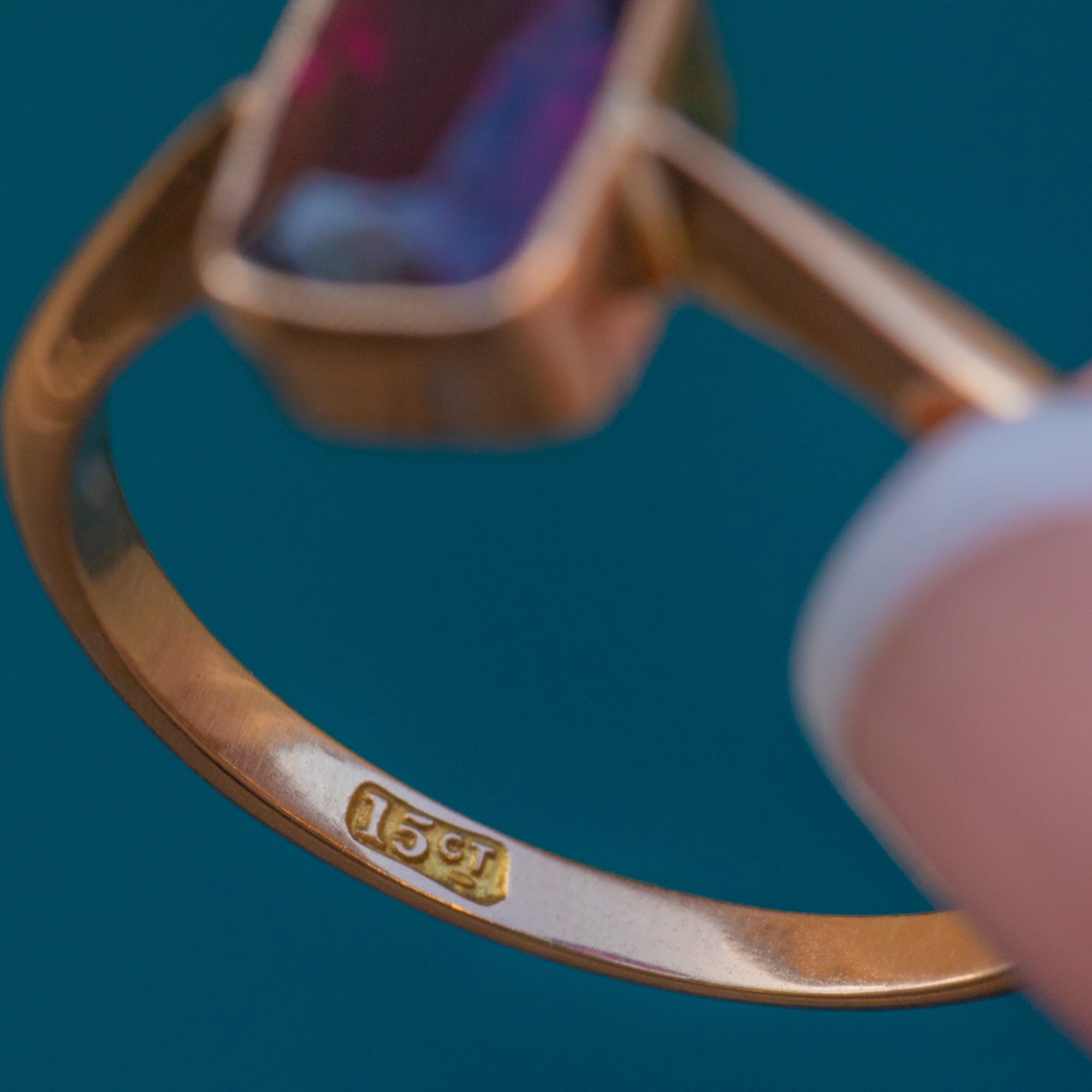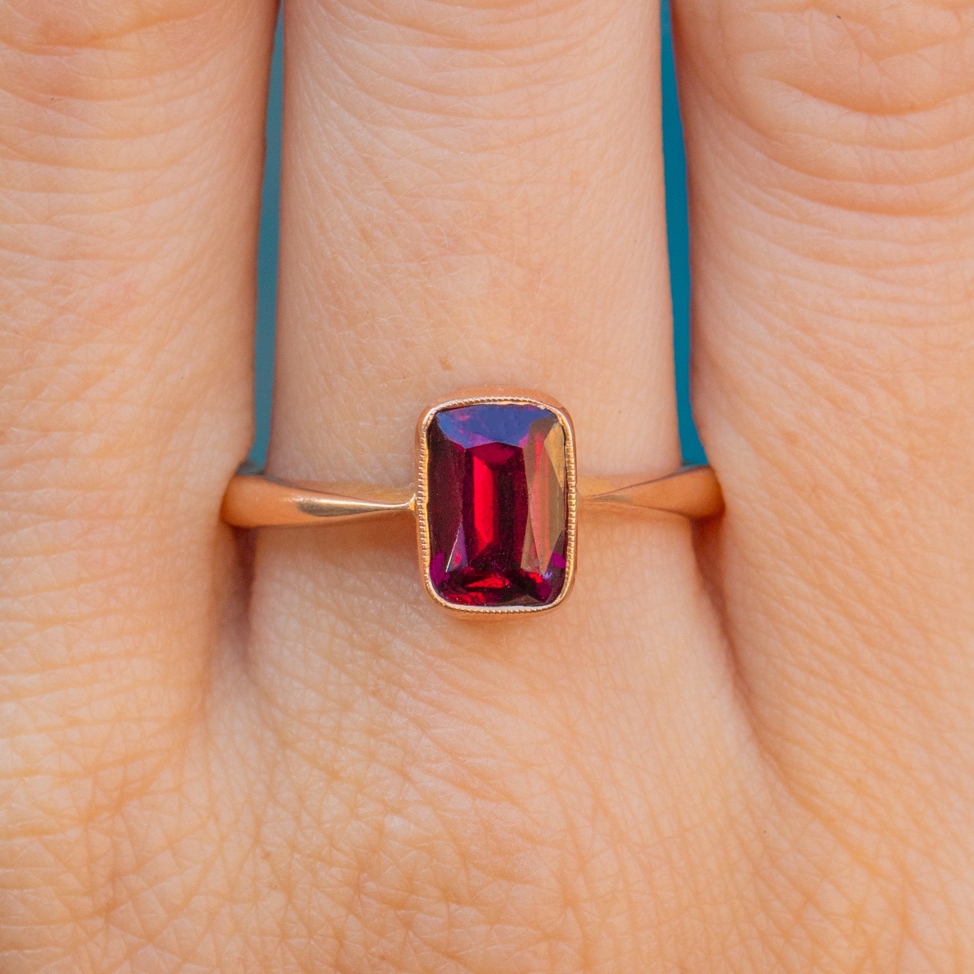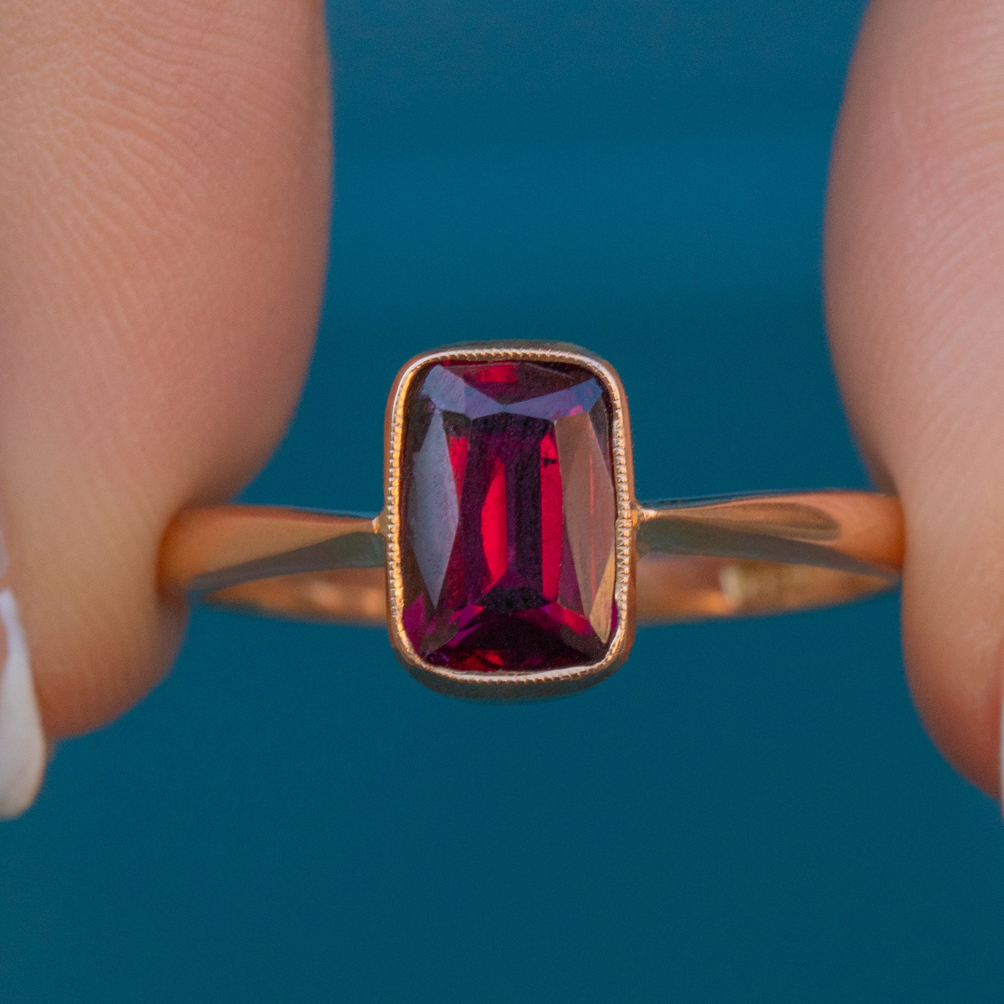Step back in time with this Edwardian 15ct Gold Rhodolite Garnet ring. Crafted from sumptuous 15ct Gold, she is a delectable little treasure that is both eye-catching and elegant, she is a spellbinding sensation!