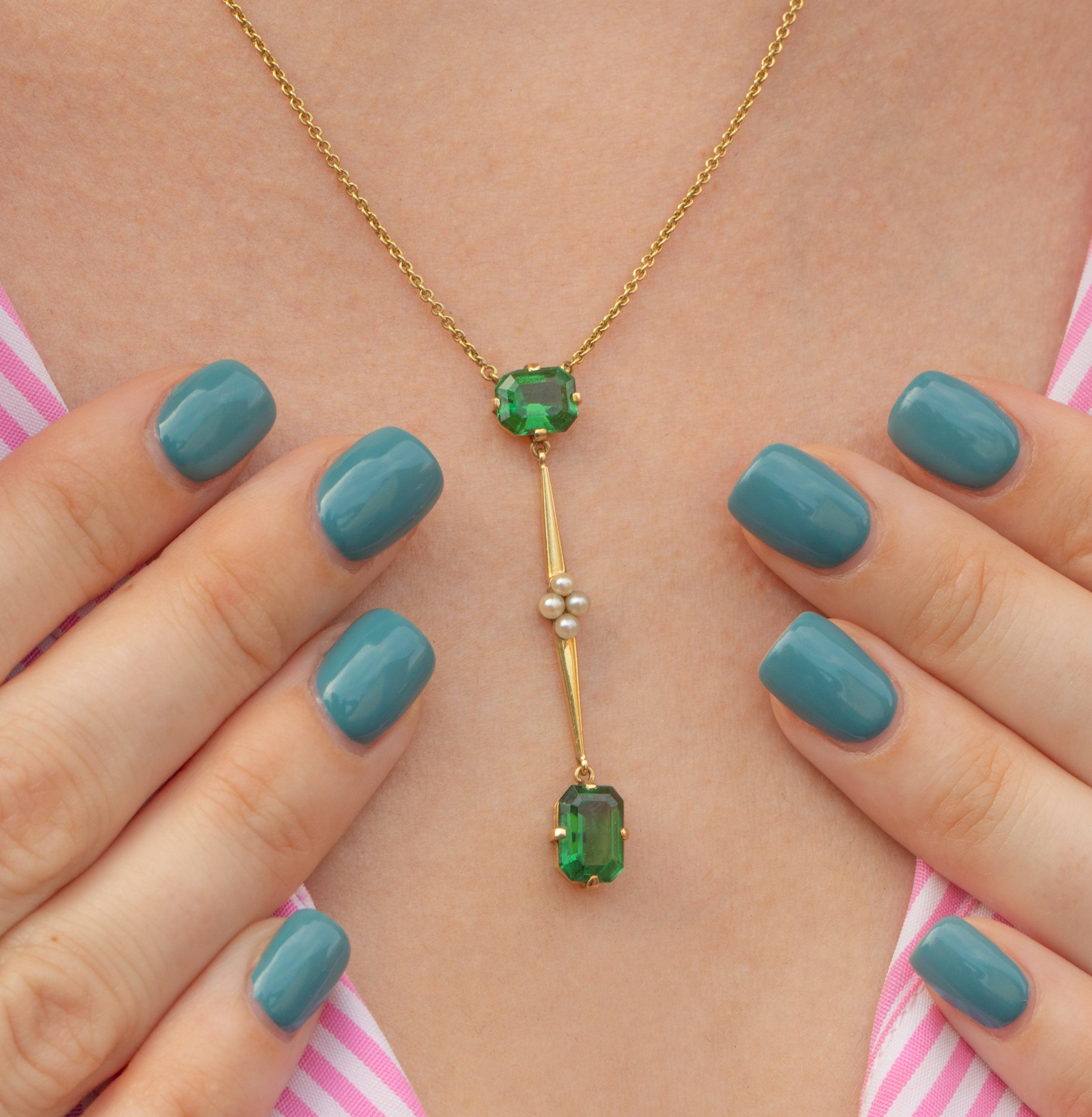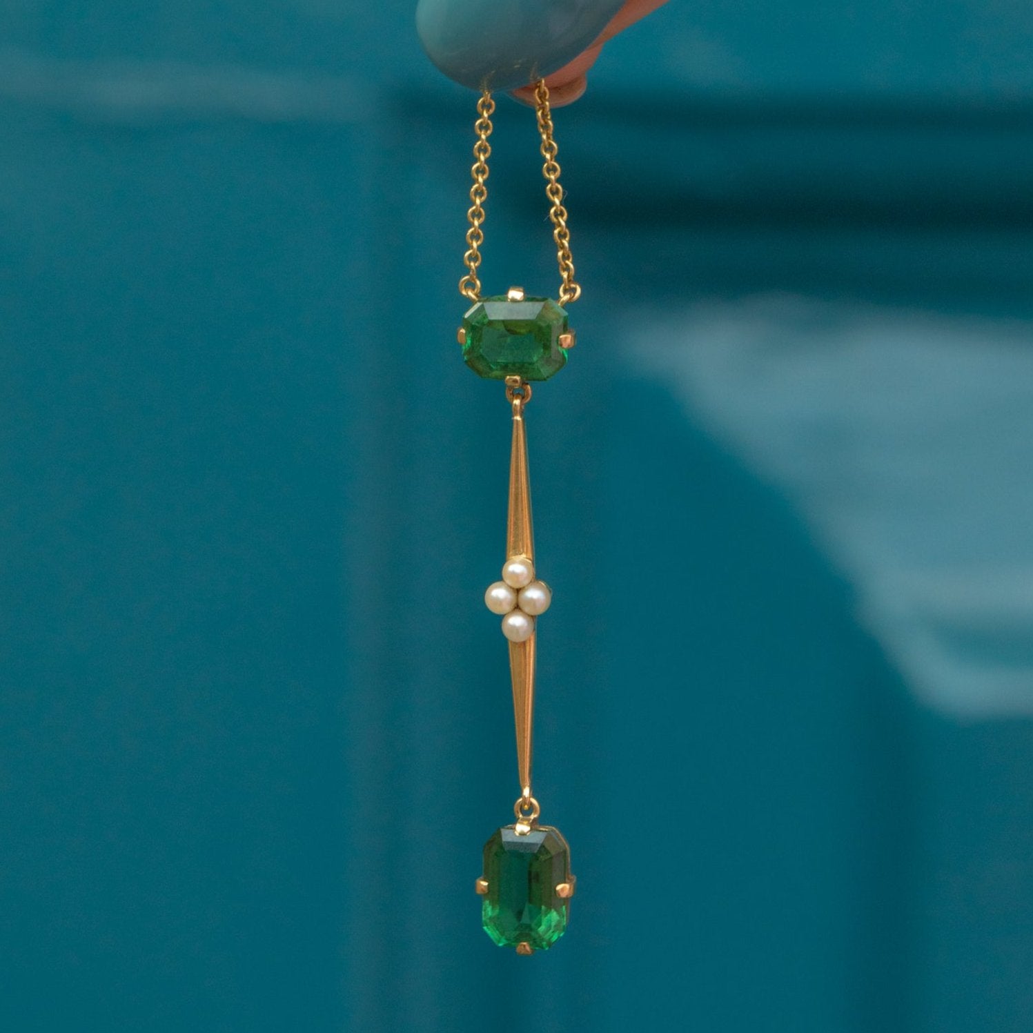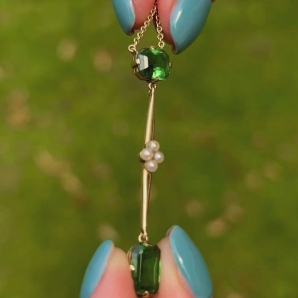 This Edwardian 15ct Gold Green Tourmaline Pearl drop necklace is an exquisite display of craftsmanship! Boasting two delightful luscious green Tourmalines and a cluster of glossy Pearls suspended from a 16" chain, this Edwardian pendant will drape beautifully against your décolletage.