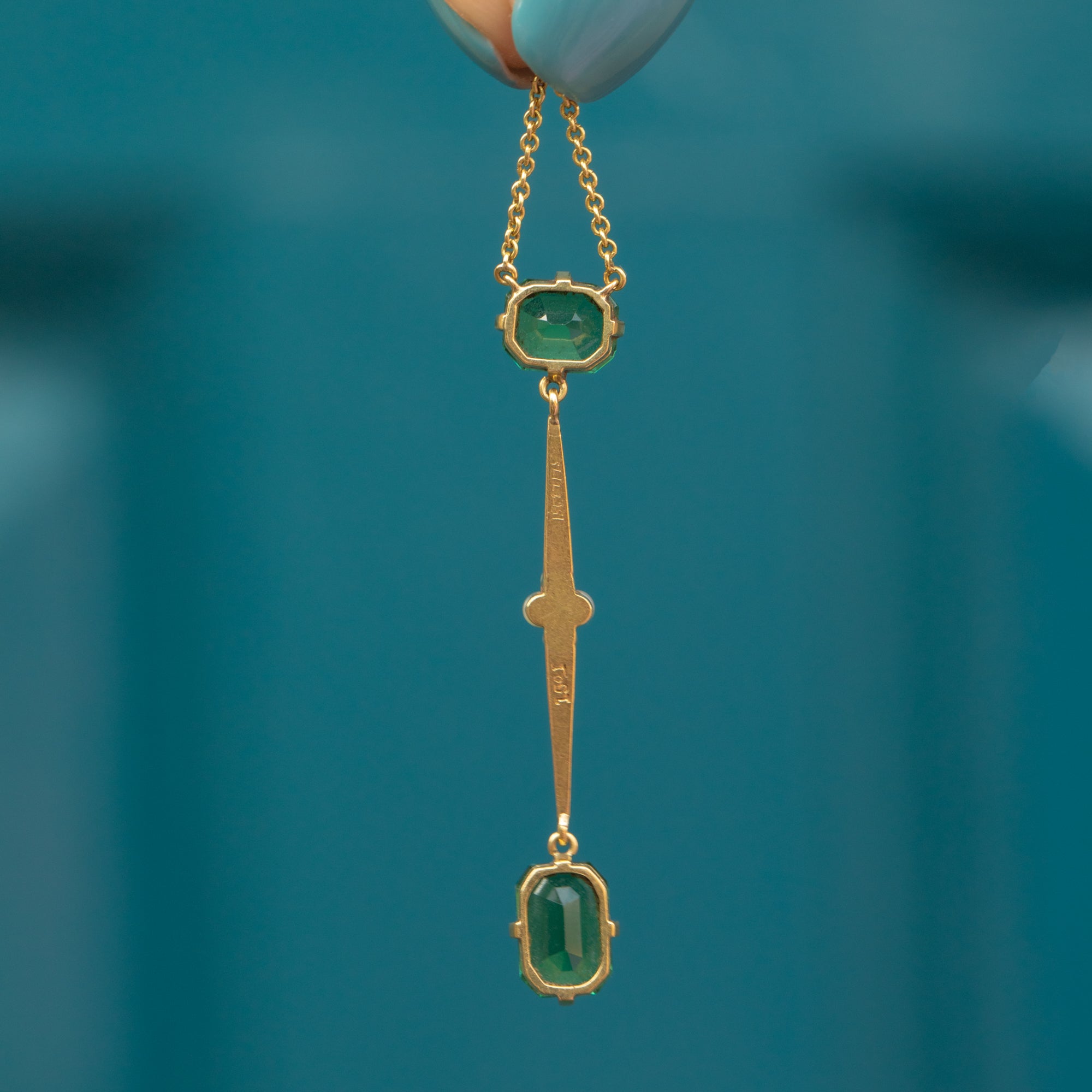 EXCELLENT. This Edwardian 15ct Gold Tourmaline Pearl drop necklace is in excellent condition. The deep green Tourmaline and Pearls are all set securely, free from any signs of wear. She has a clear 15ct Gold stamp on the back of the pendant as well as the hand-engraved numbers '1557175' which are only visible under the inspection of a loupe. Her 18ct Gold chain closes securely with use of the bolt ring, allowing for confident wear!