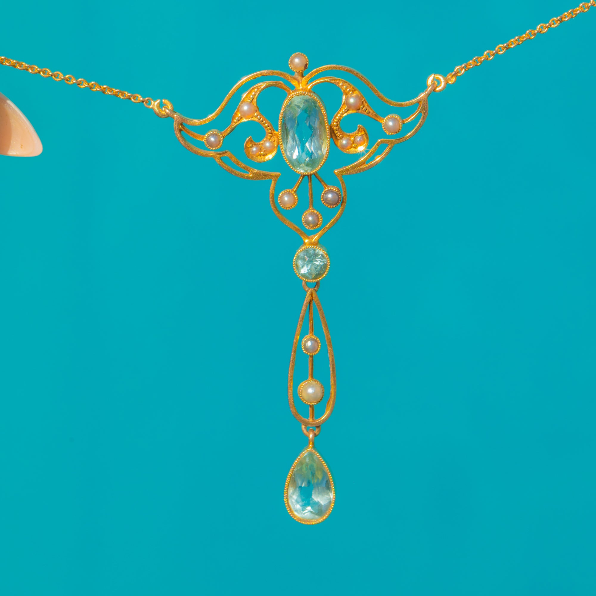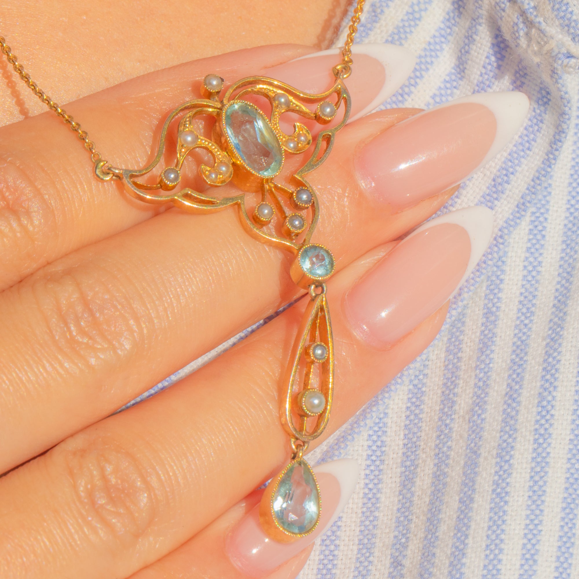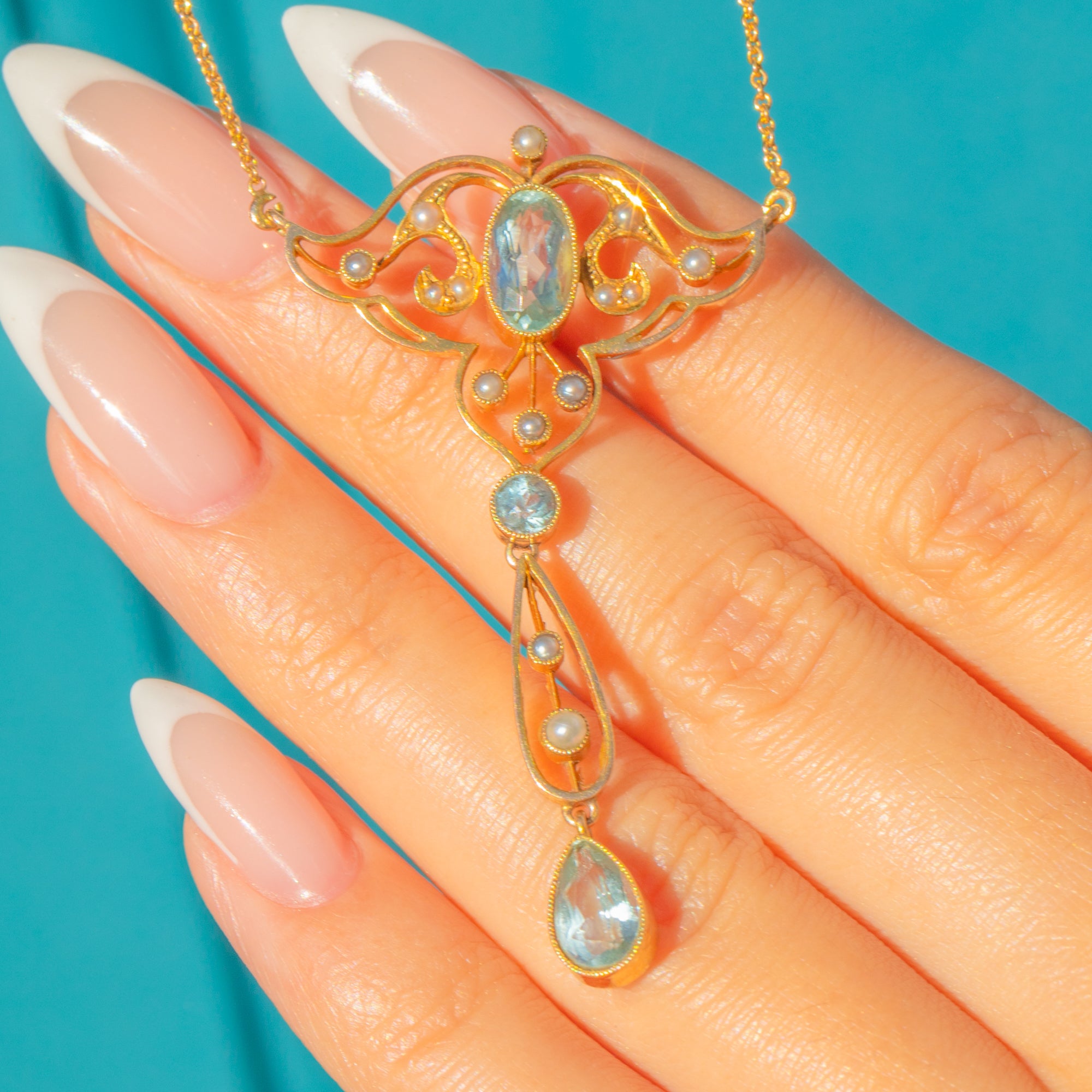 This exquisite Edwardian lavalier necklace is finely crafted in 18ct Gold and set with Aquamarines and Pearls. The flowing openwork design showcases the elegance and delicacy so typical of the period, with a soft feminine palette of sky-blue gems and creamy natural Pearls.