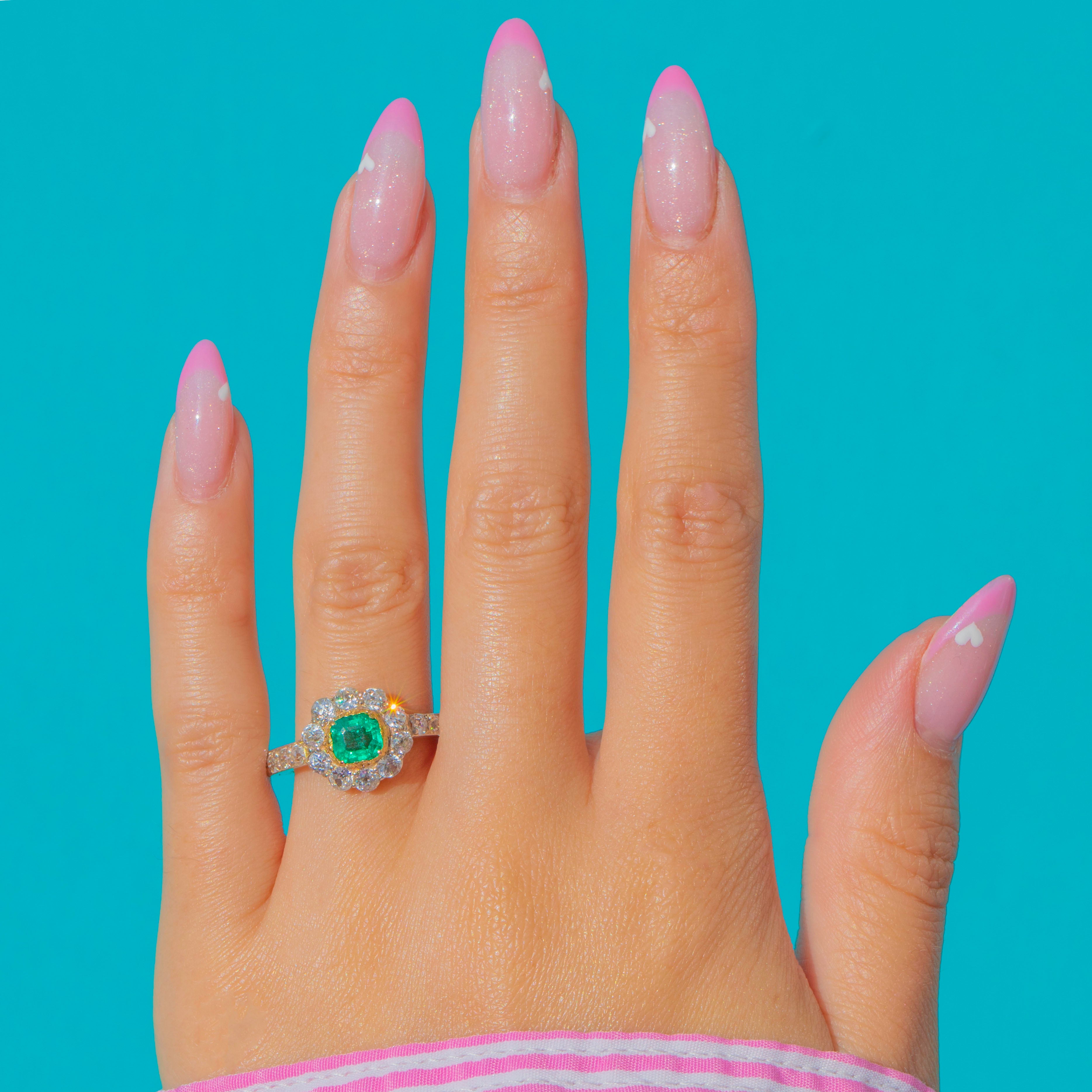 EXCELLENT: The Emerald is richly coloured with fine clarity and minimal natural inclusions. Diamonds are bright, well-matched and securely set. The Gold and Silver retain a beautiful antique polish, with no thinning or wear to the band. A superbly preserved Edwardian cluster ring of outstanding quality.