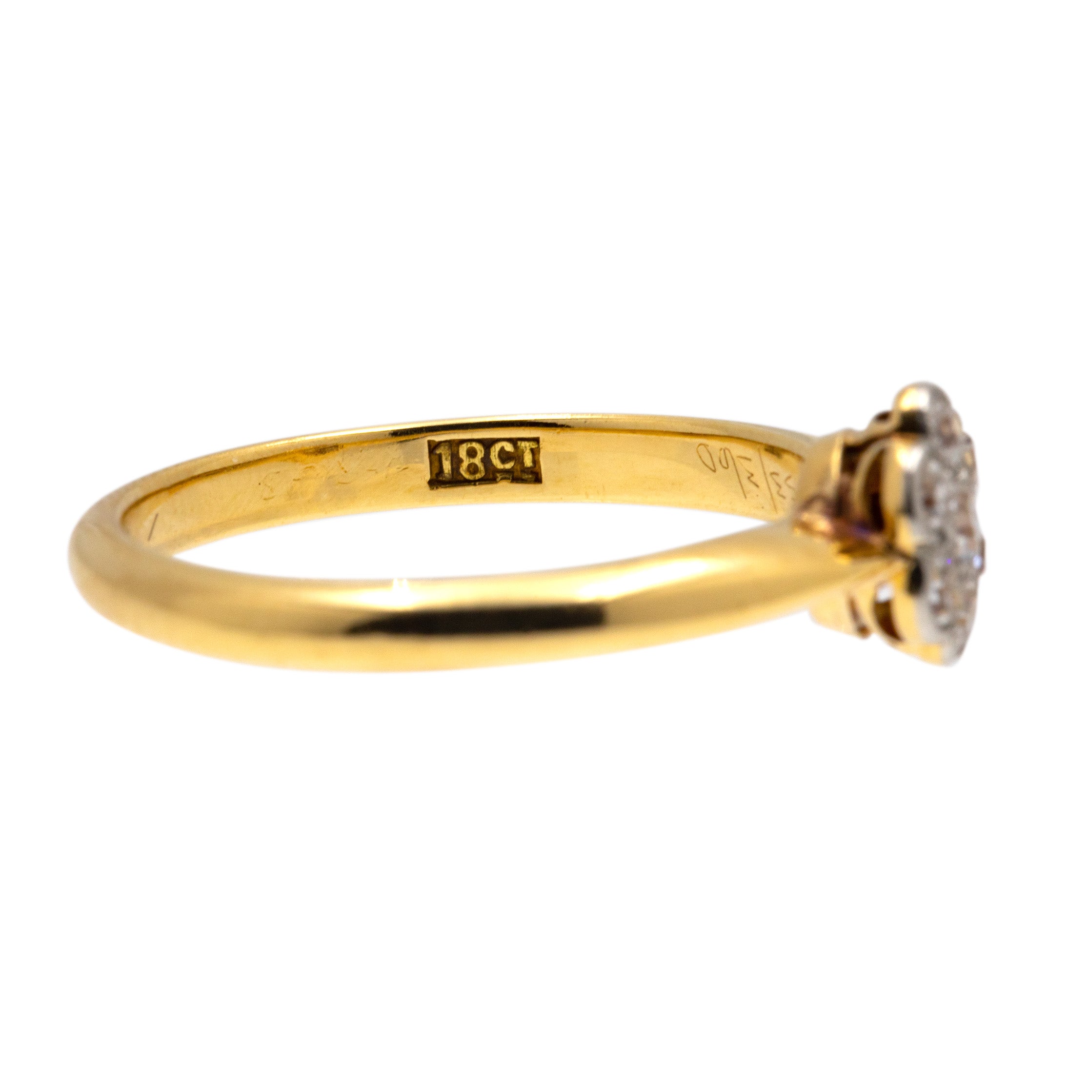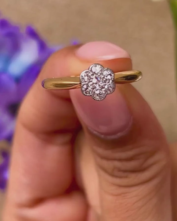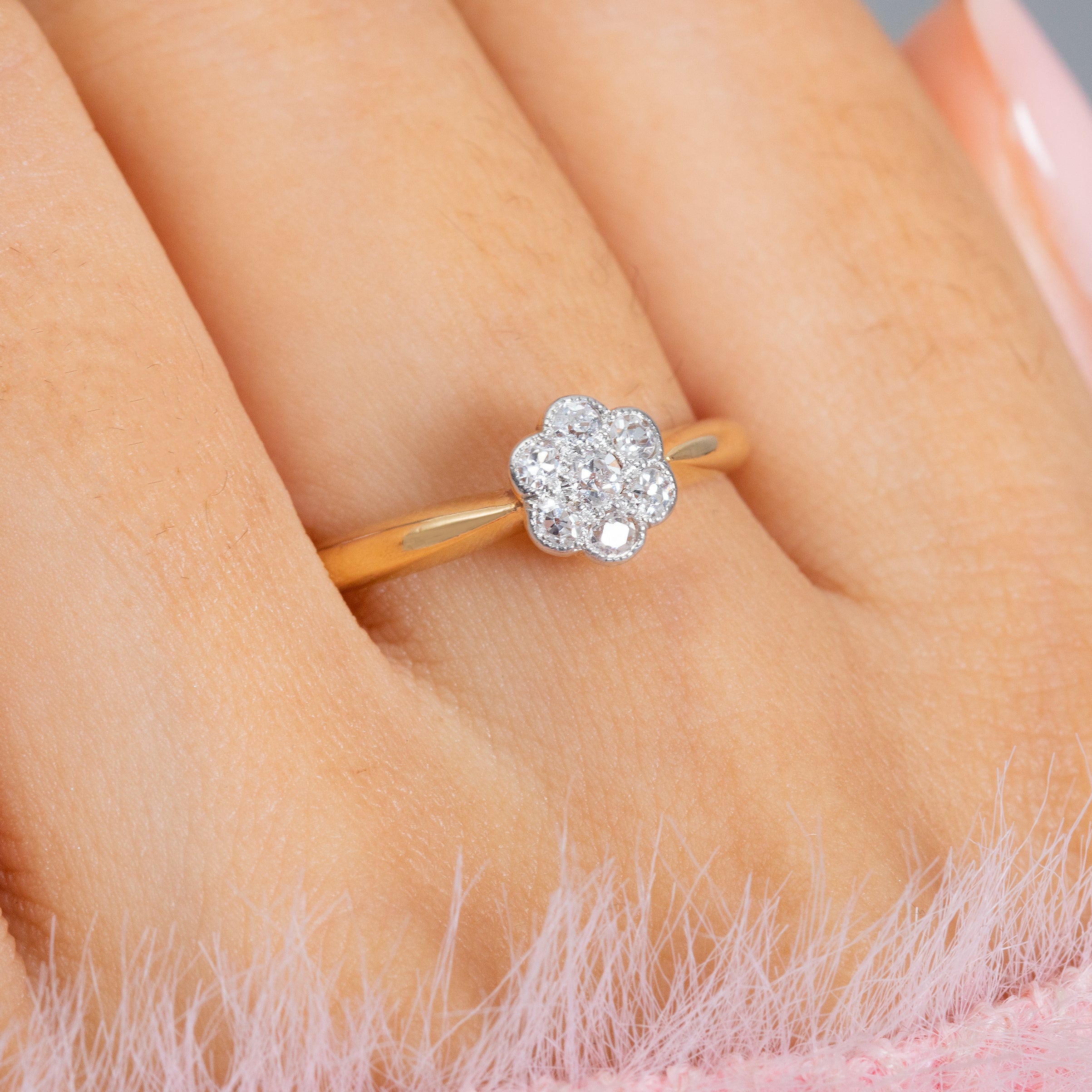 The smooth, glossy 18ct Gold band effortlessly glides onto your hand, making this antique Diamond ring the perfect engagement ring choice! From every angle, this Diamond cluster ring exudes Edwardian elegance.