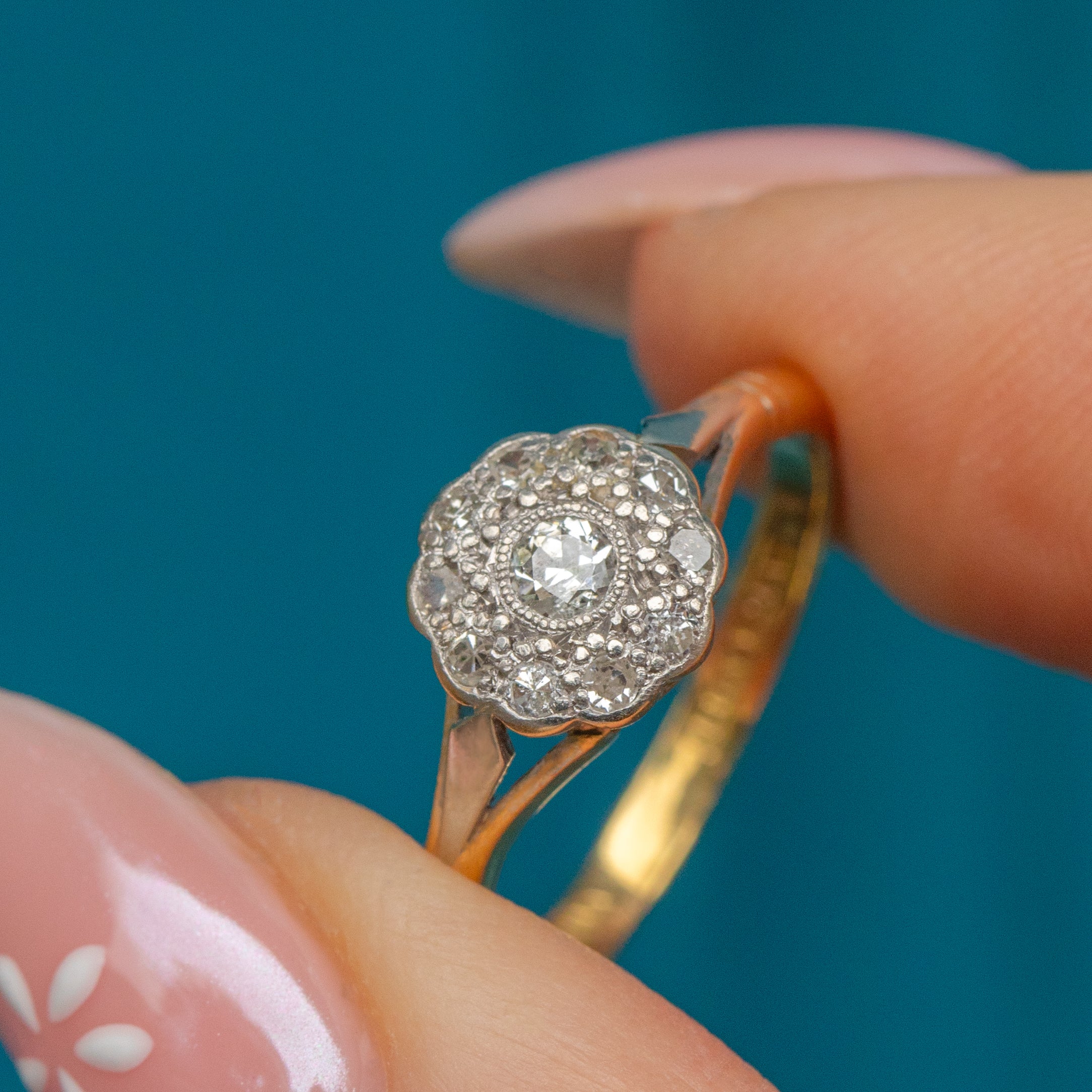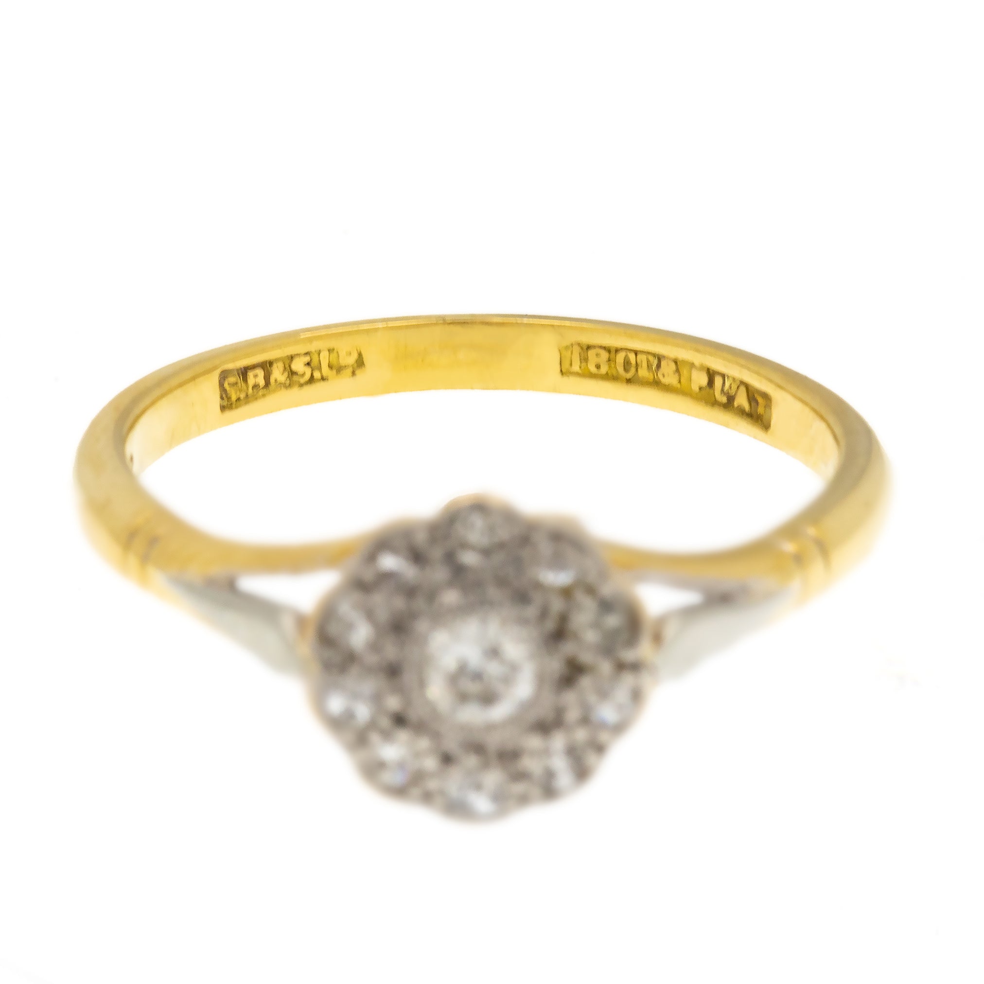 EXCELLENT. This Edwardian 18ct Gold Diamond daisy cluster ring is in excellent condition throughout. Emanating luxury from every crevice, her 18ct Gold shank is smooth and glossy, free from damage to note! Each Diamond is securely nestled in its settings and is free from any chips or other damage, retaining a brilliant sparkle.