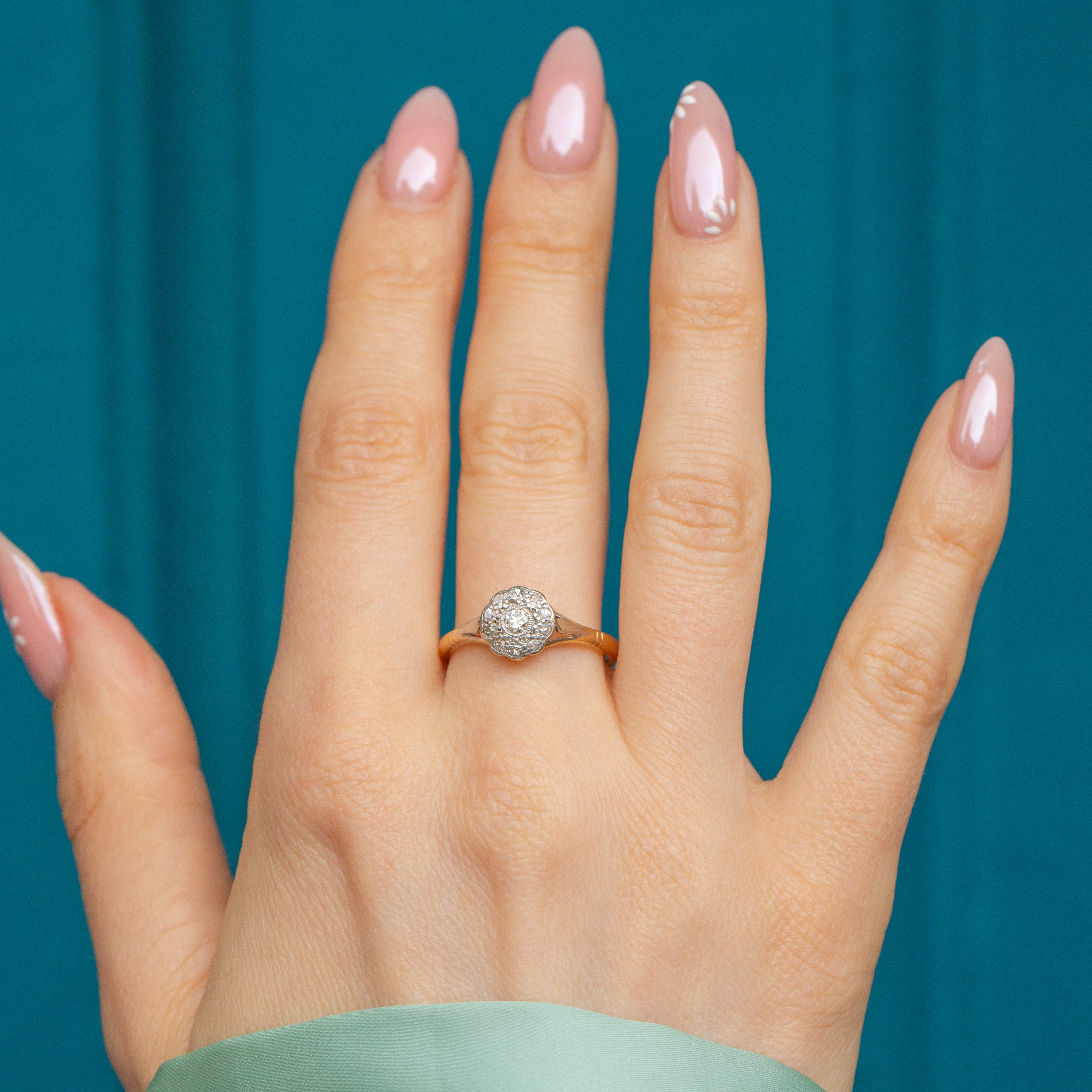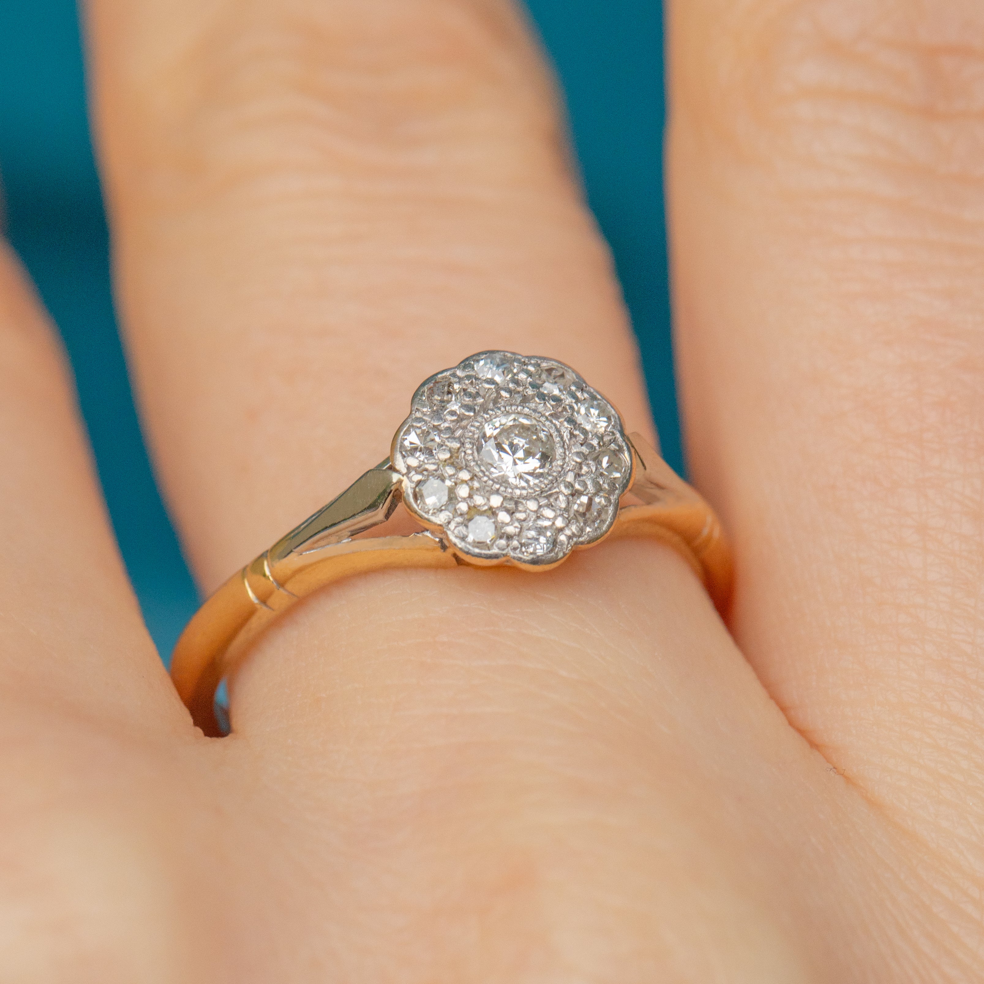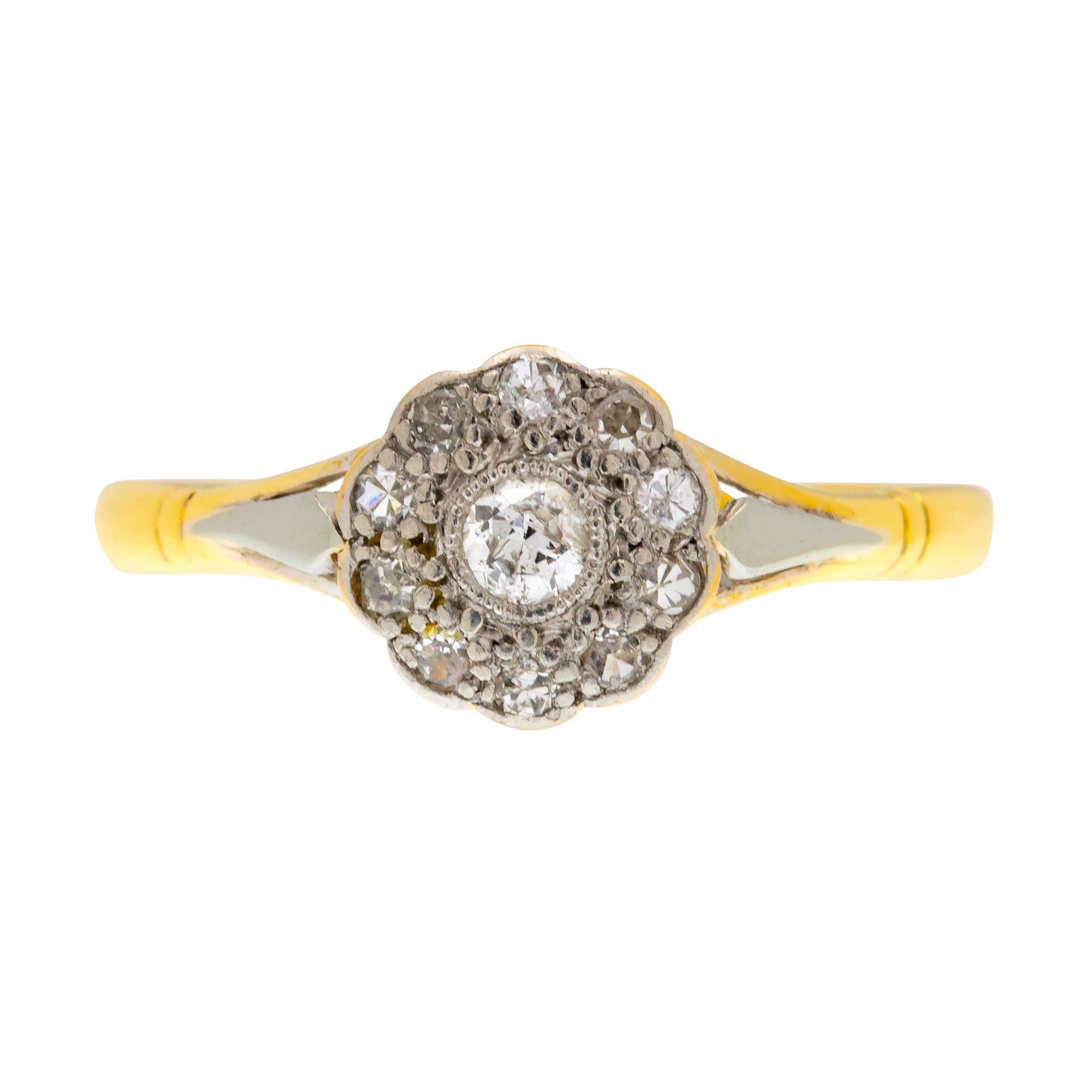A splendid Edwardian 18ct Gold Diamond daisy cluster ring, flaunting a gorgeous spread of 0.25ct. Radiating beauty from every angle, this dainty Diamond cluster ring will dazzle!