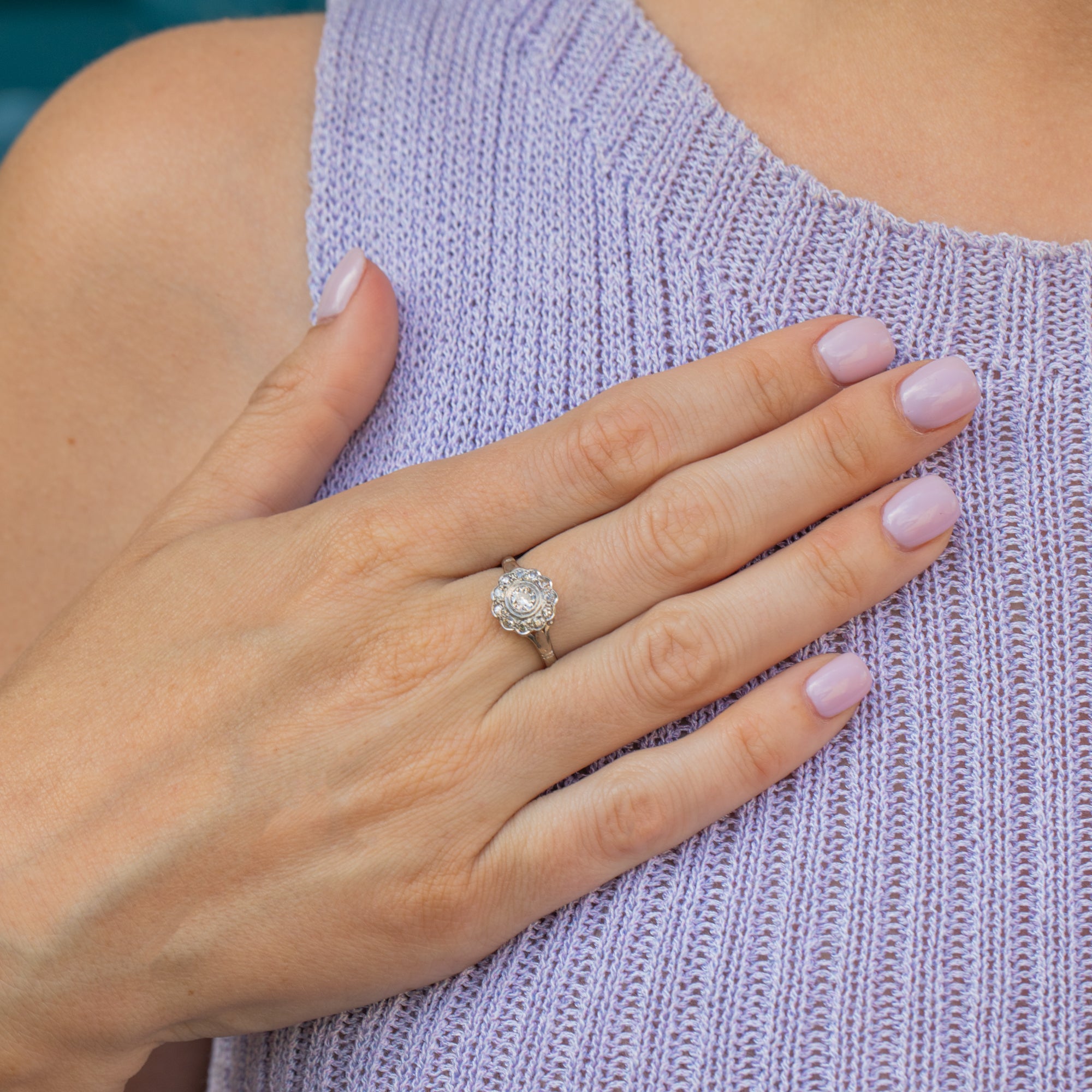 Crafted from lustrous 18ct White Gold, this Edwardian Diamond ring would make a fine choice as a unique engagement ring for anyone looking for a bold and floral alternative. Boasting elegance and charm, this antiqye Diamond cluster ring will make a dazzling addition to your collection!