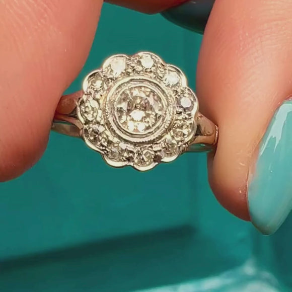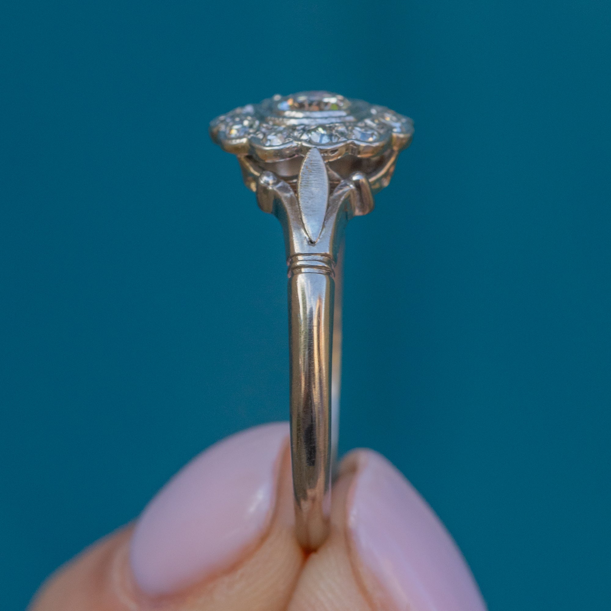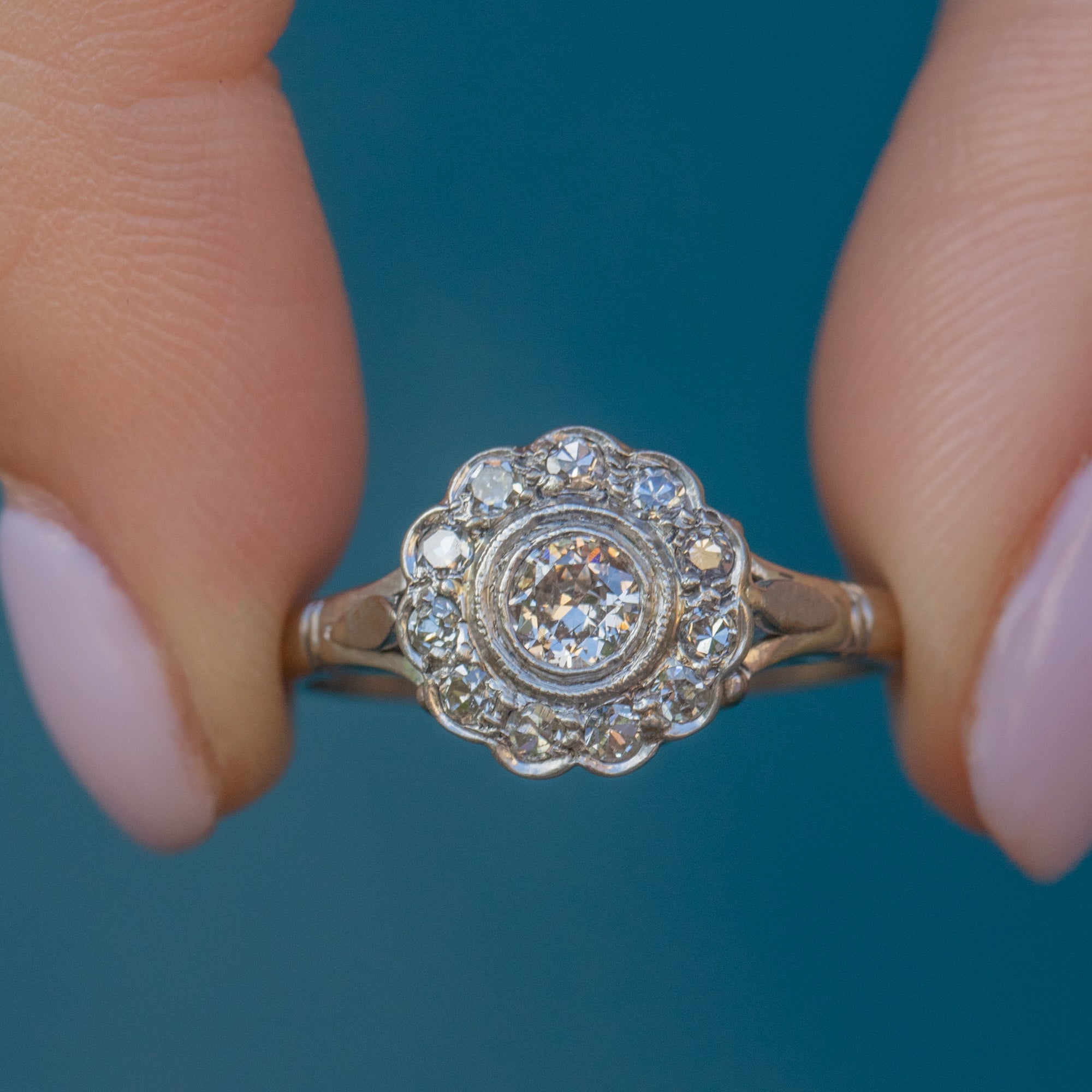 This graceful Edwardian 18ct Gold Diamond daisy cluster ring oozes femininity, with her eleven scintillating Diamonds haloing around her 0.20ct central old European-cut Diamond, this ring she will shine brilliantly from all angles!