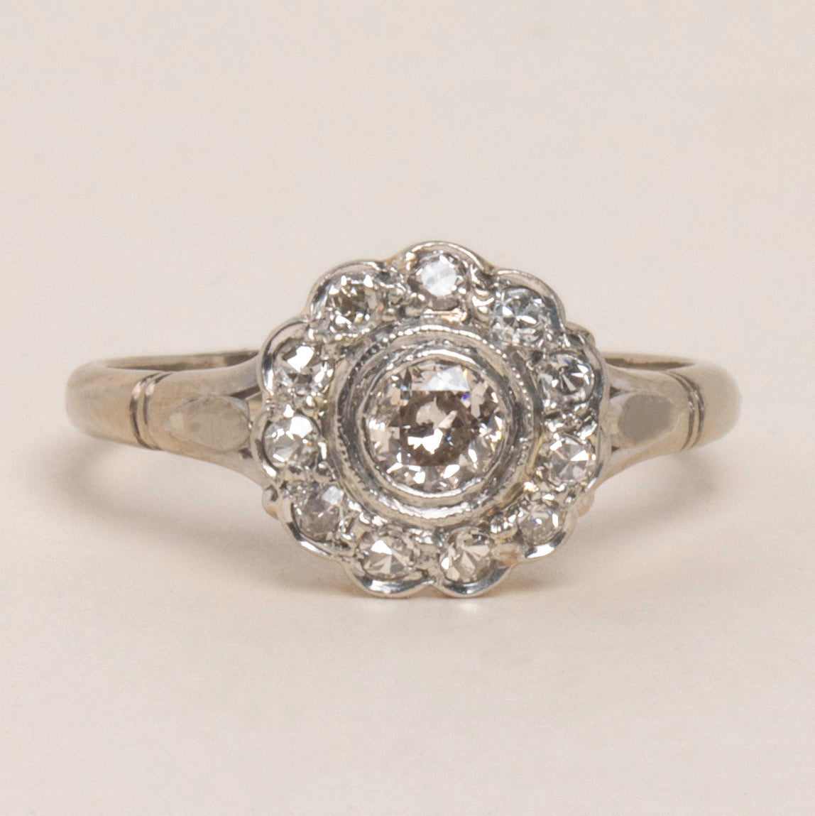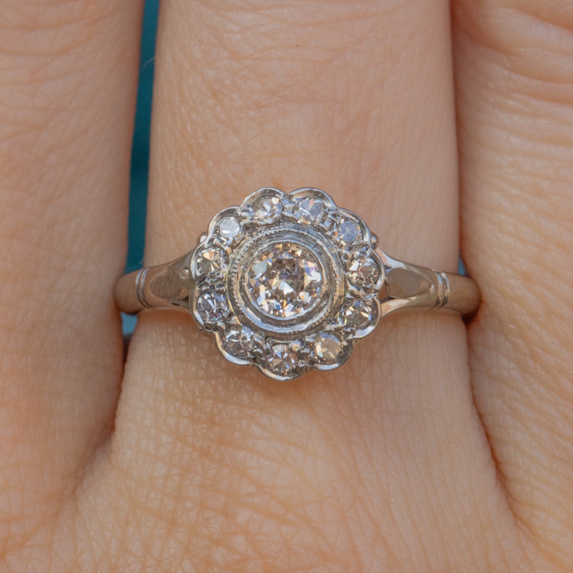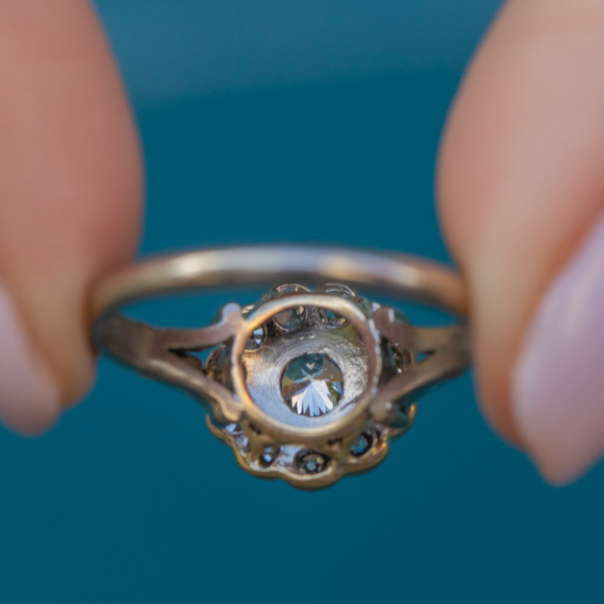 This graceful Edwardian 18ct Gold Diamond daisy cluster ring oozes femininity, with her eleven scintillating Diamonds haloing around her 0.20ct central old European-cut Diamond, this ring she will shine brilliantly from all angles!