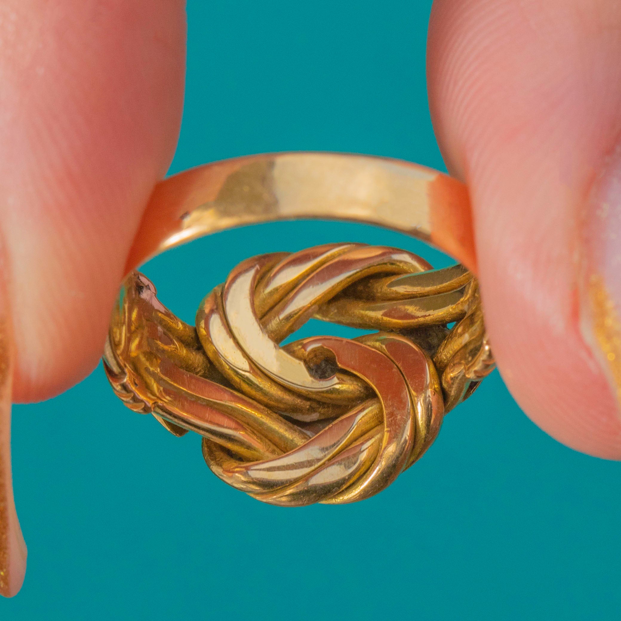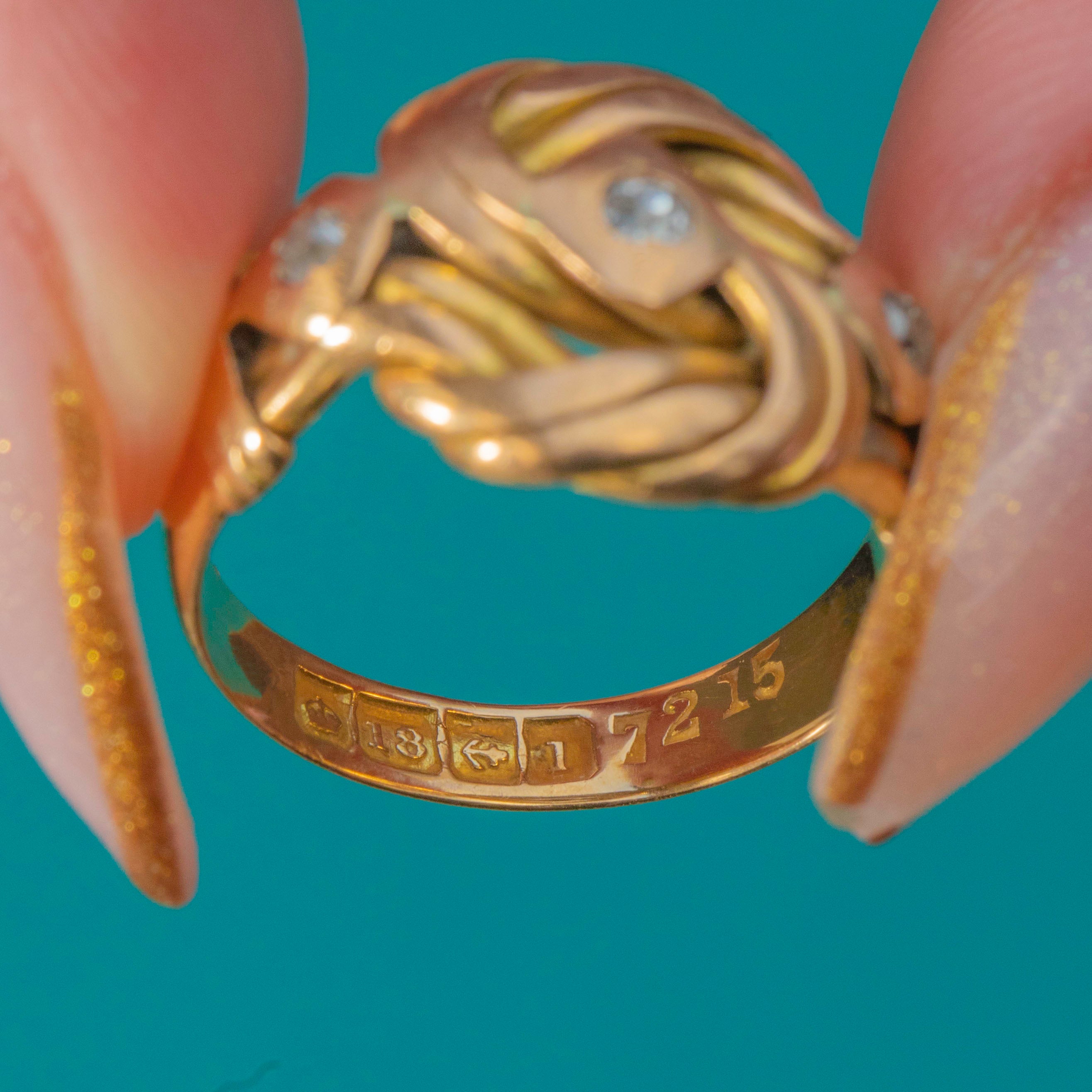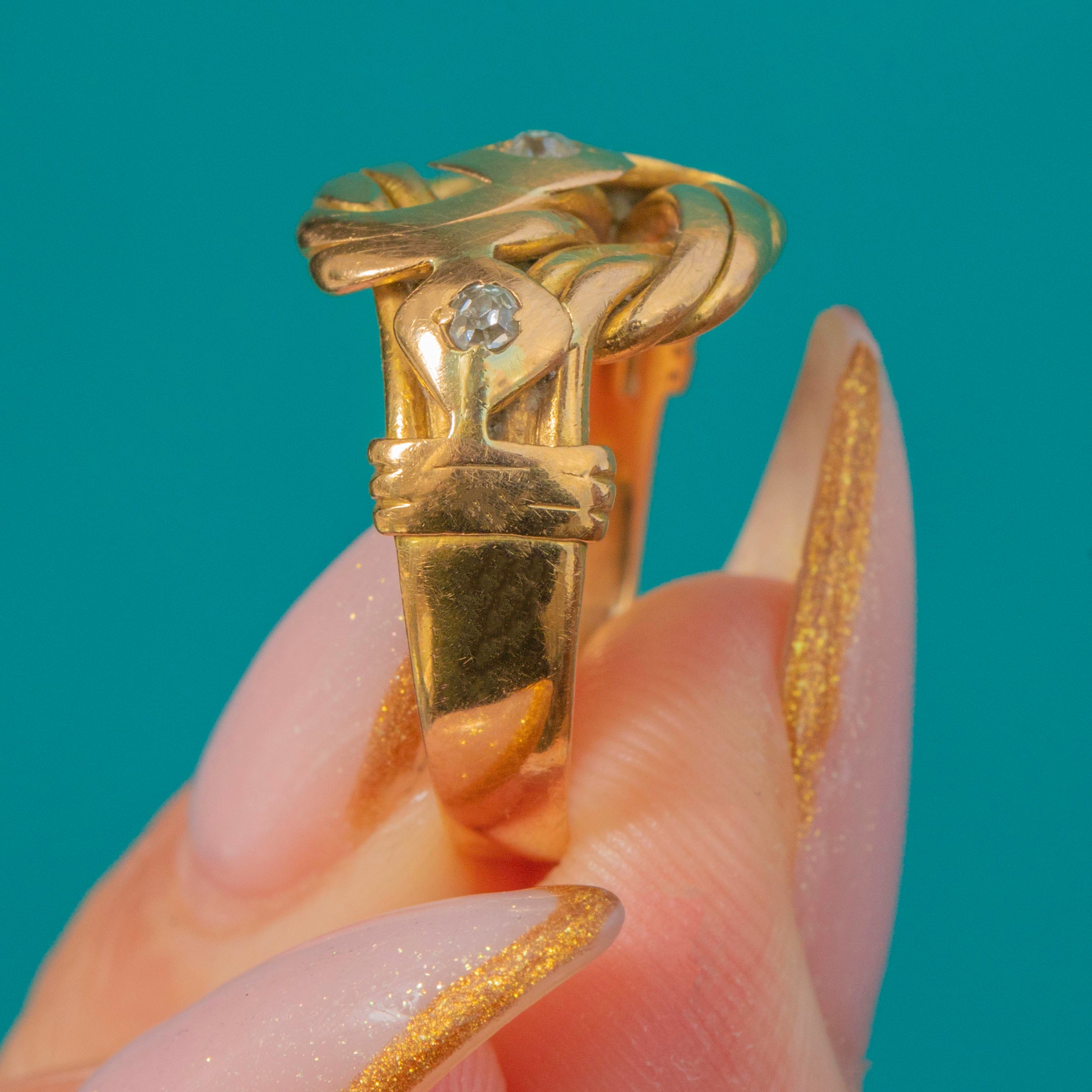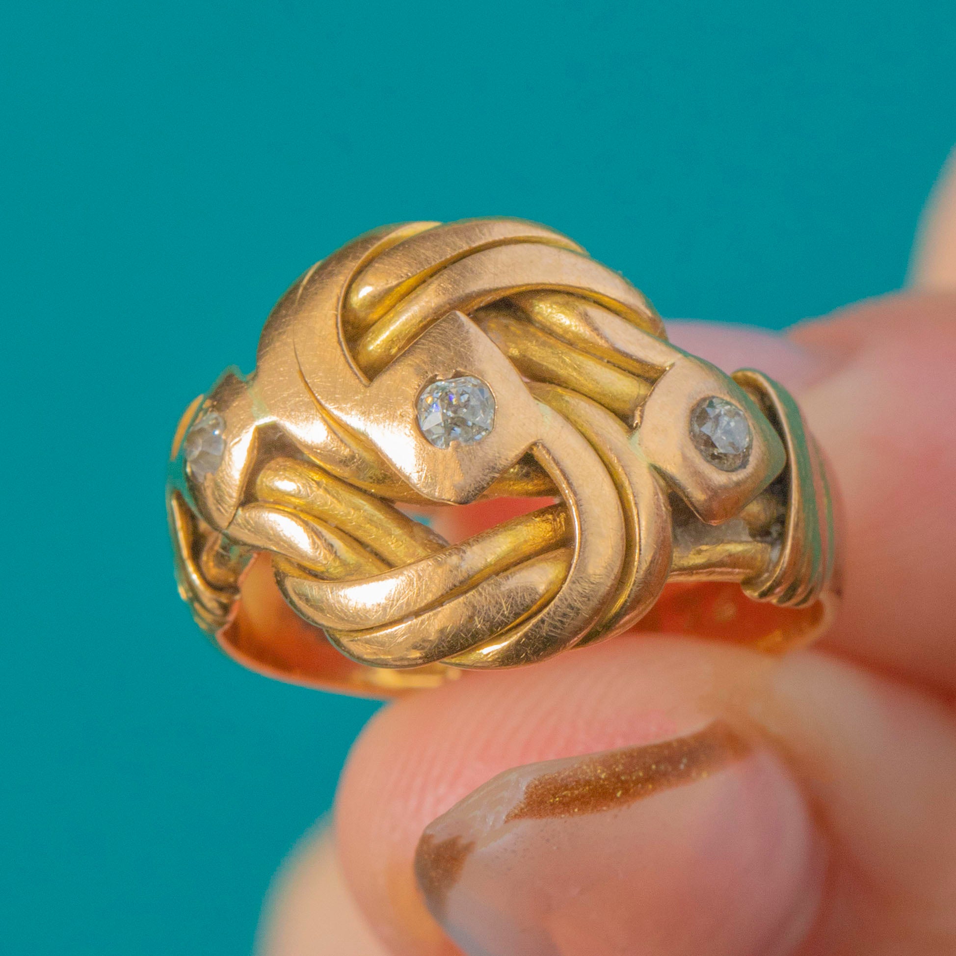 VERY GOOD: The Old Mine Cut Diamonds are bright with no chips or abrasions. The Gold has softened slightly with time, rounding the edges of the knot motif and adding to its antique charm. The shank remains strong and comfortable, with only light wear consistent with age.