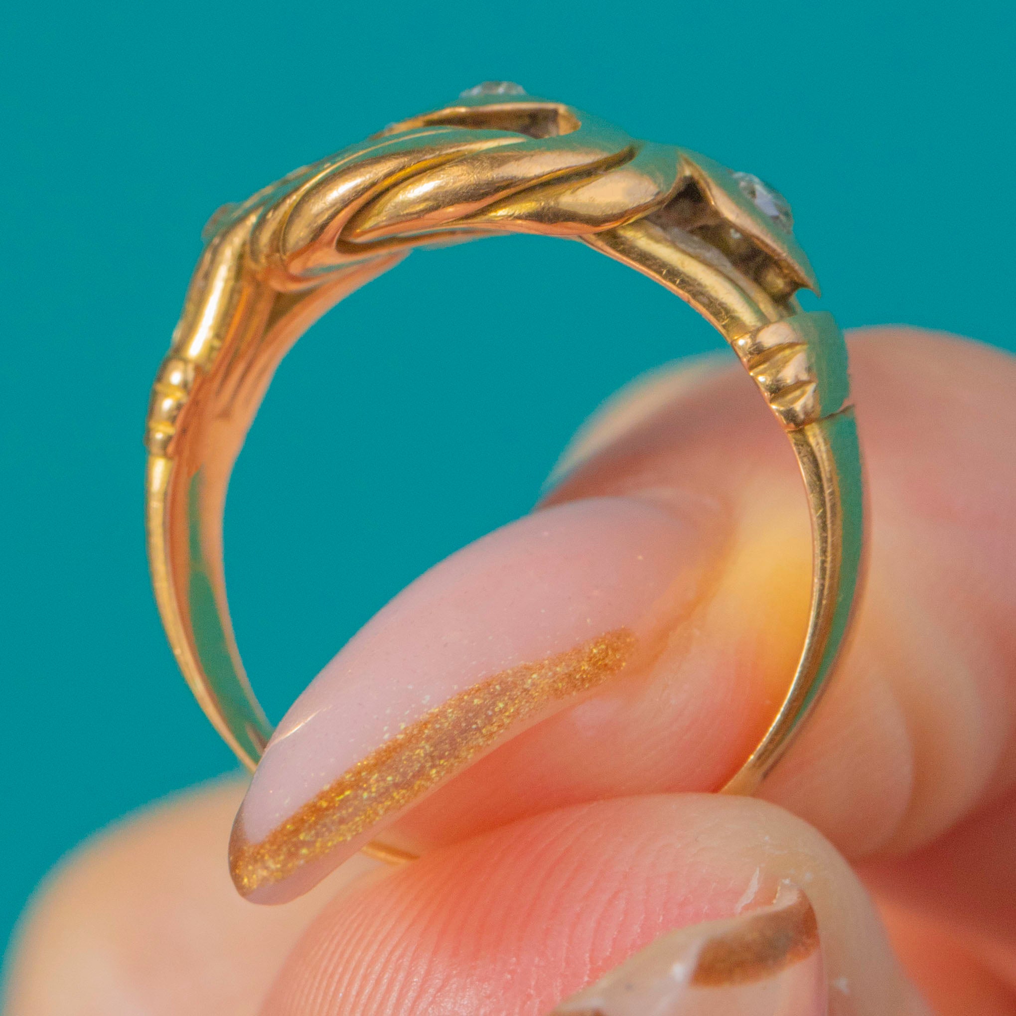 MATERIALS: Tests as 18ct Gold, three Old Mine Cut Diamonds (each 2mm in diameter, 0.04ct total).