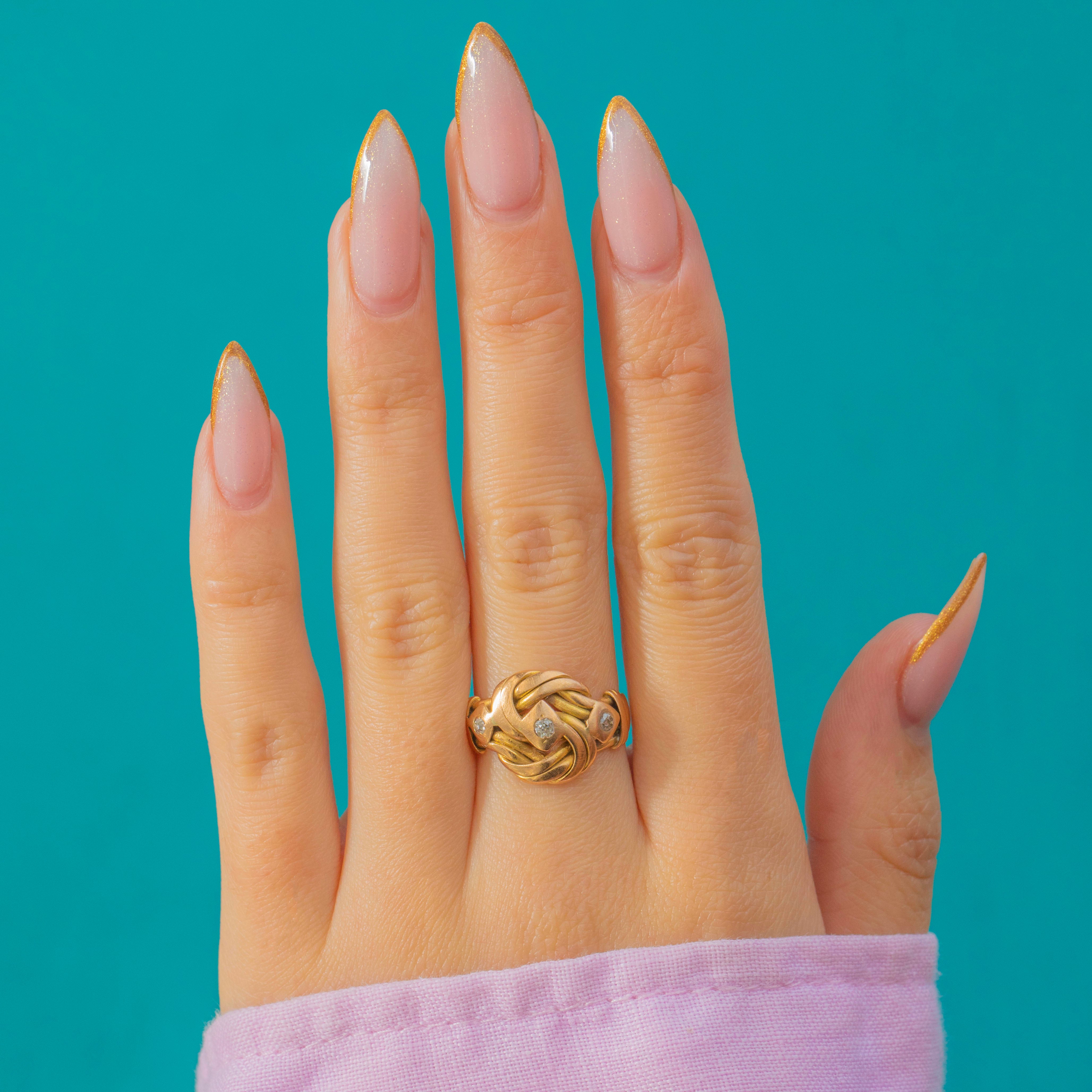 This Edwardian 18ct Gold knot ring is a beautifully romantic token of love, crafted c.1910. The knot motif symbolises unity and devotion, its soft curves wrapped around a trio of sparkling Old Mine Cut Diamonds.