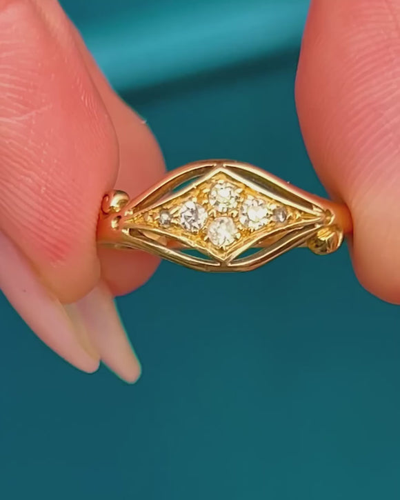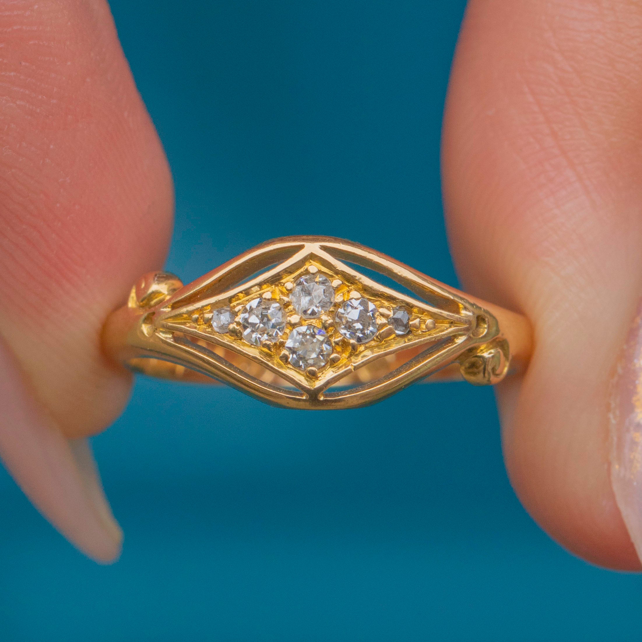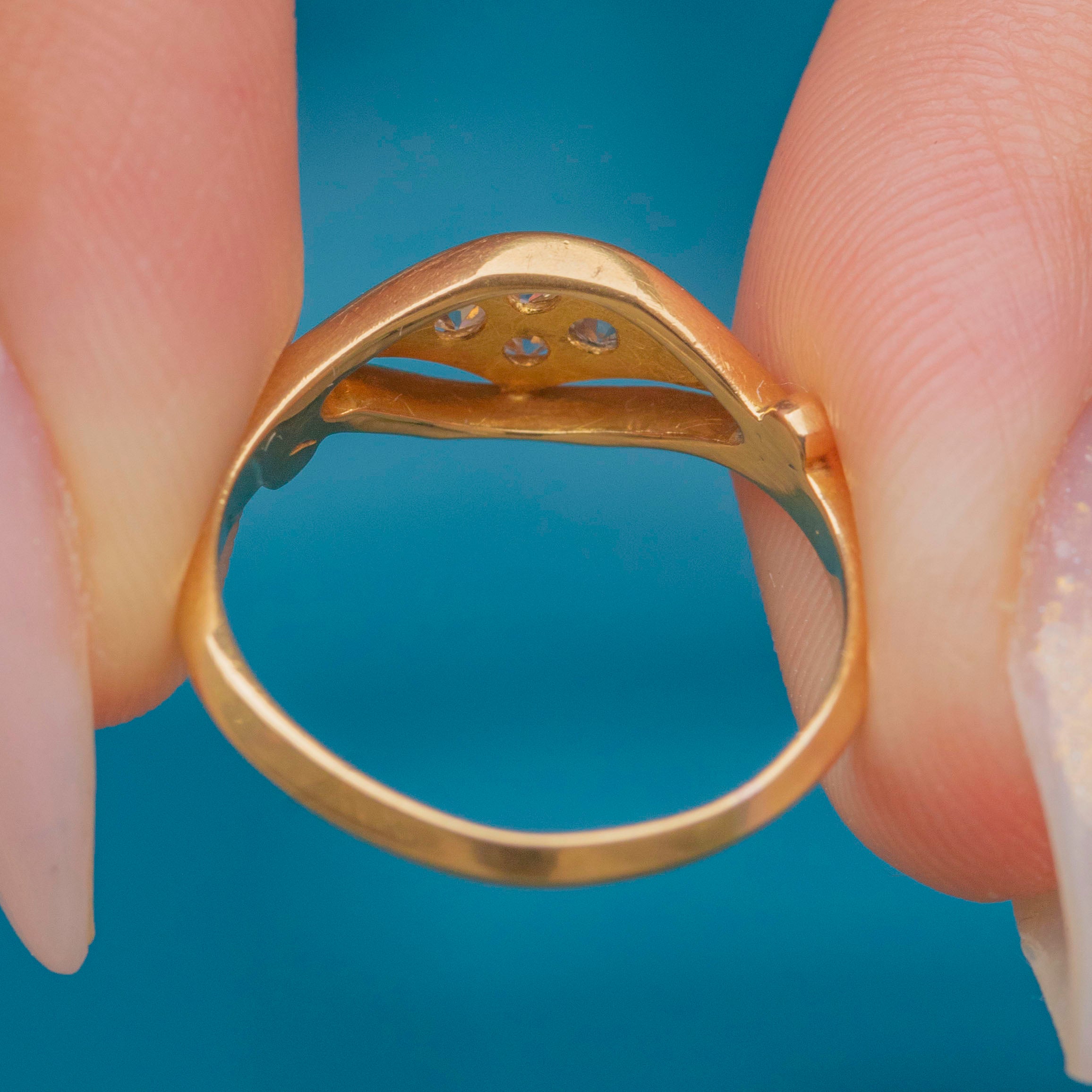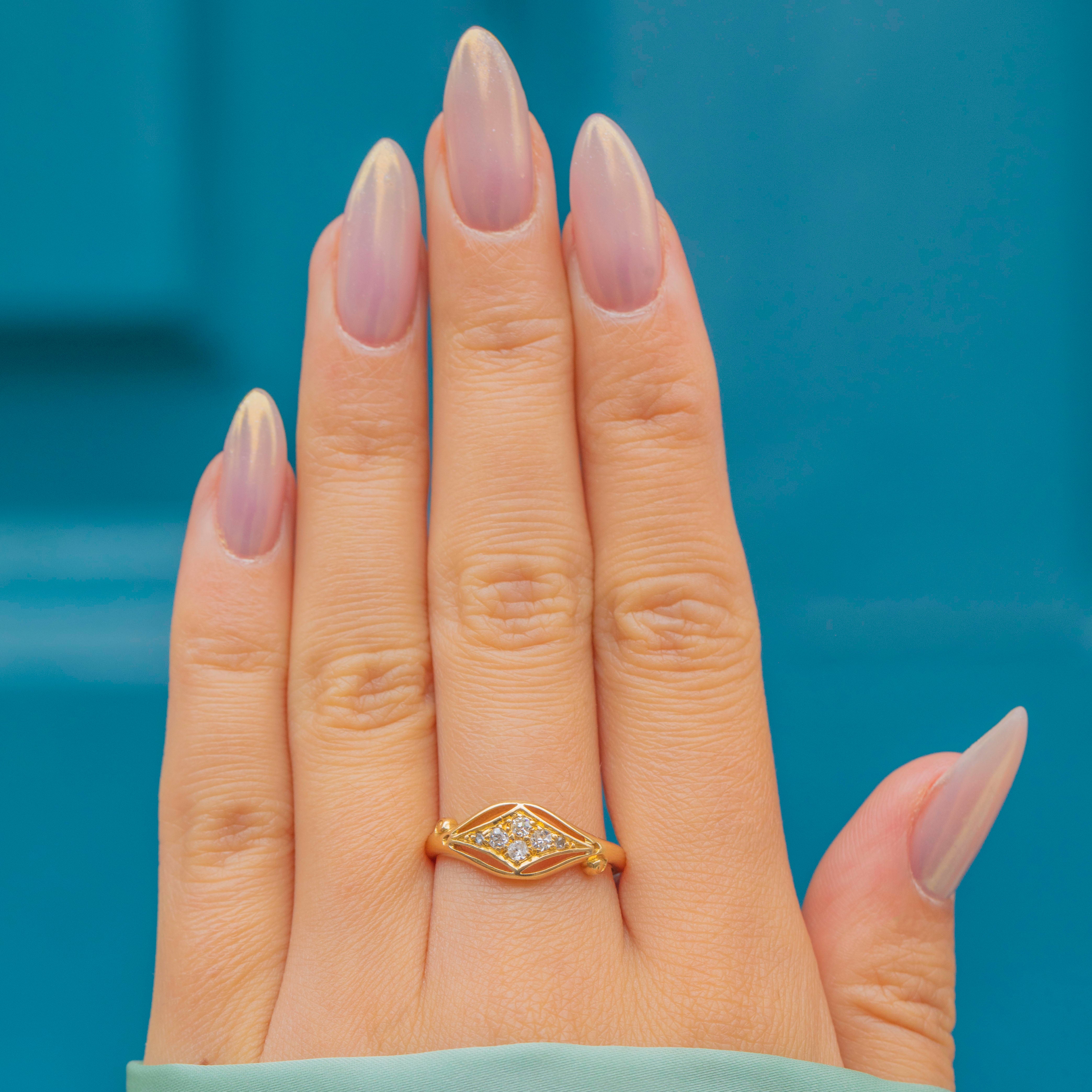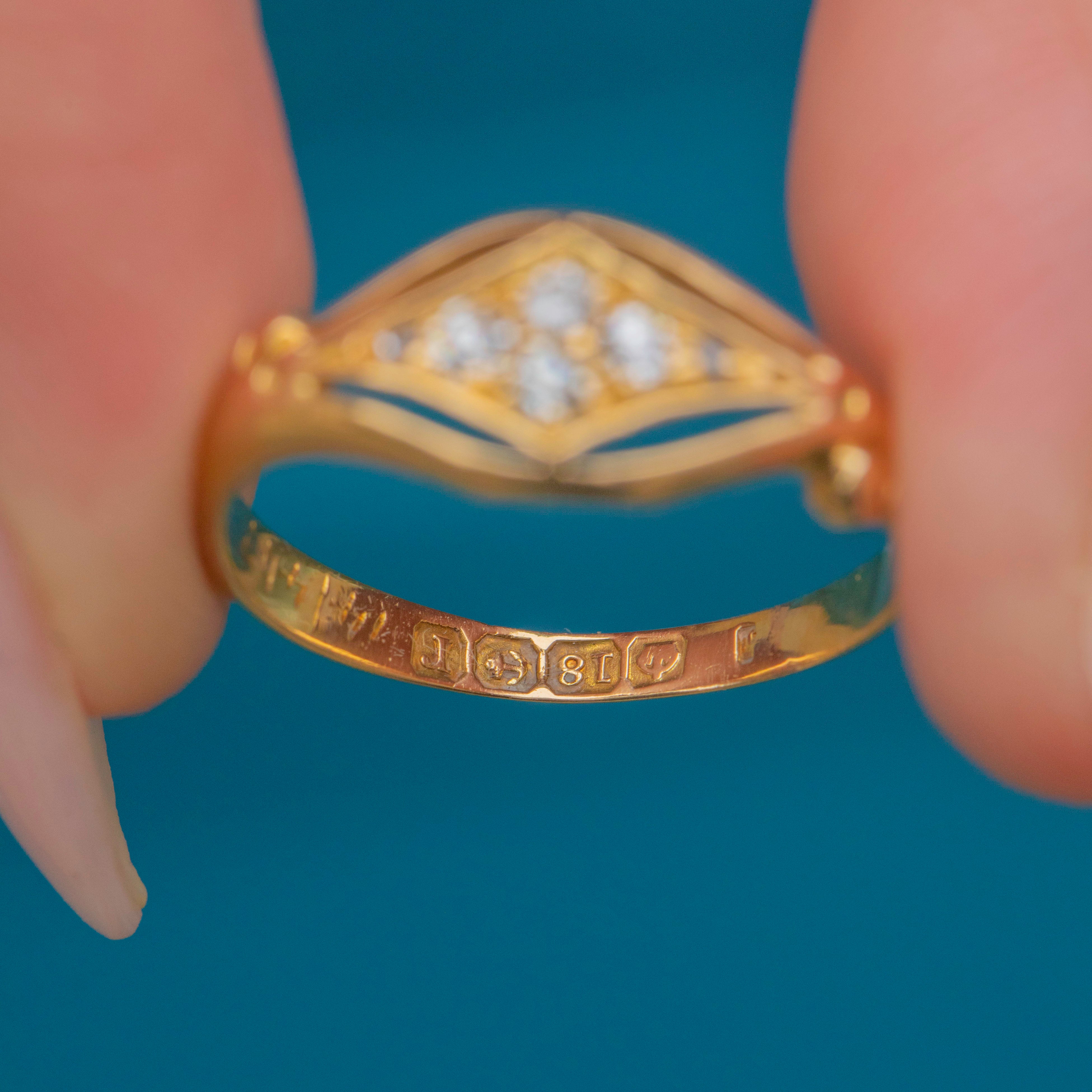 This elegant 18ct Gold Diamond ring showcases six sparkling Diamonds with a combined weight of approximately 0.15ct, flanked by a buttery knife-edge shank. A charming piece of antique jewellery, this ring carries a full set of English hallmarks and is dated to 1916.