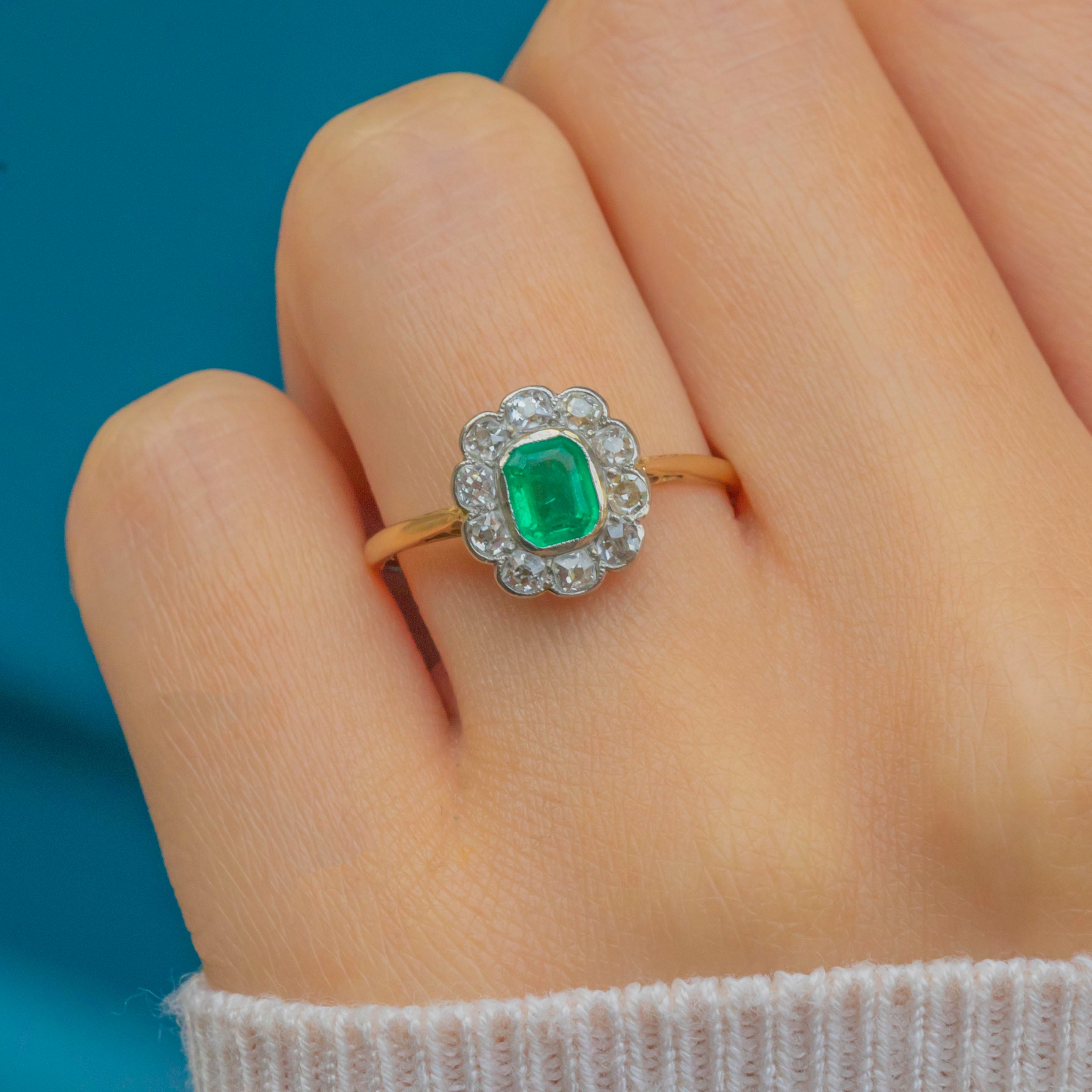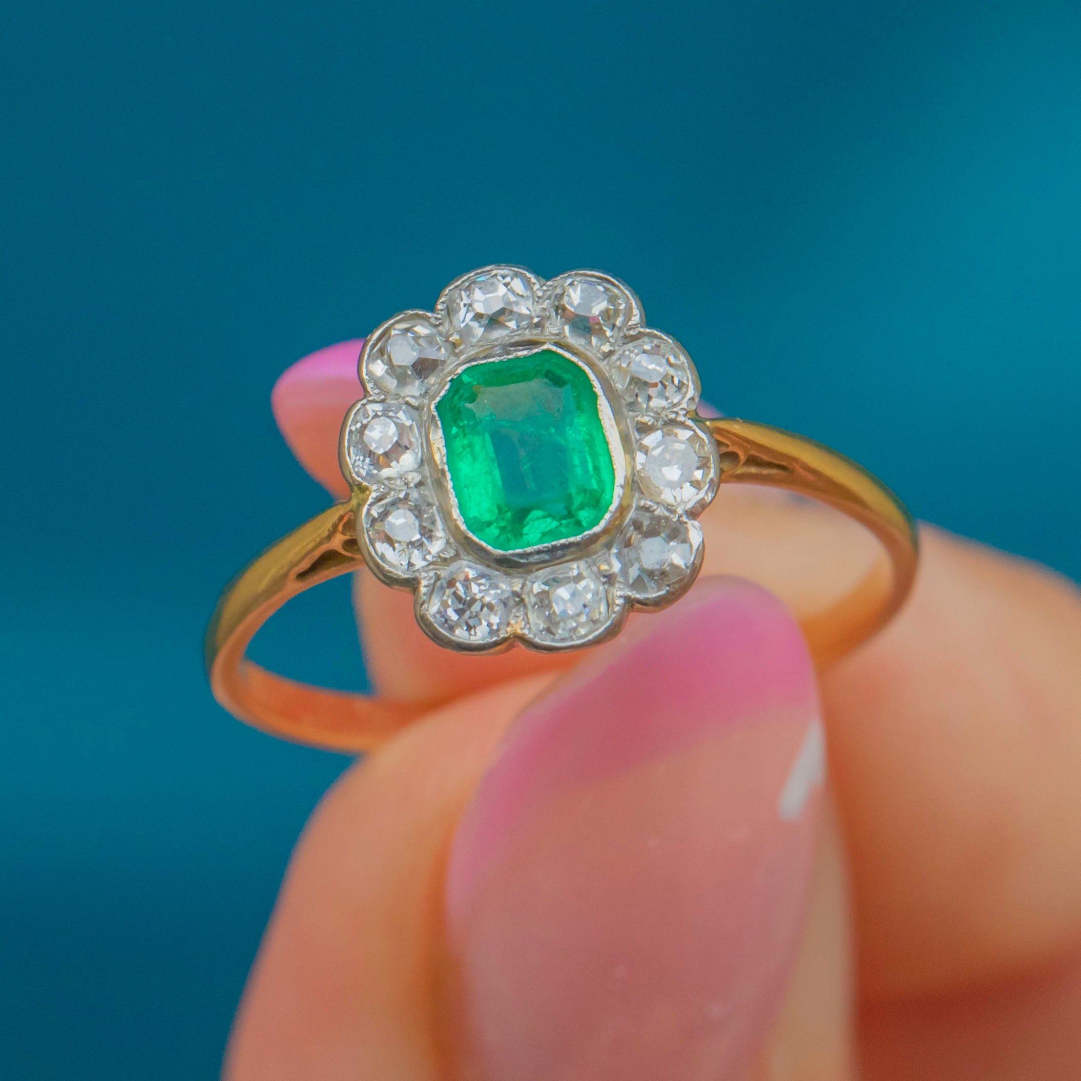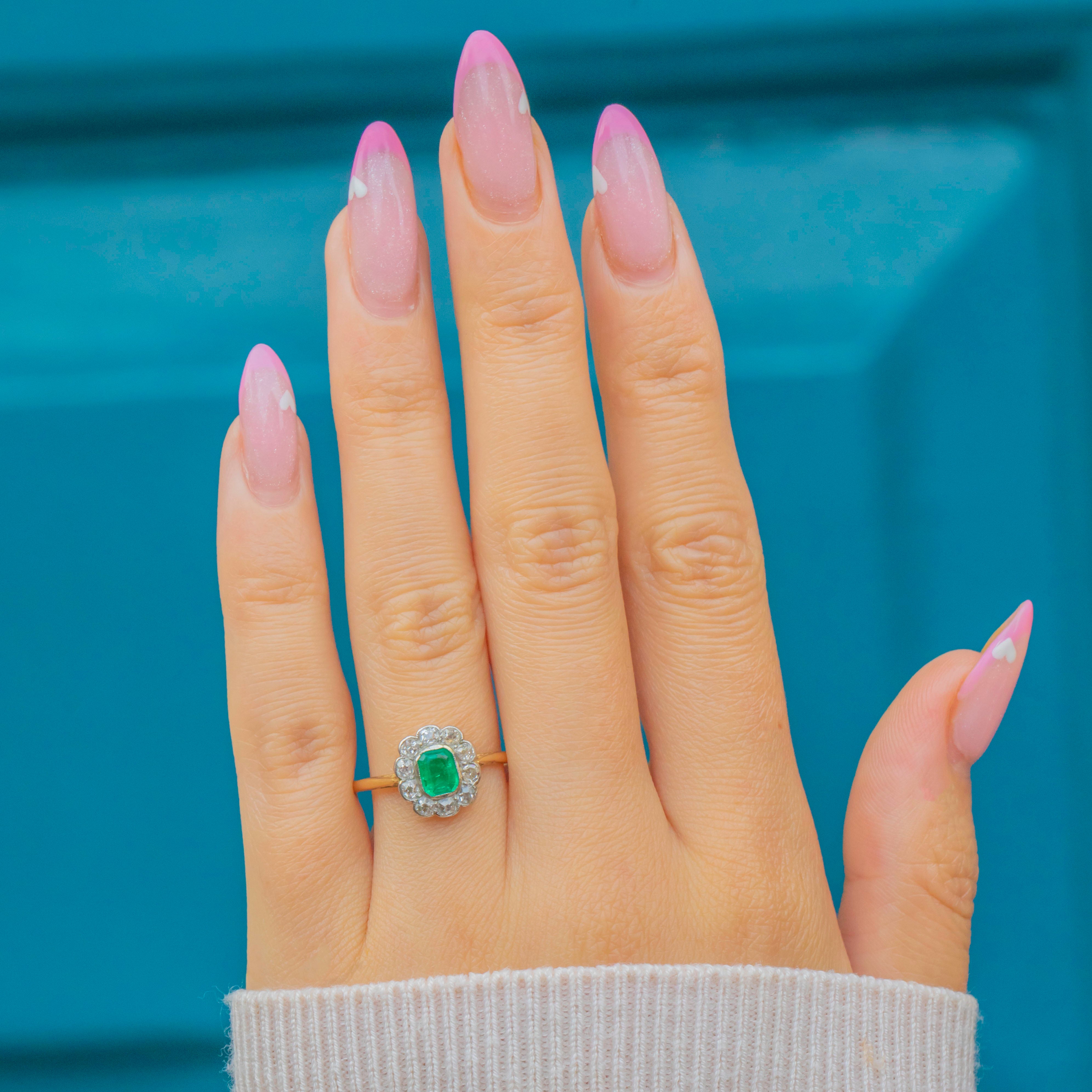 This exquisite Edwardian cluster ring showcases a vivid green Emerald surrounded by a sparkling halo of old mine-cut Diamonds. The Emerald’s lush hue contrasts beautifully with the bright antique Diamonds, creating a timeless and elegant design that has endured for over a century.