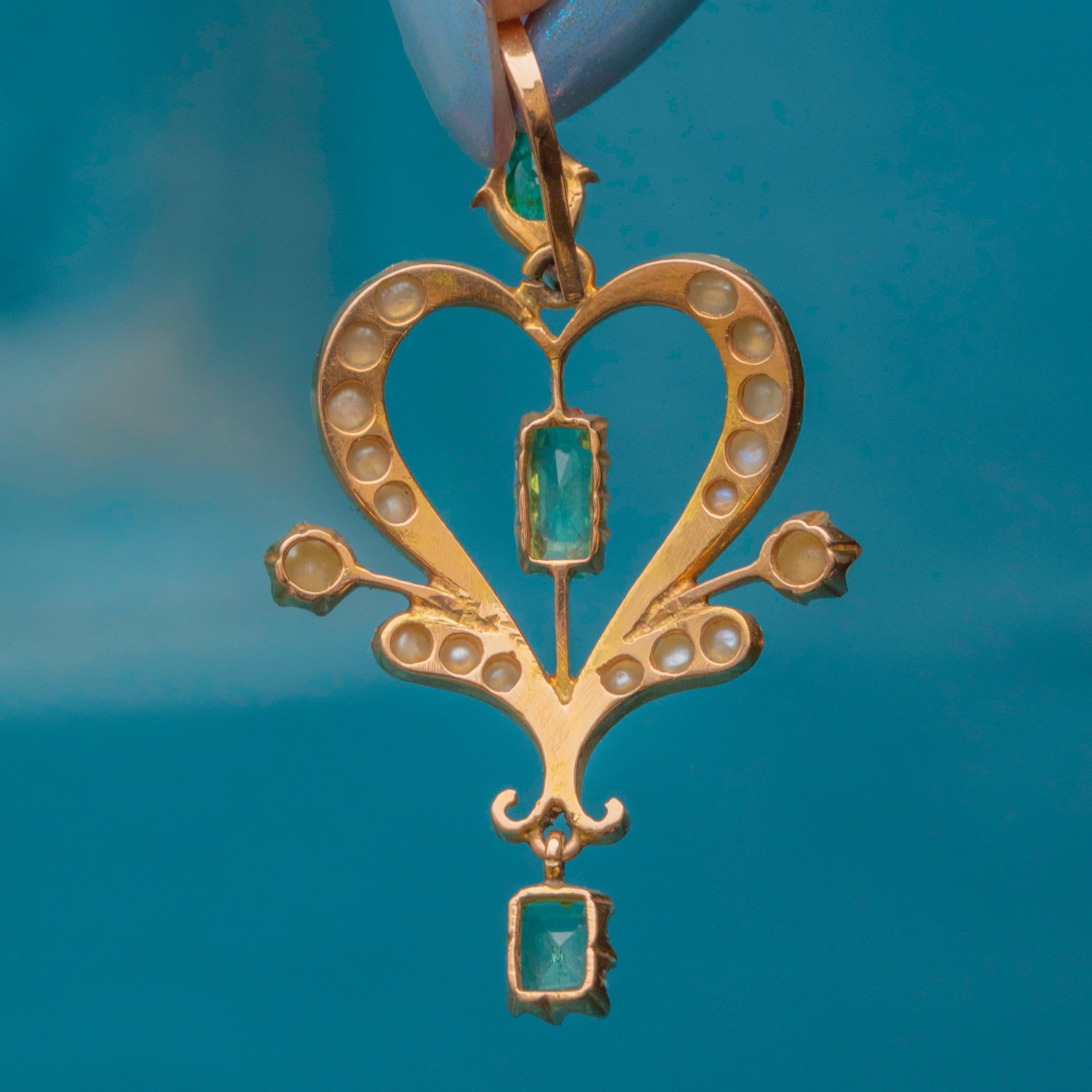 VERY GOOD. This Edwardian 18ct Gold Emerald Pearl lavalier pendant is in very good condition. The 18ct Gold is radiant with only small areas of surface wear present. Your eyes will instantly be drawn into the verdant Emerald, with facets that twinkle and glisten with some unique natural inclusions adding to its antique charm! The Emerald on the bale does have a chip to her surface, noticable under the inspection of a loupe. All Pearls are present and  securely set. Suspend this eye-catching piece from a fine Gold chain for a whimsical antique look!