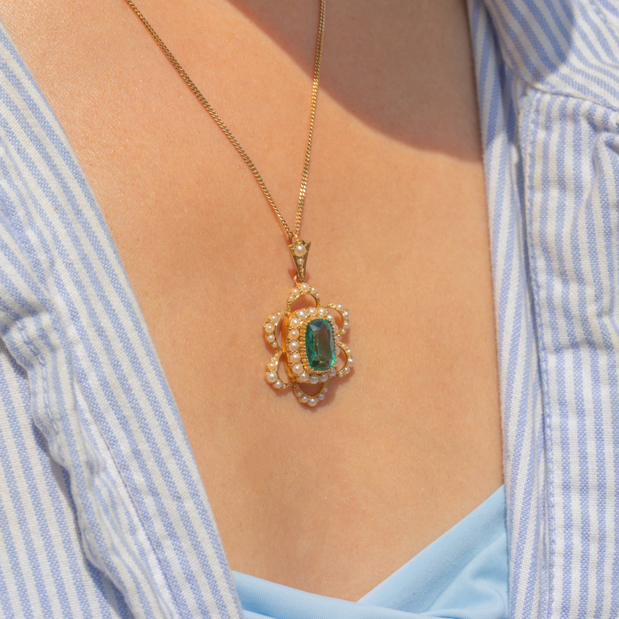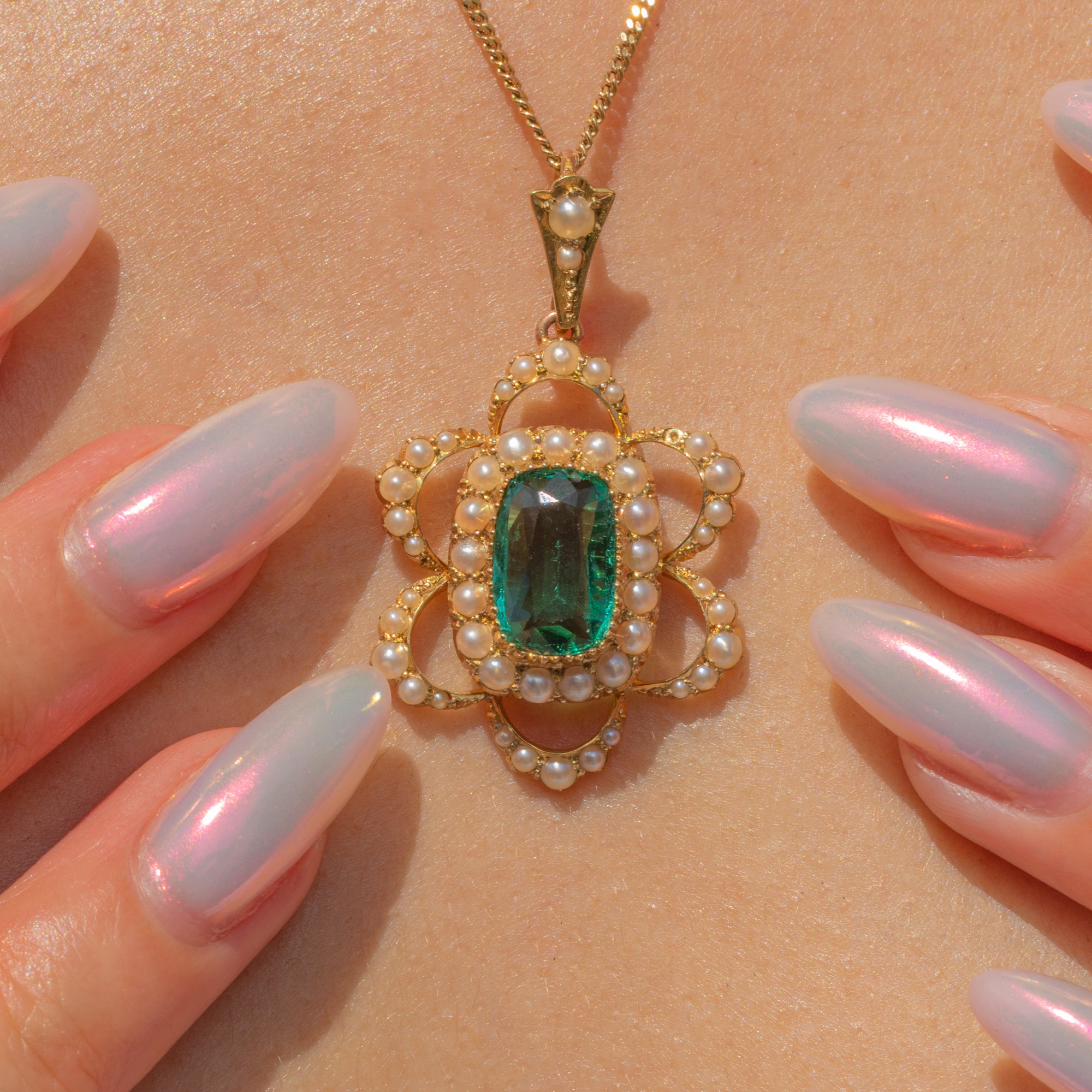 This antique pendant is an exquisite example of Edwardian craftsmanship! The pendant is crafted from brightly saturated 18ct Gold and displays a vibrant, emerald green Tourmaline, surrounded by a generous helping of iridescent Pearls formed into a striking floral design.