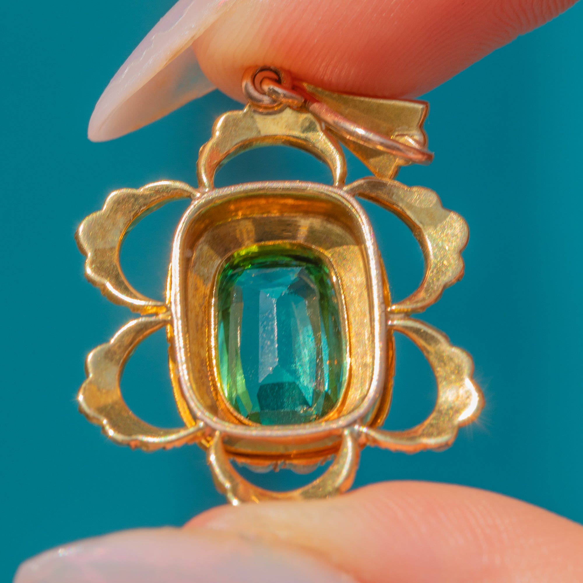 VERY GOOD: The Gold has a glossy, bright saturation throughout and the pendant has held its shape well, with no visible dings or scuffs. The gemstones are all securely set, and the Tourmaline has crisp facets and is free from chips or abrasions. One small Pearl is missing from the top right-hand petal, looking front on, which is only truly noticeable under close inspection and does not detract from the overall impact of the piece. With a securely affixed bale, you can wear this antique Tourmaline Pearl pendant with absolute confidence!