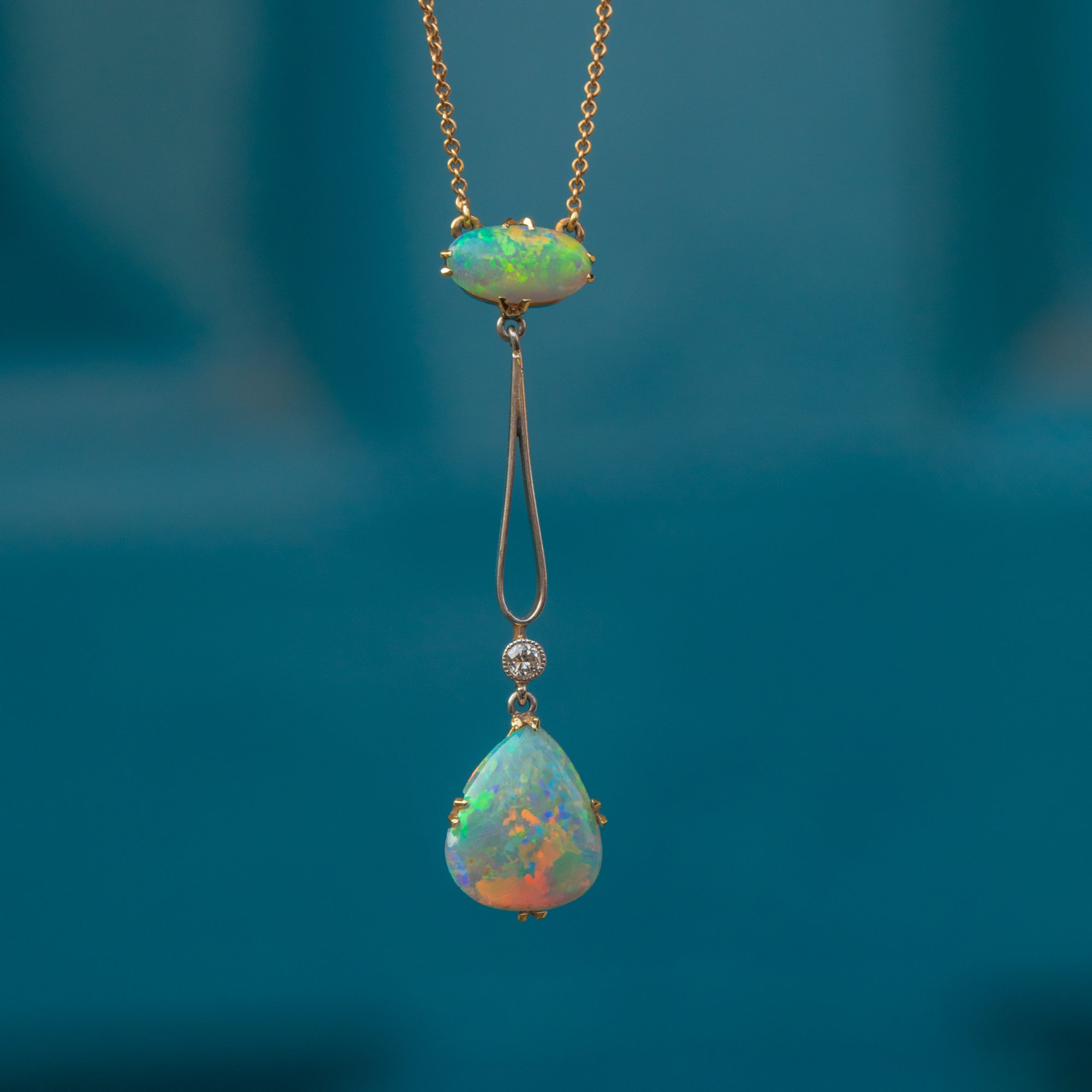 The large teardrop Opal is suspended from a Gold bar drop with Platinum detailing, giving this antique necklace a lovely fluidity. Her scintillating Diamond marries perfectly with the galactic spectrum of her Opals, making for the most splendorous combination.