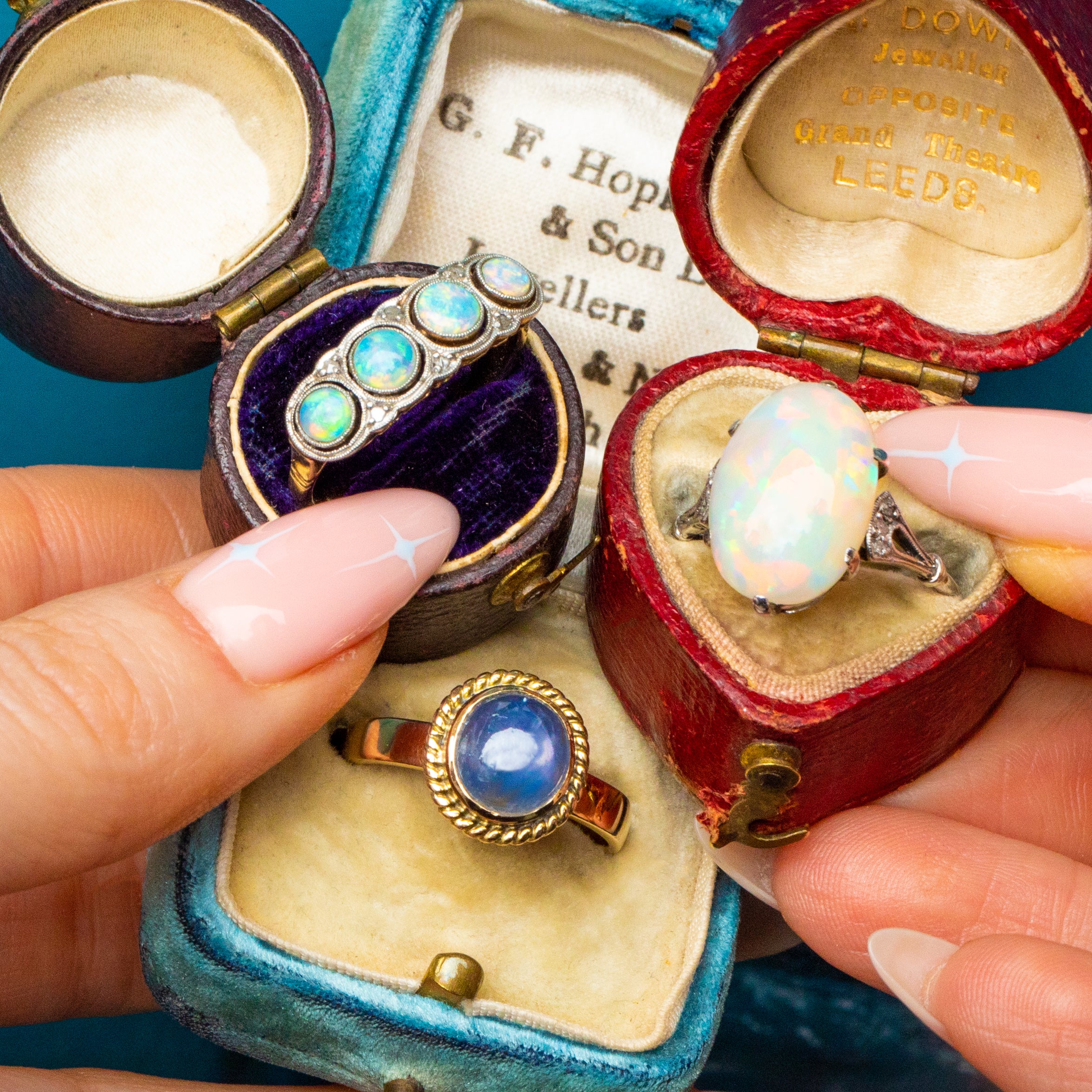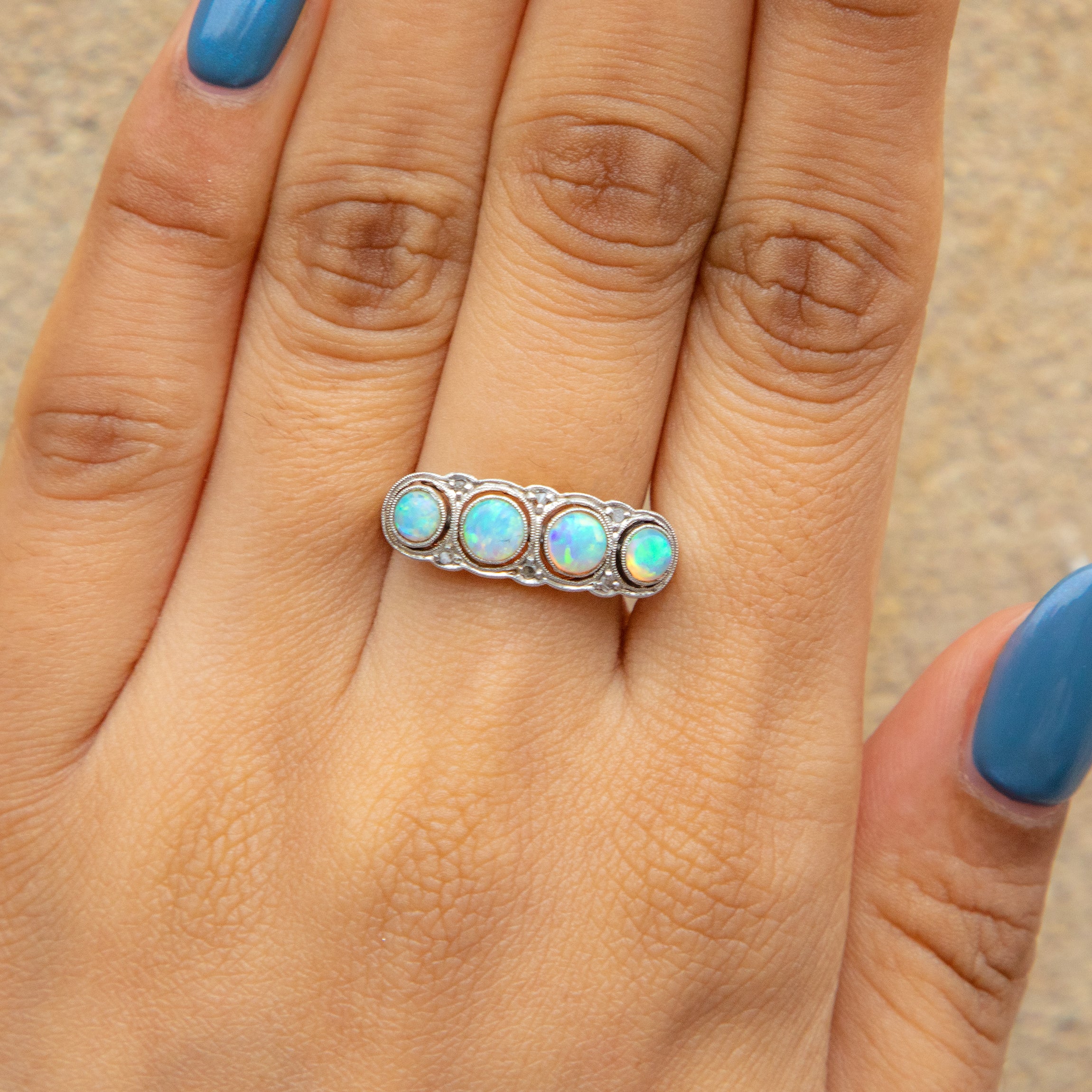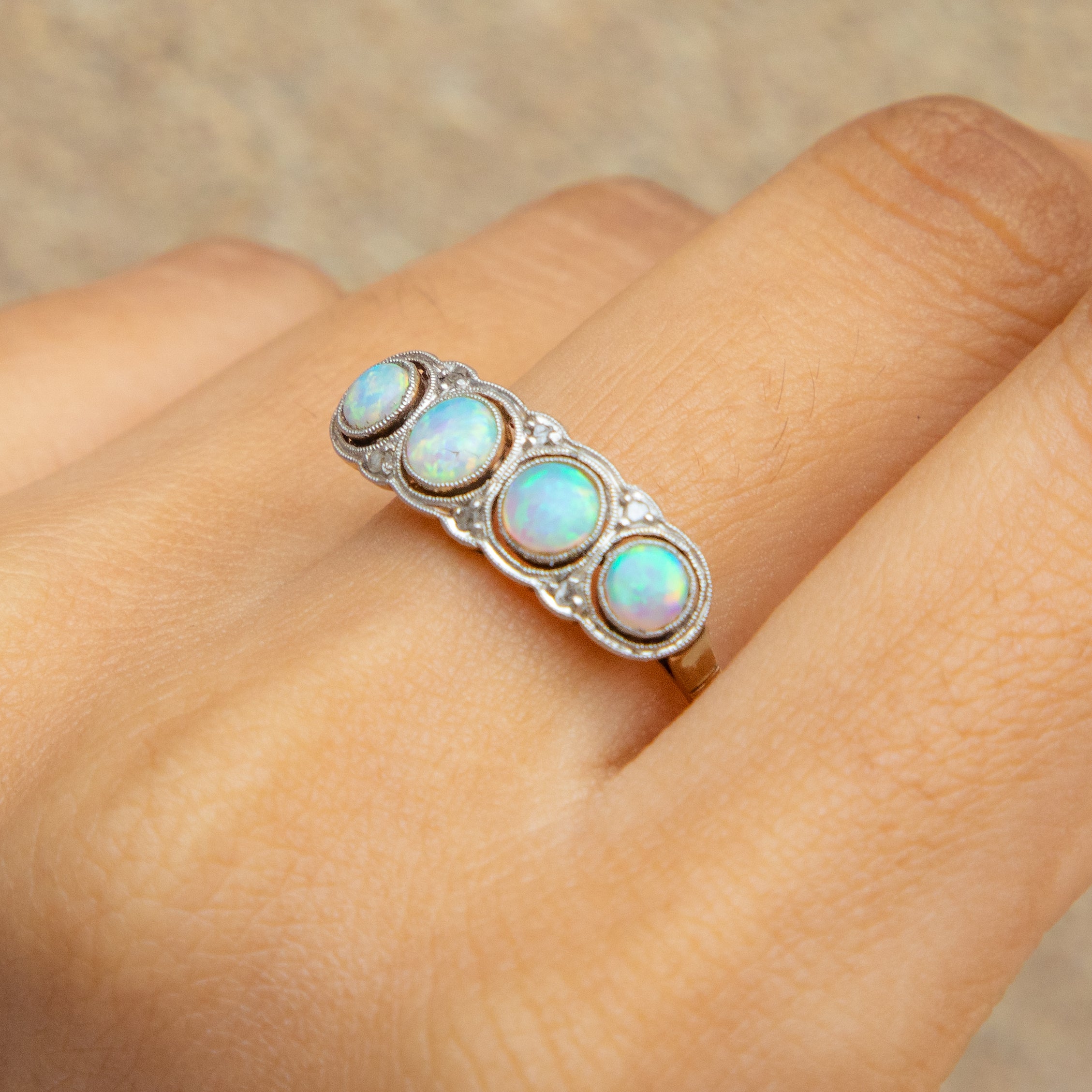 EXCELLENT. This outstanding Edwardian 18ct Gold Opal Diamond ring is in excellent condition. The gemstones are snugly nestled within 18ct White Gold settings, each one free from chips, scratches, or cracks. The 18ct Gold shank is buttery and in lovely shape throughout, allowing you to wear this phenomenal antique Opal ring confidently for years to come!