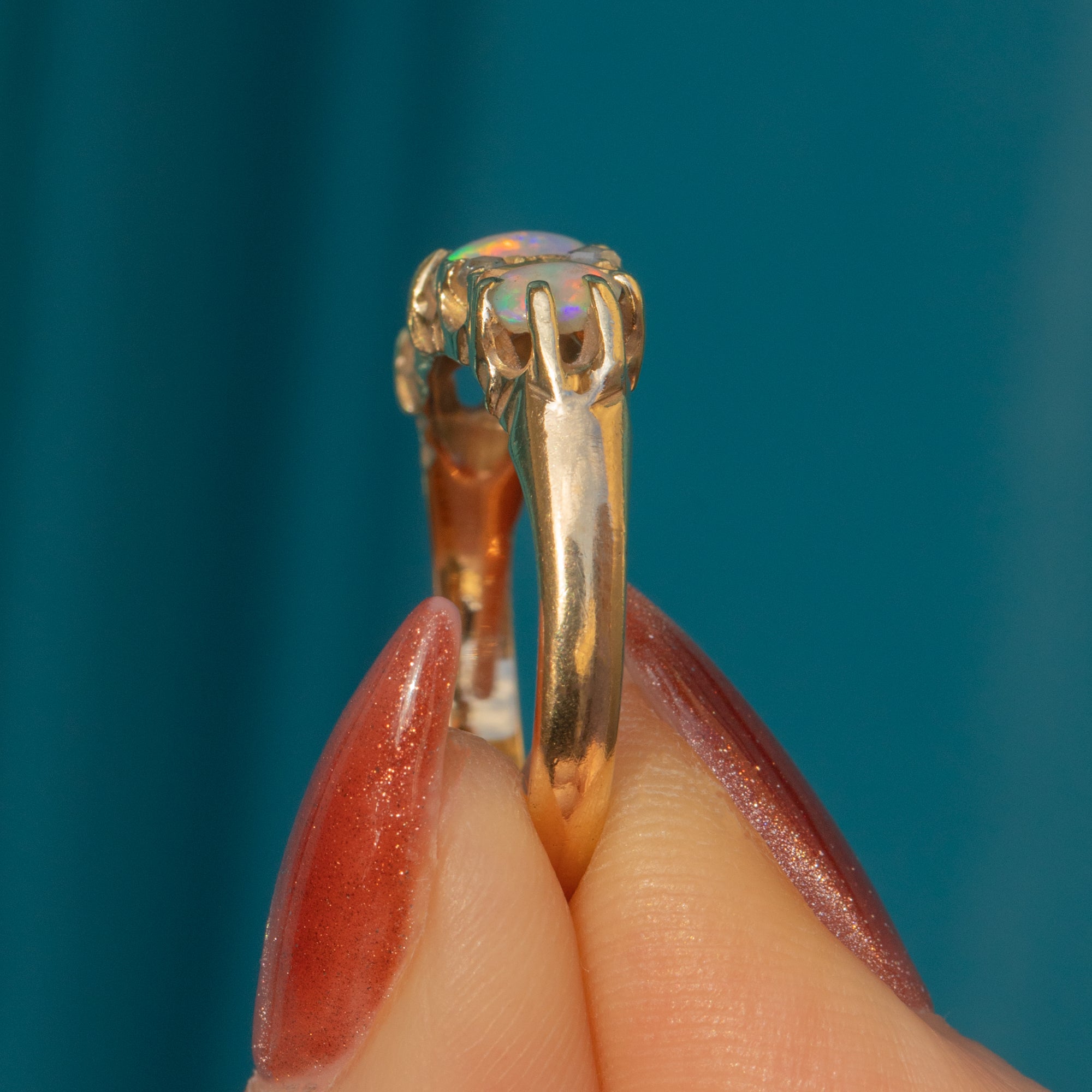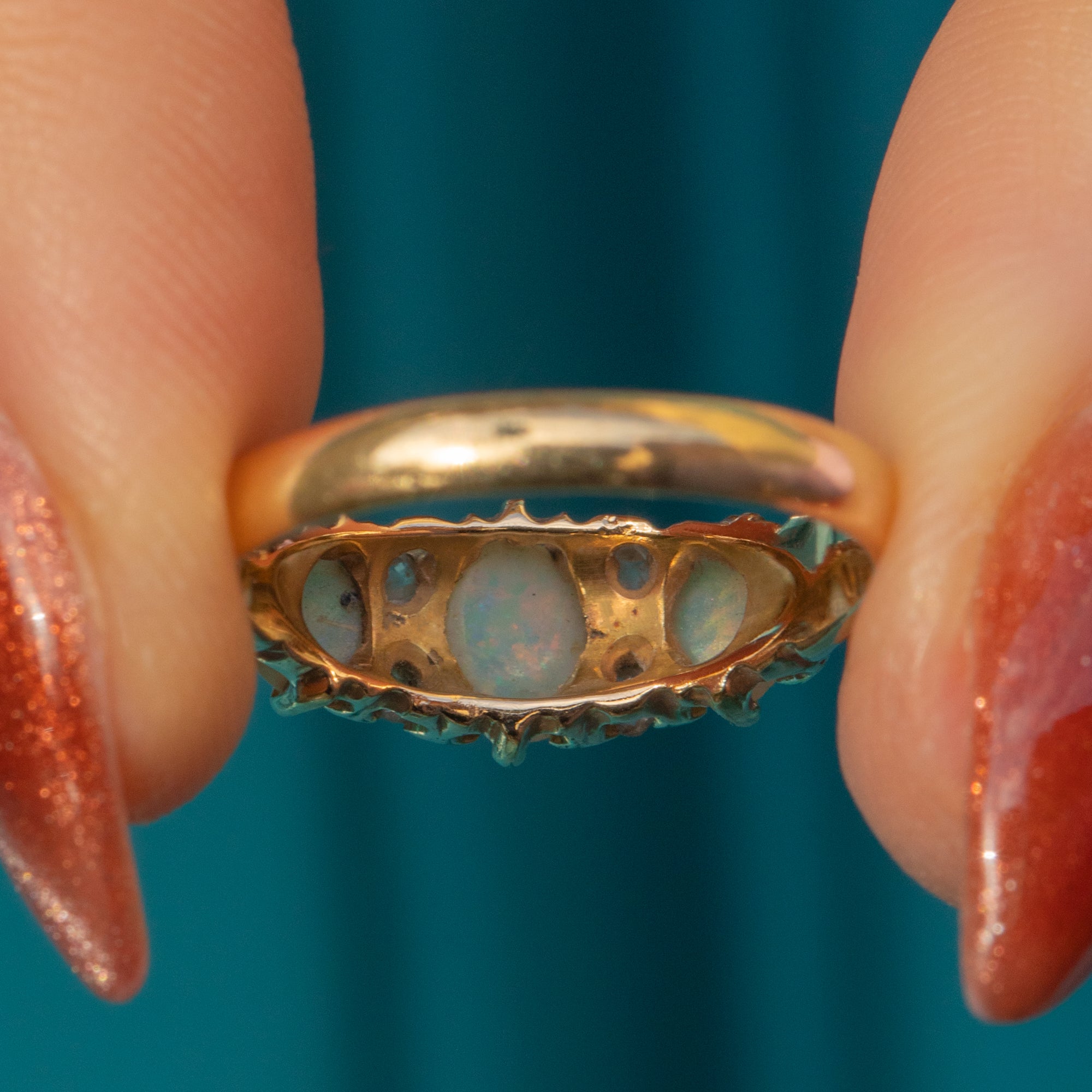 MATERIALS: 18ct Gold, natural solid Opals (0.44ct), Rose-Cut Diamonds.