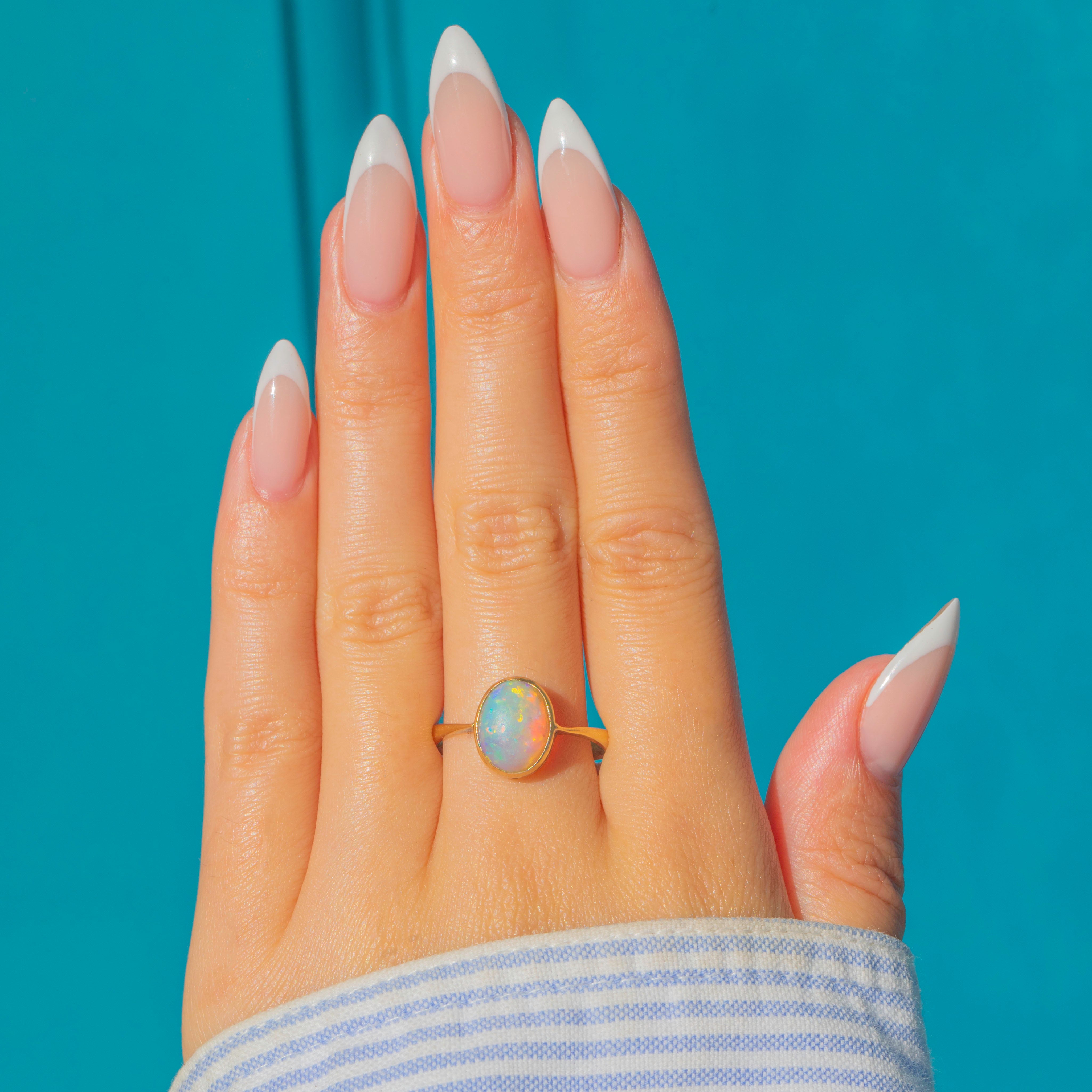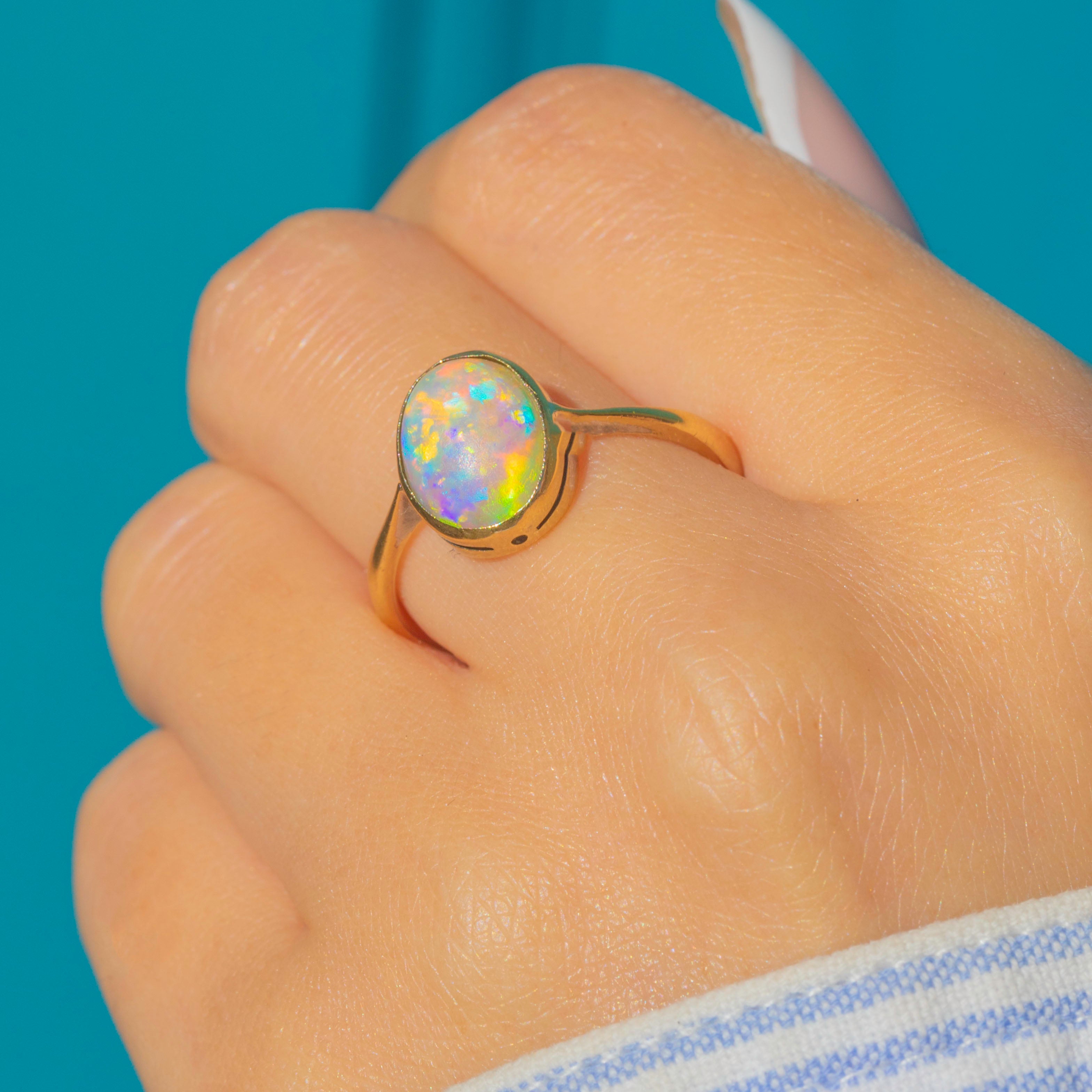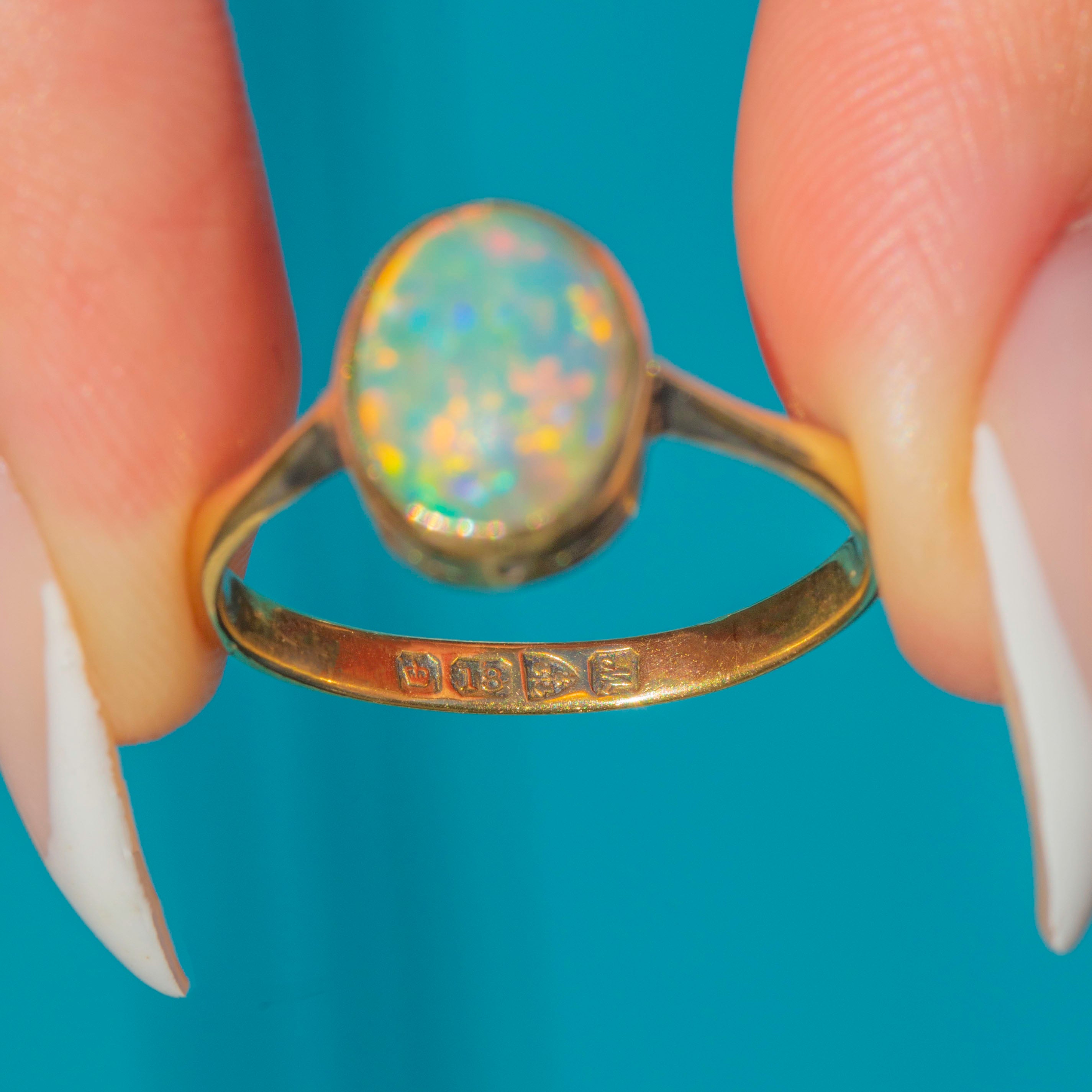 This elegant Edwardian ring is crafted in 18ct Gold and set with a vibrant natural Opal. The oval cabochon, measuring 10mm x 8.5mm, displays a beautiful play-of-colour with flashes of yellow, green, and blue dancing across its surface.