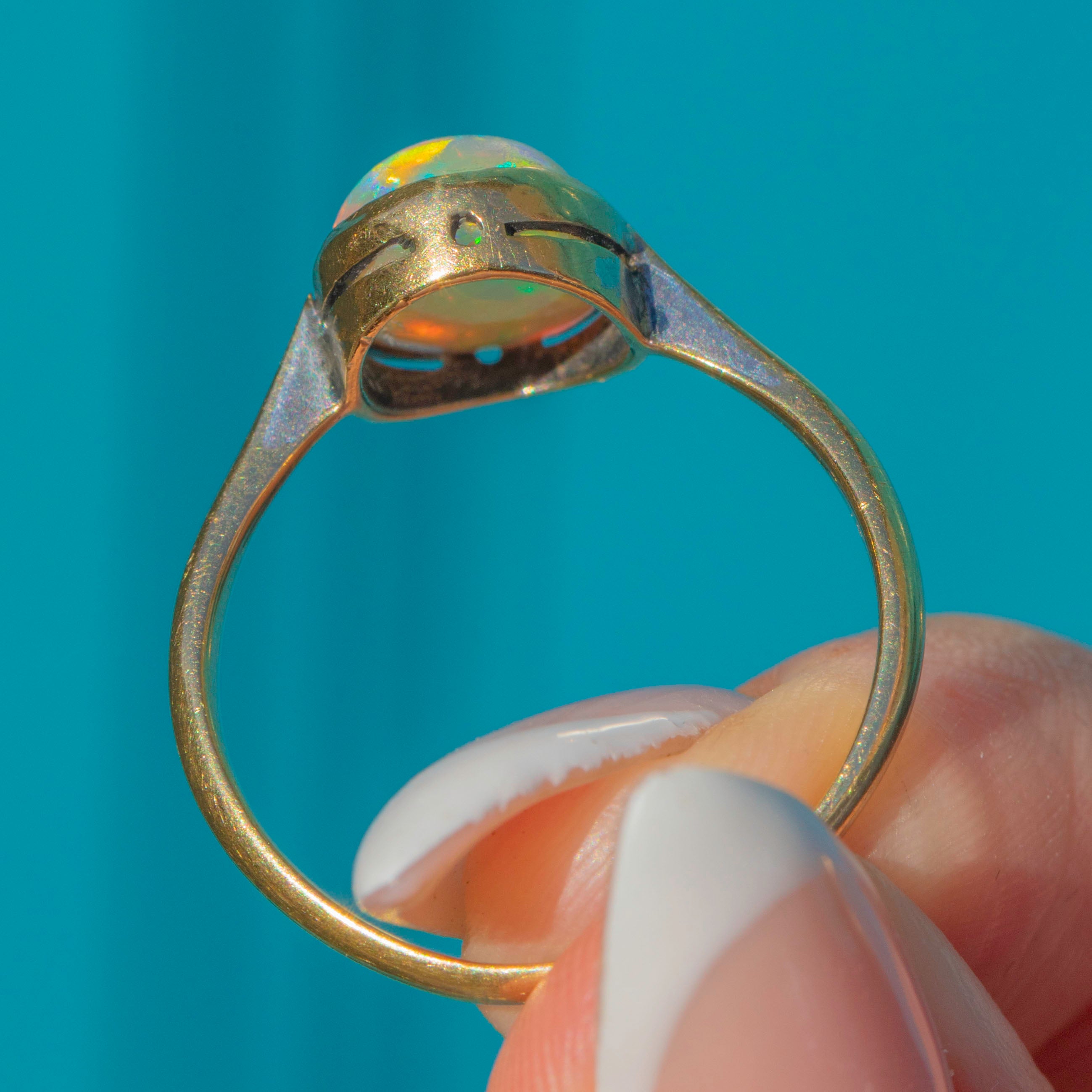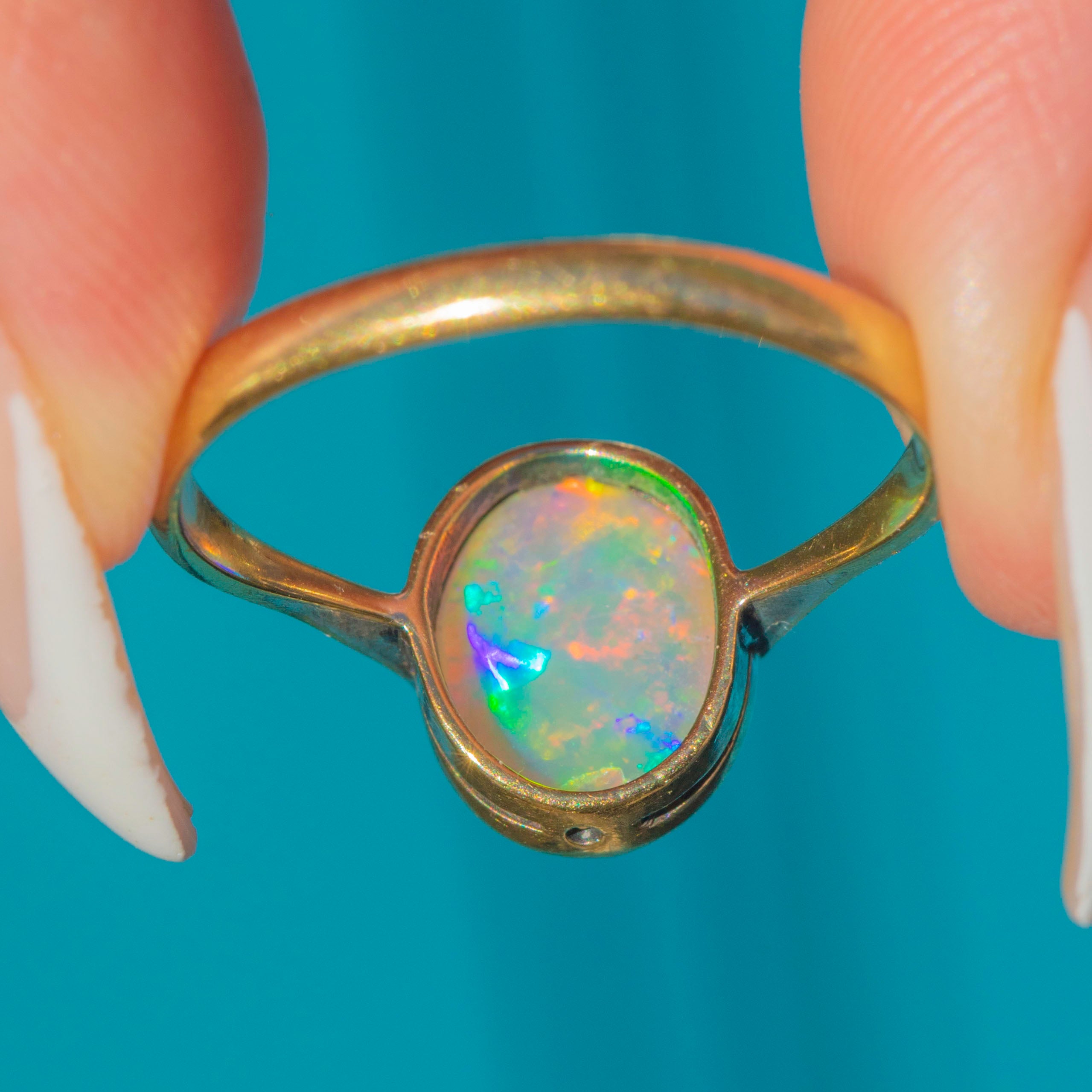 EXCELLENT: The Opal shows only the lightest surface wear, with vibrant colours throughout. The Gold setting is smooth and in beautiful antique condition.
