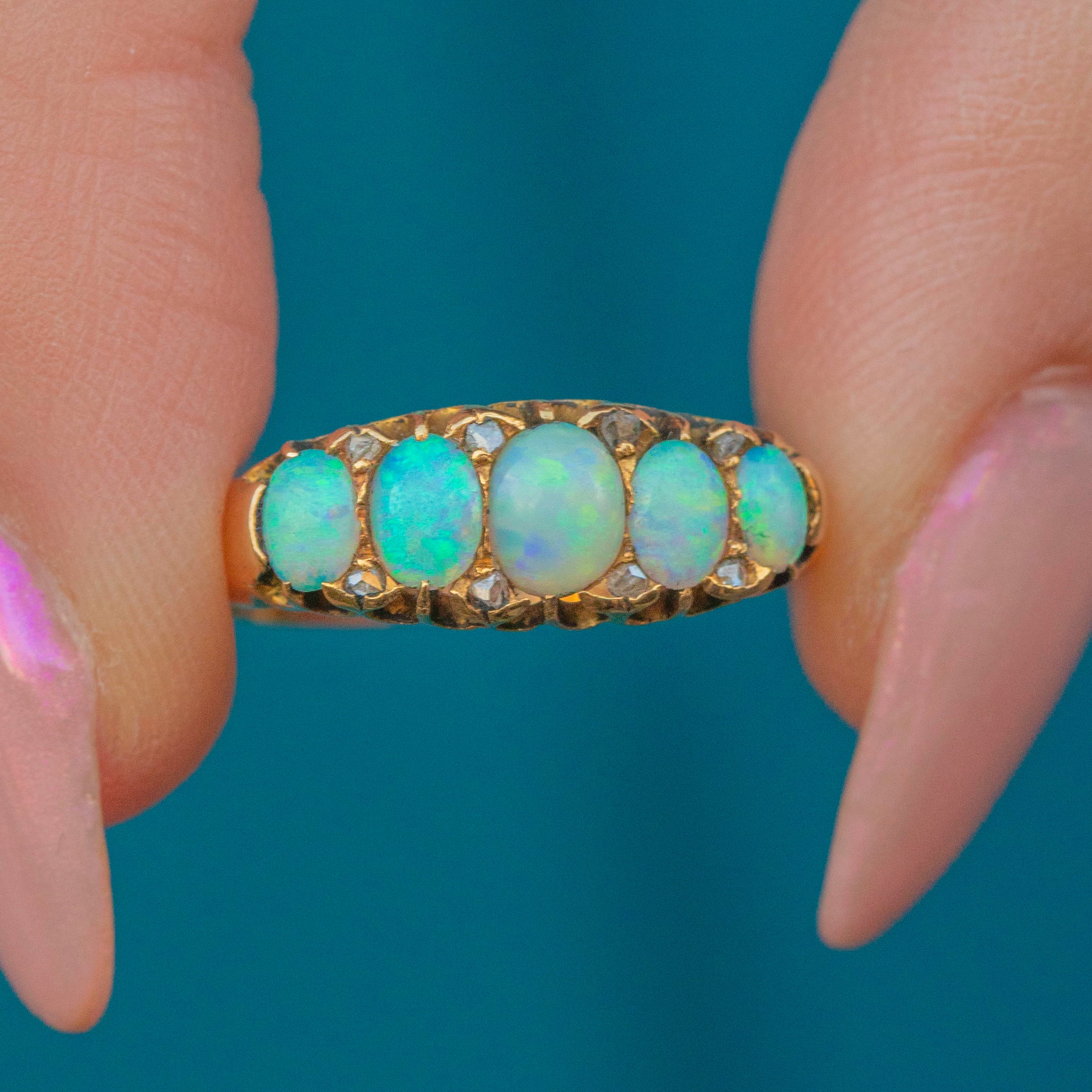 MATERIALS: Tests as 18ct Gold, Opal (solid natural), Rose-cut Diamond spacers.