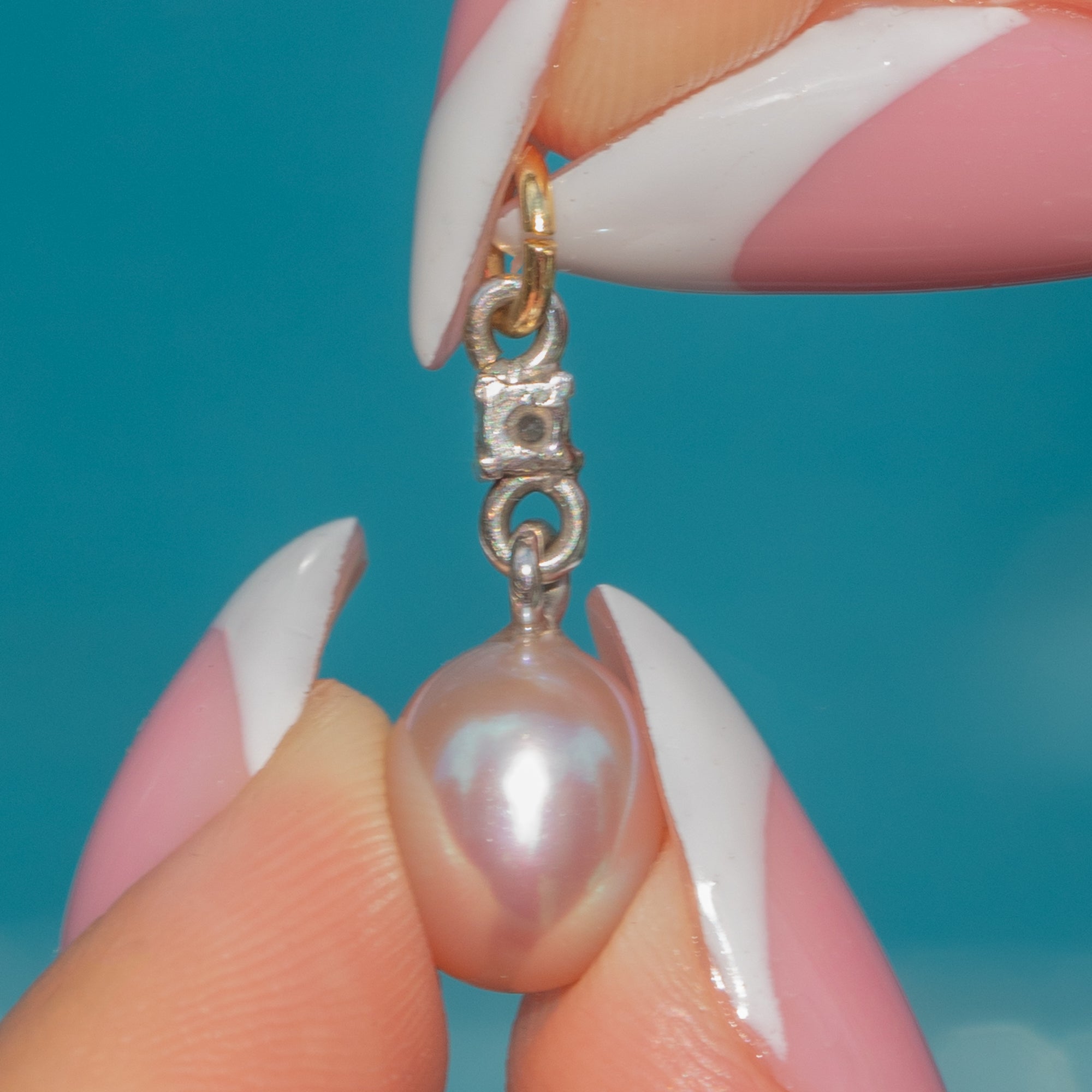 This exquisite antique Pearl Diamond charm is the definition of timeless elegance and sophistication. Crafted from lustrous 18ct White Gold, this Edwardian pendant features a shimmering baby pink Pearl, radiating natural beauty, accented by petite scintillating Diamonds.