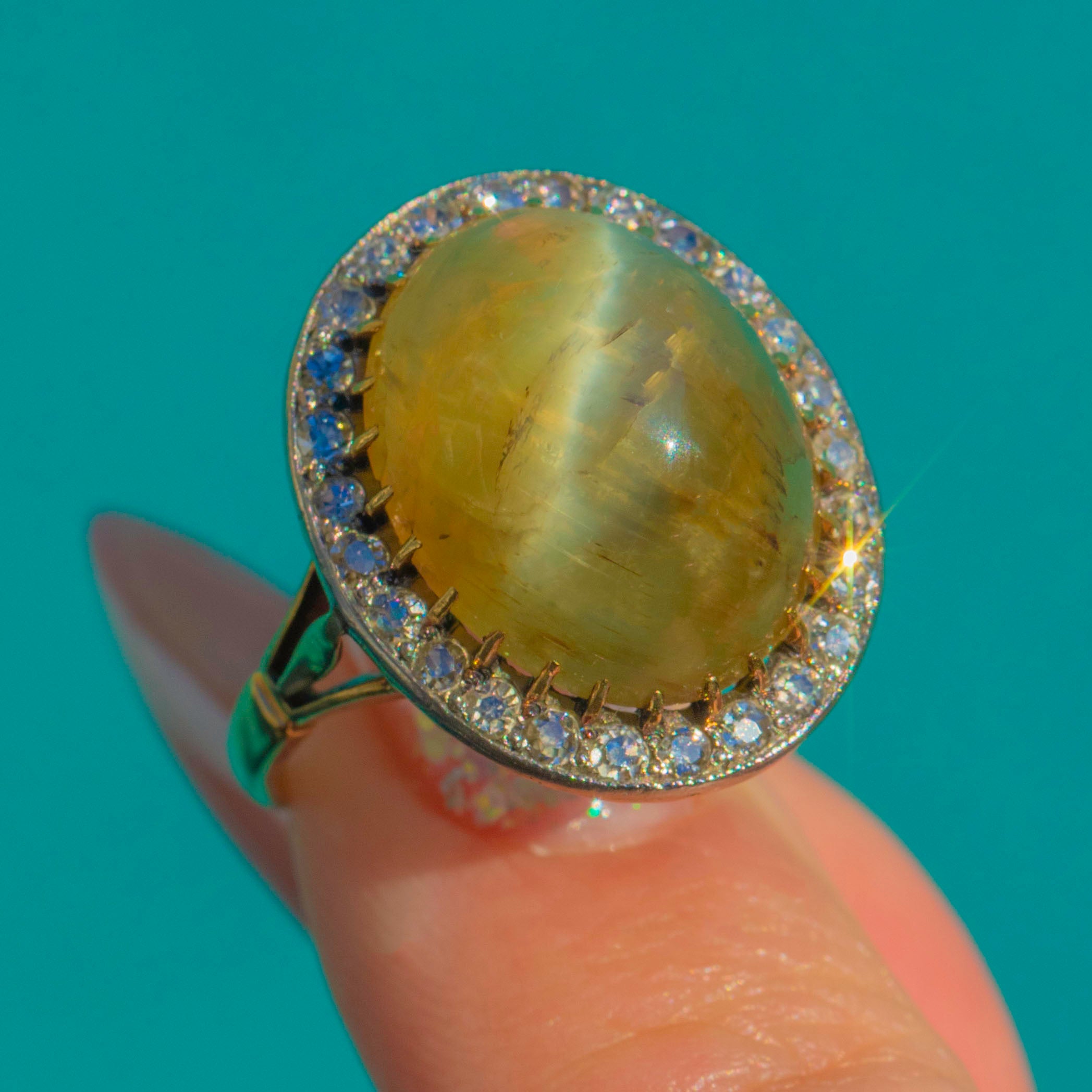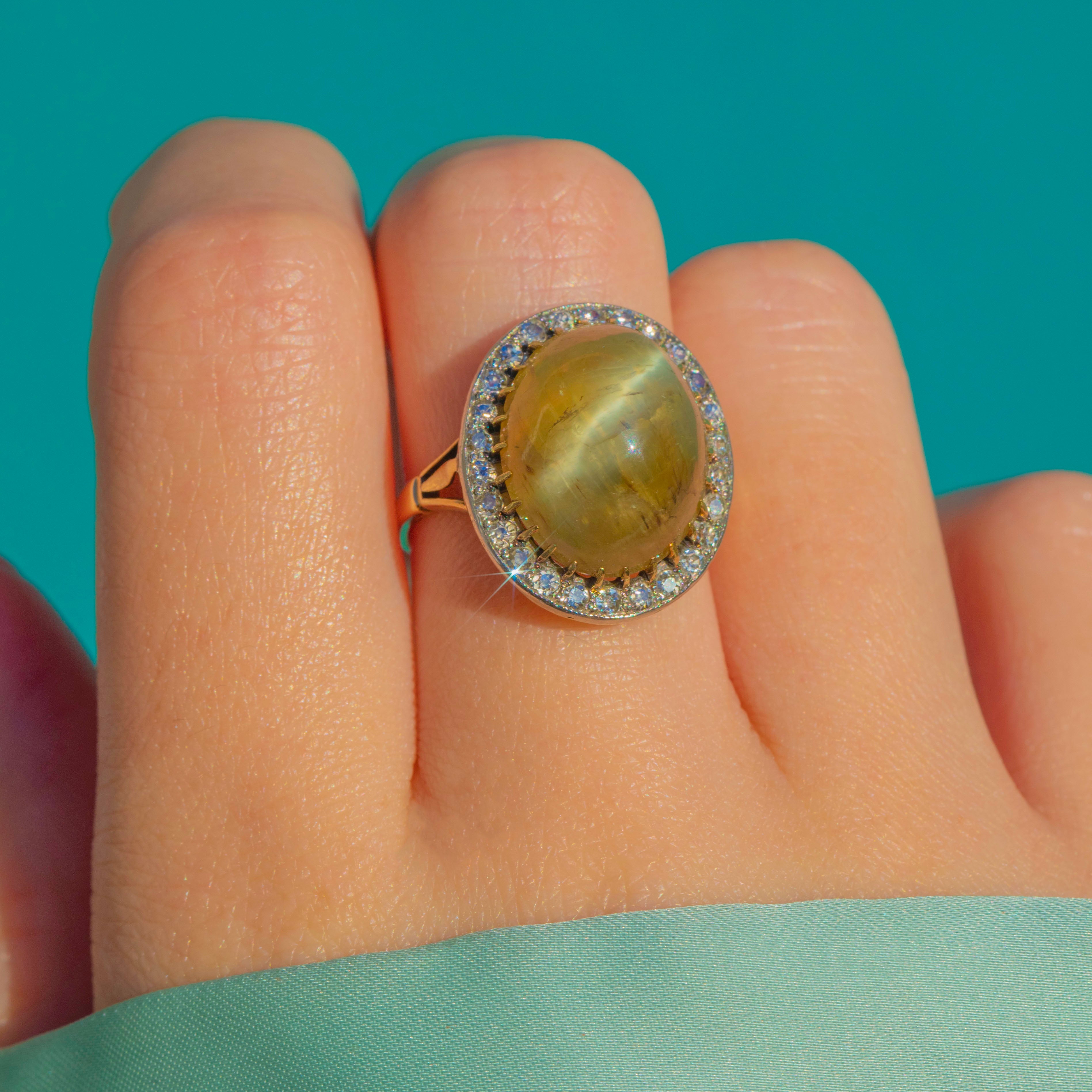 A luminous Victorian treasure, this ring centres a high-domed sugarloaf Chrysoberyl with a distinct cat’s‑eye line, its yellow‑green glow framed by a sparkling halo of Diamonds. The two‑tone construction is quintessentially refined, with a white Platinum head for crisp brilliance, set atop an 18ct Gold shank with elegant split shoulders and a pierced gallery for light and lift.