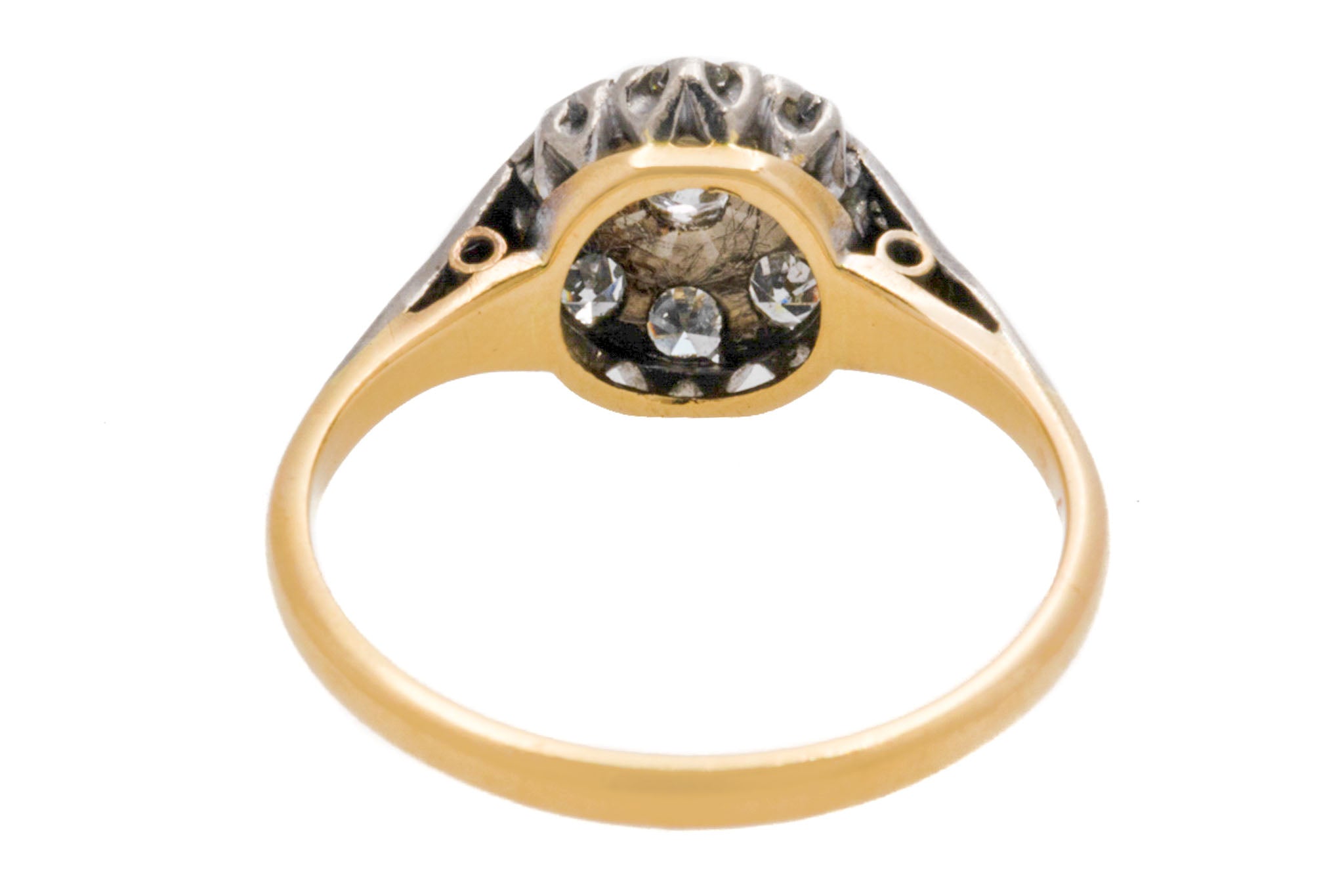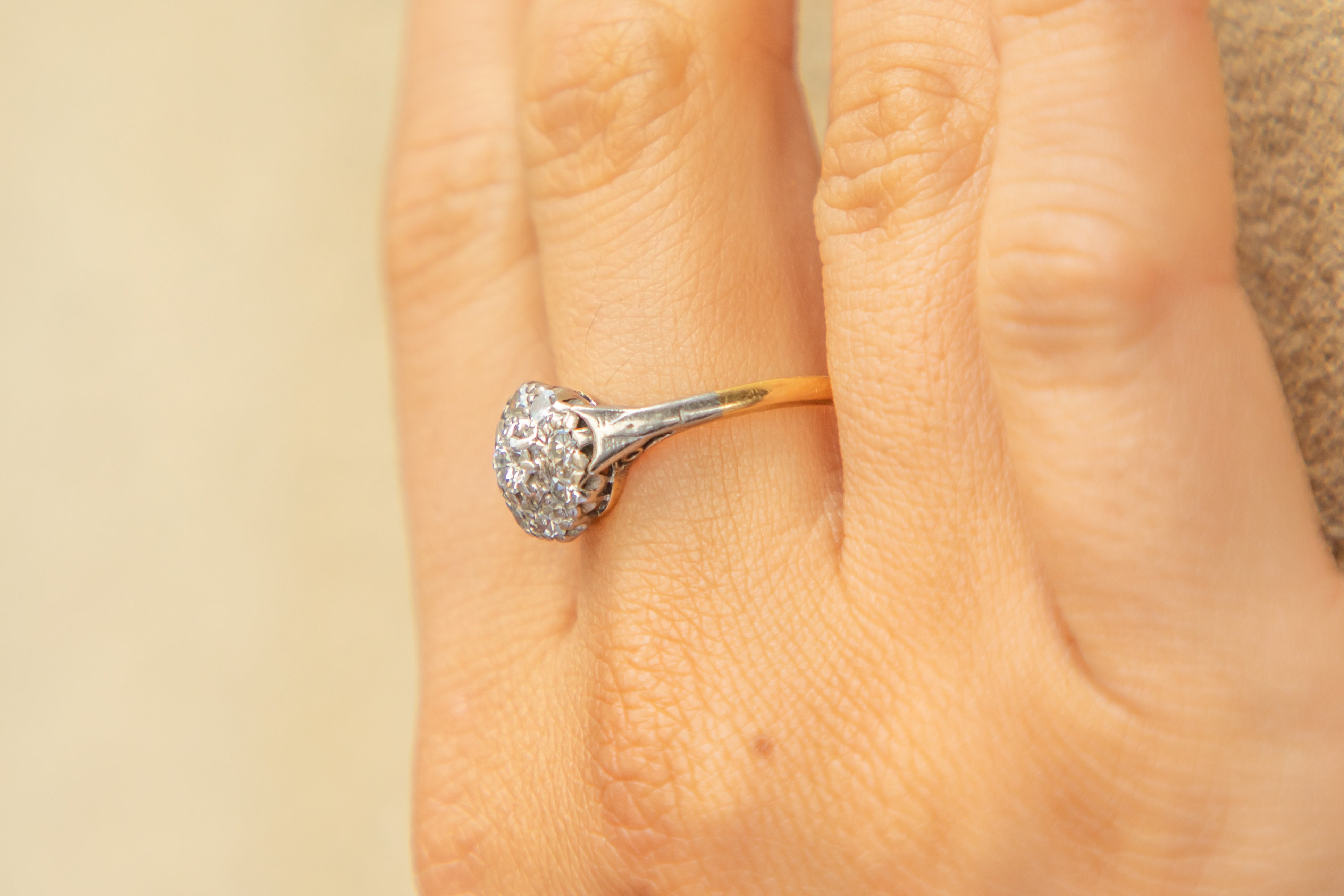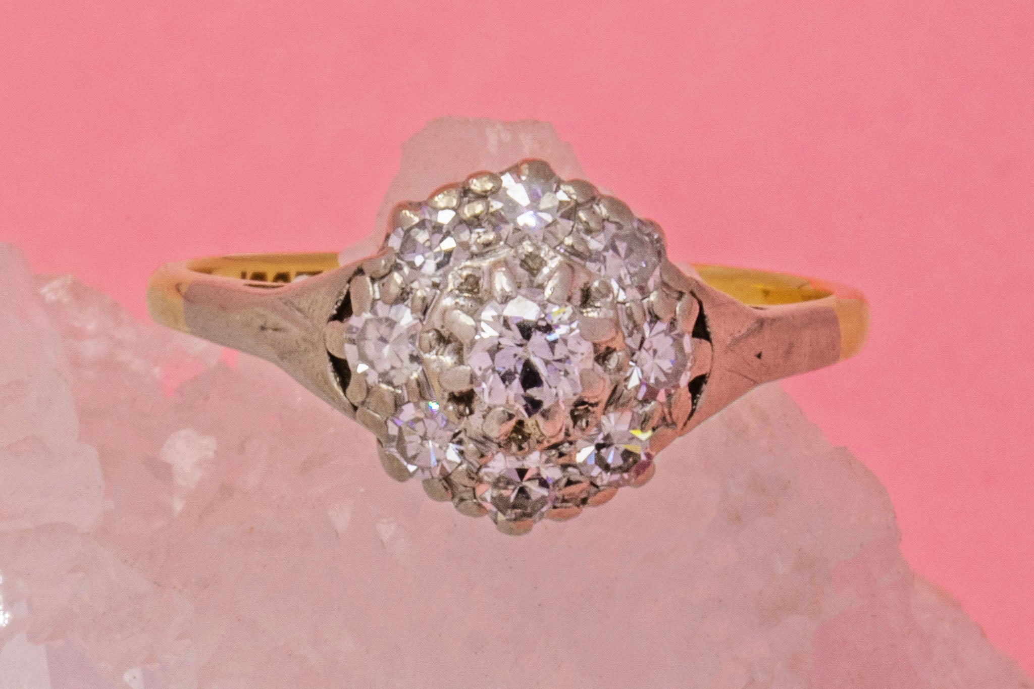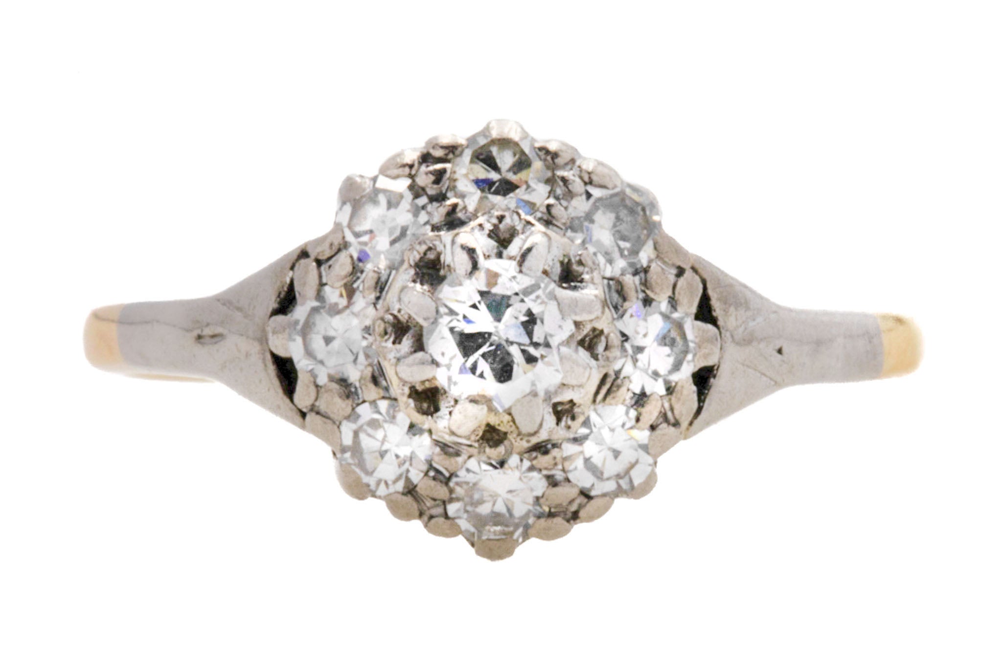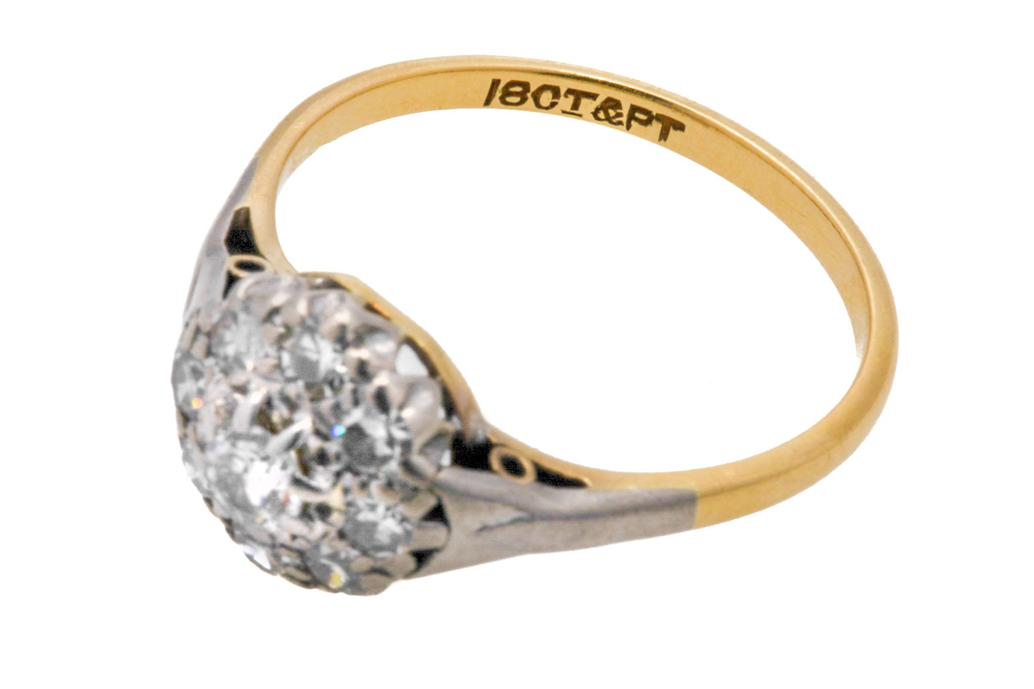 VERY GOOD. This Edwardian 18ct Gold Platinum Diamond cluster ring is in very good condition throughout. Her Diamonds are in wonderful condition with no chips or fleabites to note, securely set within their settings. There is some minor wear to the Platinum shoulders, but this is only noticeable under very close inspection. The 18ct Gold band is also in lovely antique condition, remaining as glossy as ever. She is a thing of beauty, and would make a fine choice for an engagement ring, a gift, or just as a treat for yourself!