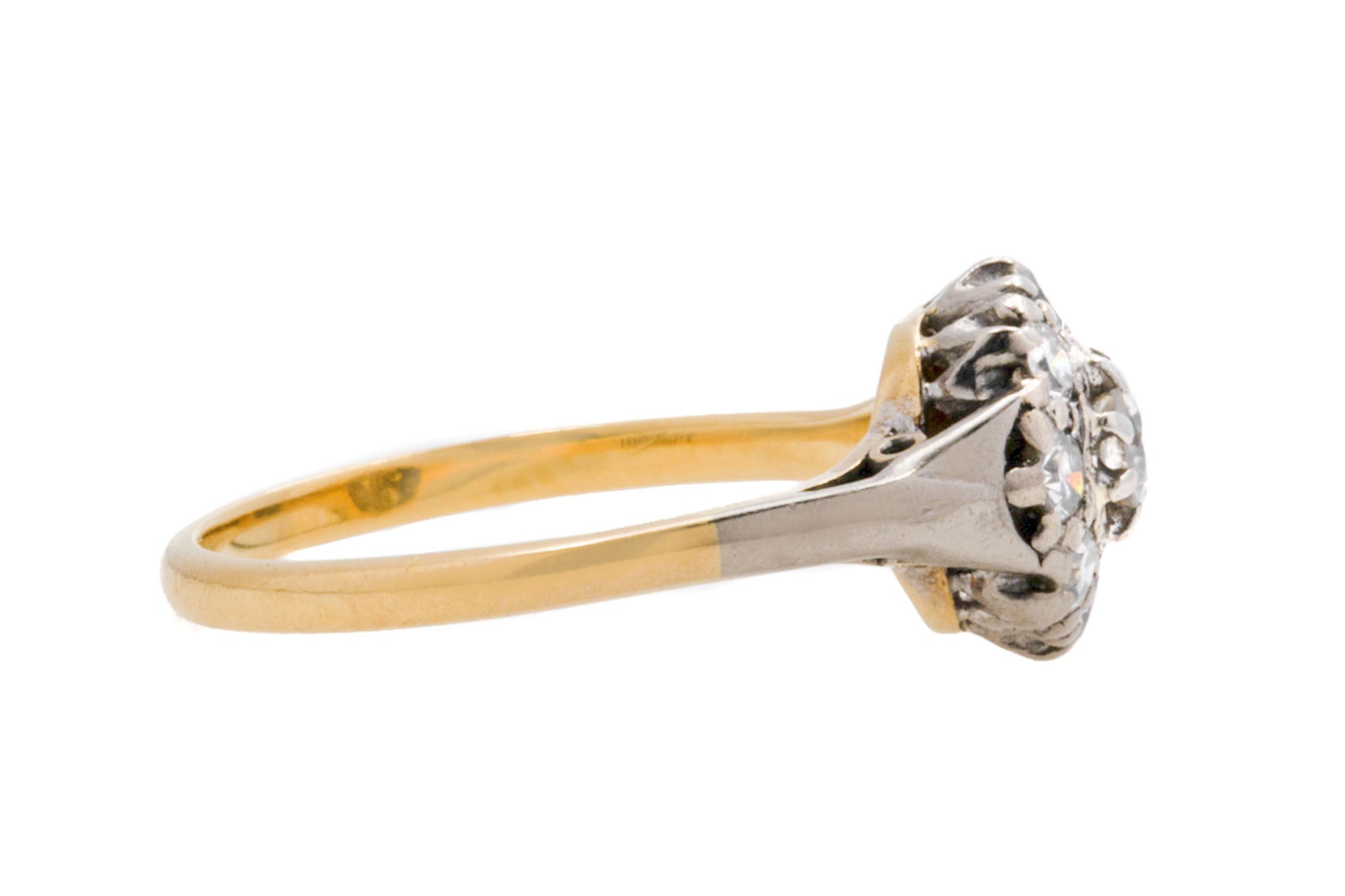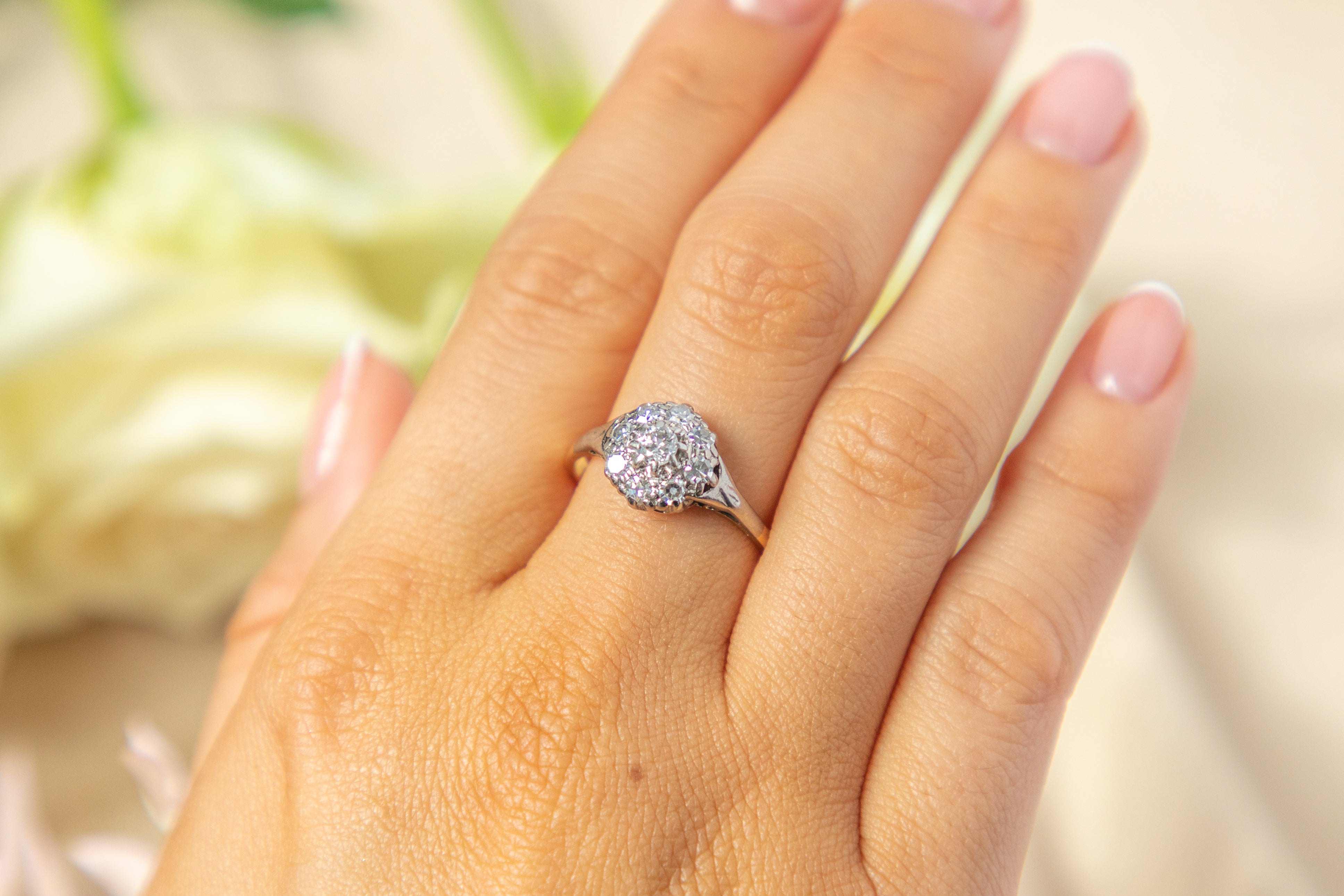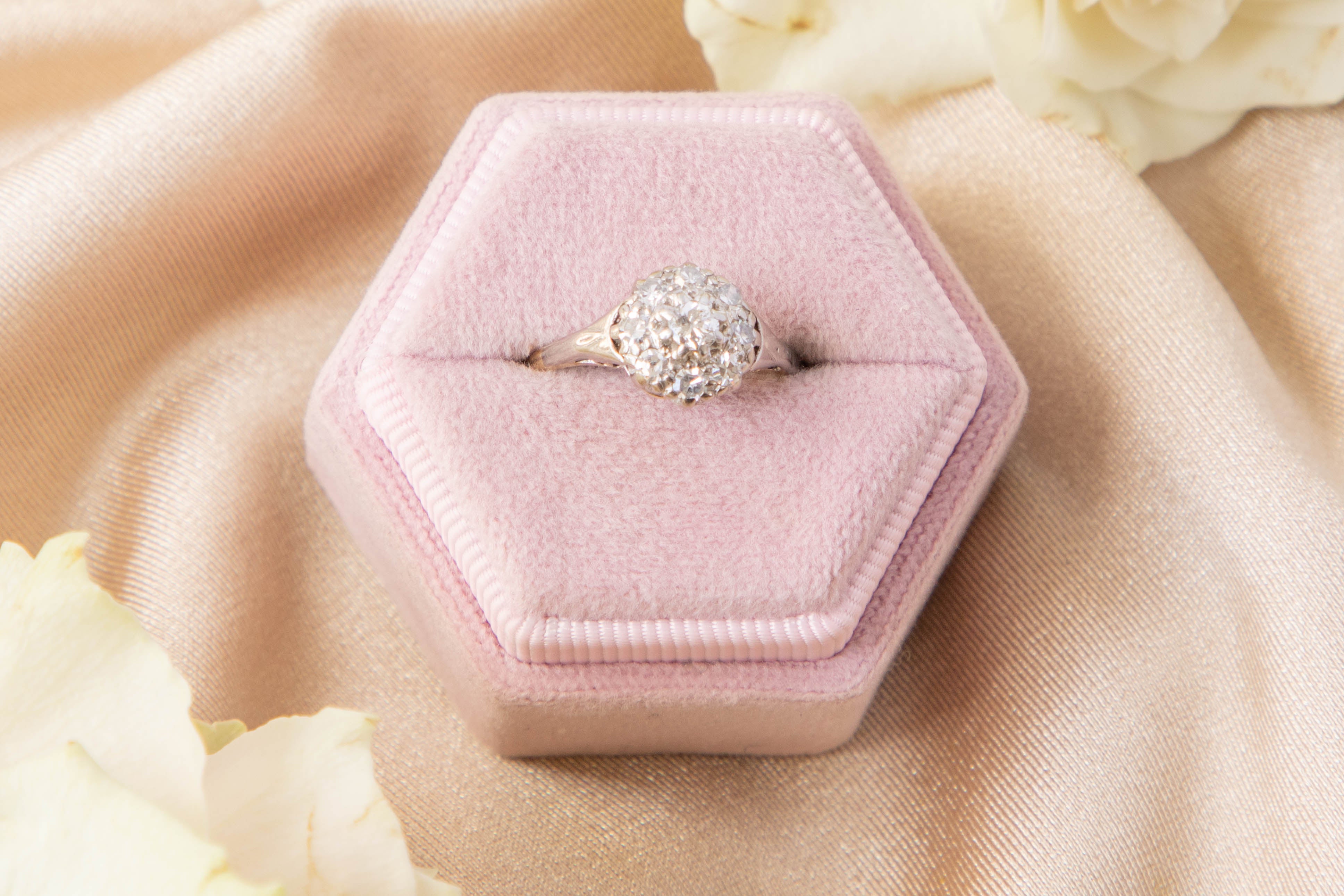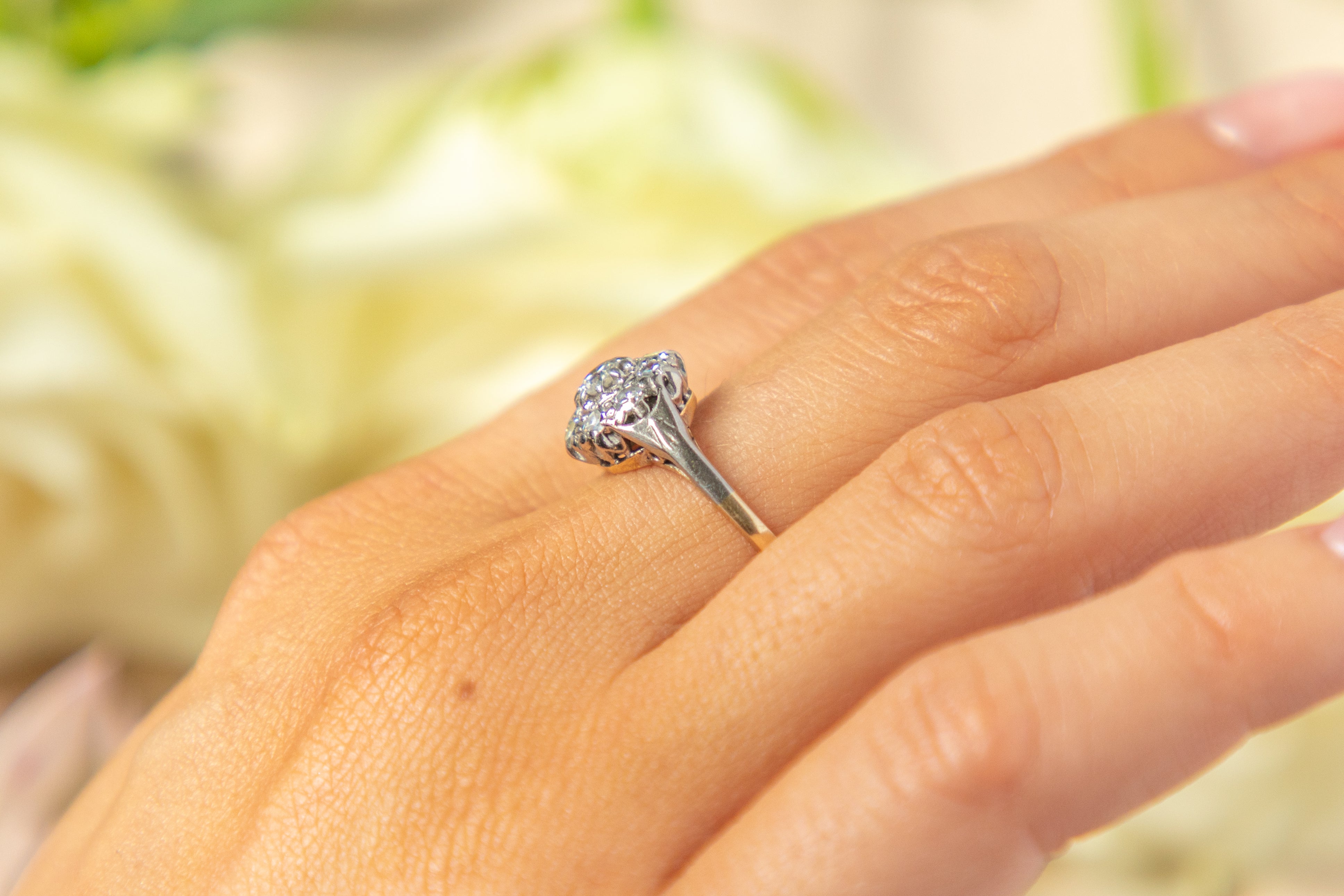 A timeless Edwardian 18ct Gold Platinum Diamond cluster ring! This beauty exudes romantic charm and features nine dainty Diamonds forming her daisy cluster shape. Each of her Diamonds have a bright sparkle that ooze Edwardian charm.