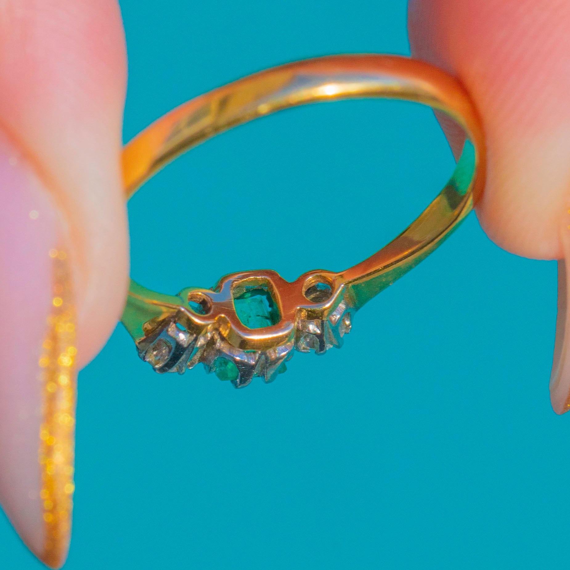 VERY GOOD: The Emerald is bright with a natural inclusion visible, typical for antique Emeralds. Diamonds are clean and lively with no obvious abrasions. Platinum settings and claws are secure and well-preserved. the solid 18ct Gold Gold band shows light surface wear in keeping with age but no thinning or structural issues. Presents beautifully when worn.