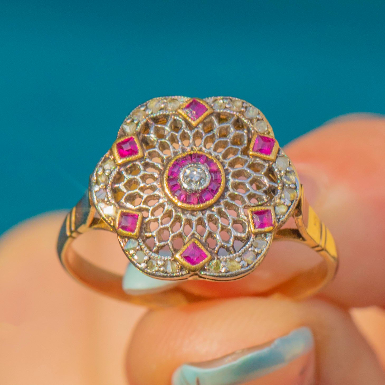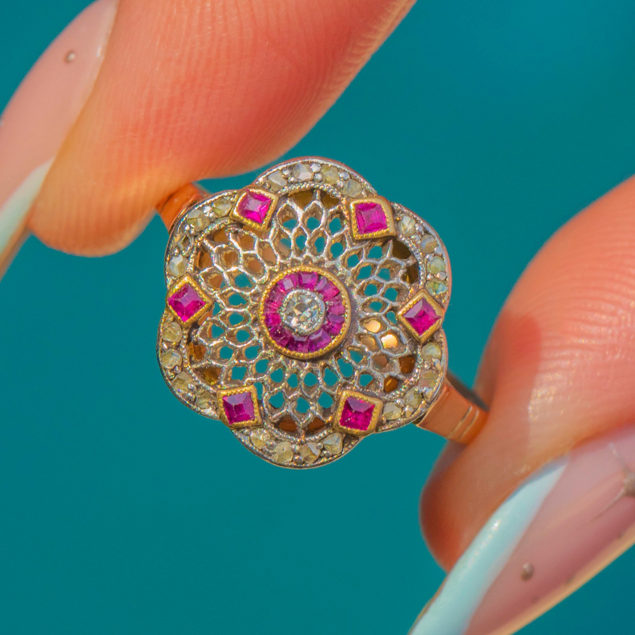 A wonderfully ornate Edwardian filigree cluster ring, crafted in two-tone 18ct Gold with Platinum settings. The lacy rosette head is edged with fine milgrain, centred by a petite round Diamond and framed by a precise circle of calibré-cut Rubies. An elegant scalloped border glitters with delicate rose-cut Diamonds, with tiny square Ruby accents punctuating the perimeter for a refined, jewel-box finish.