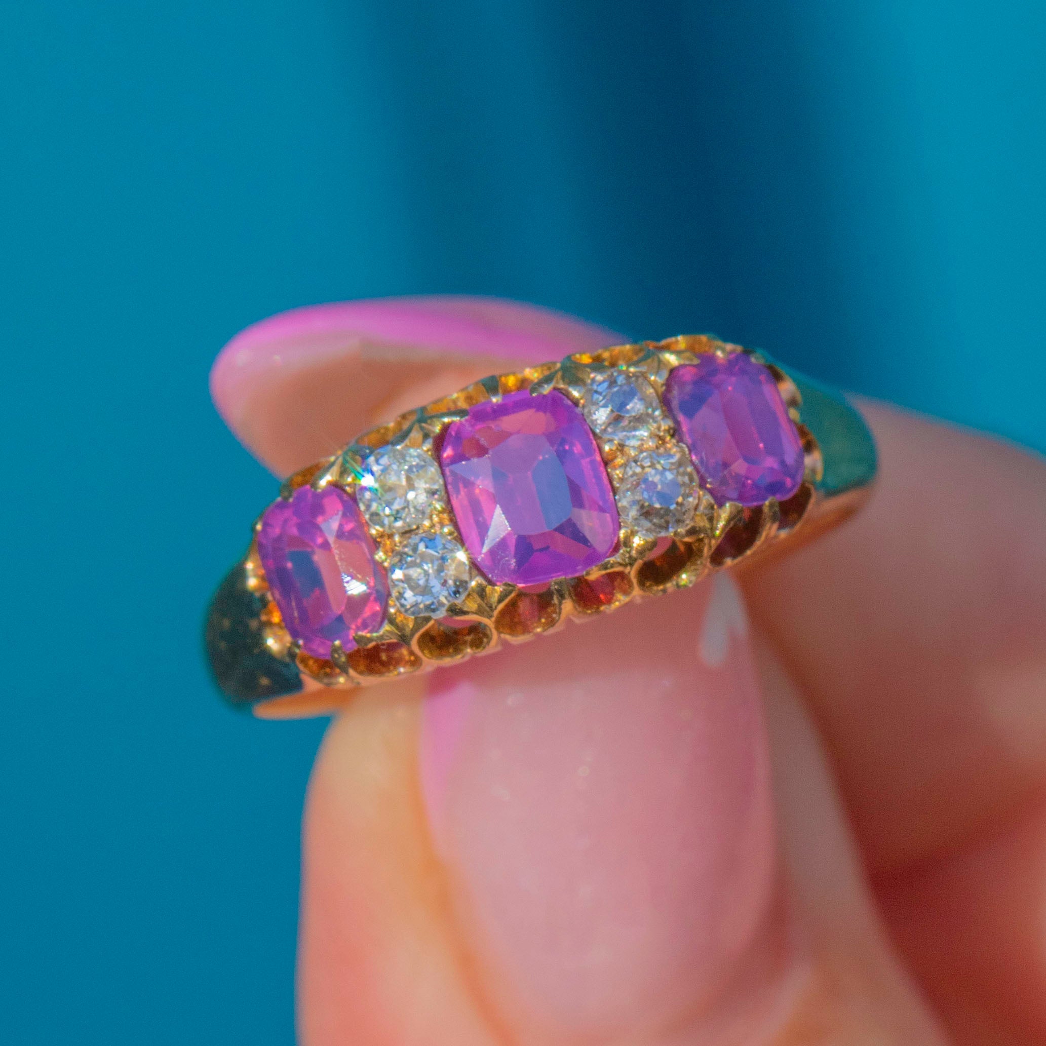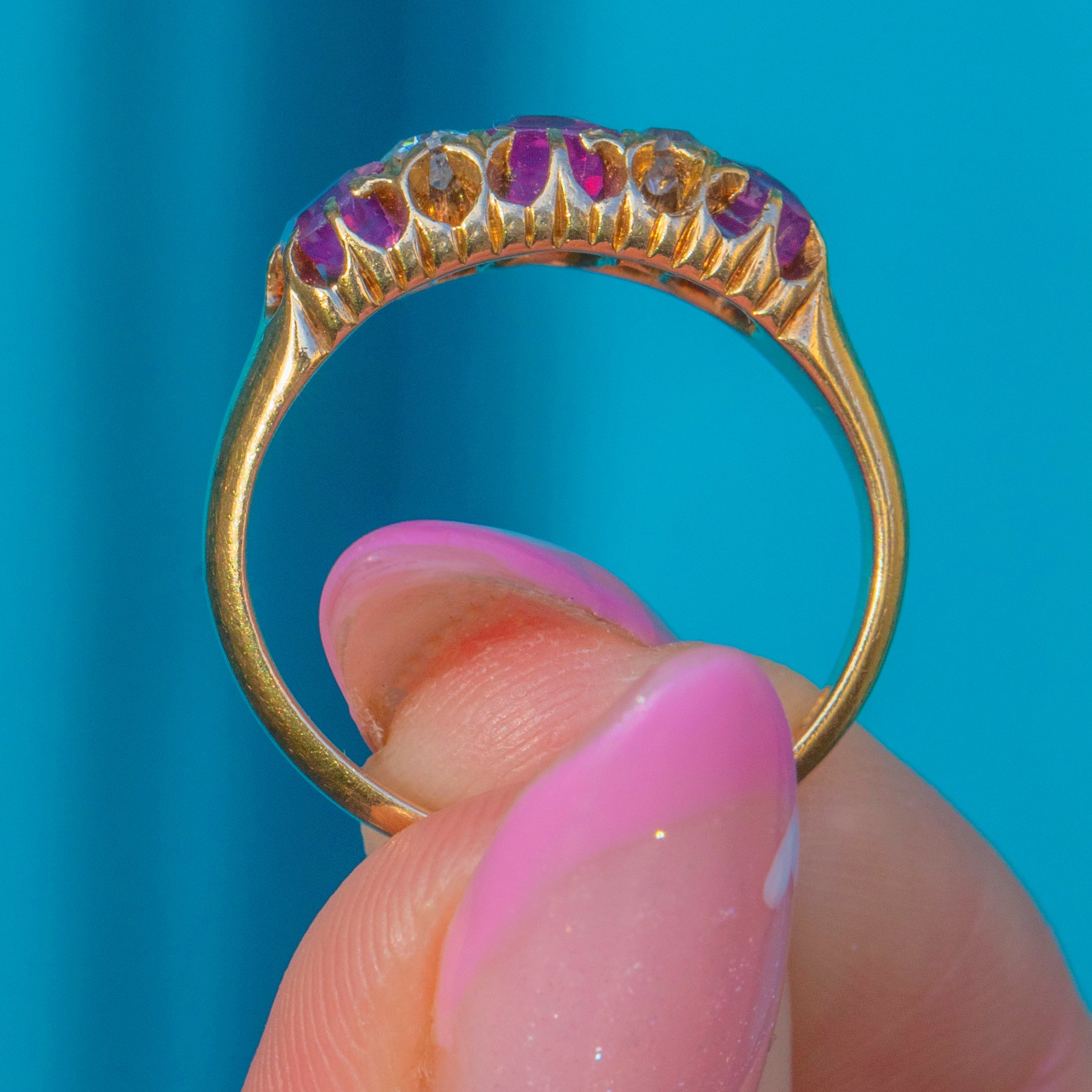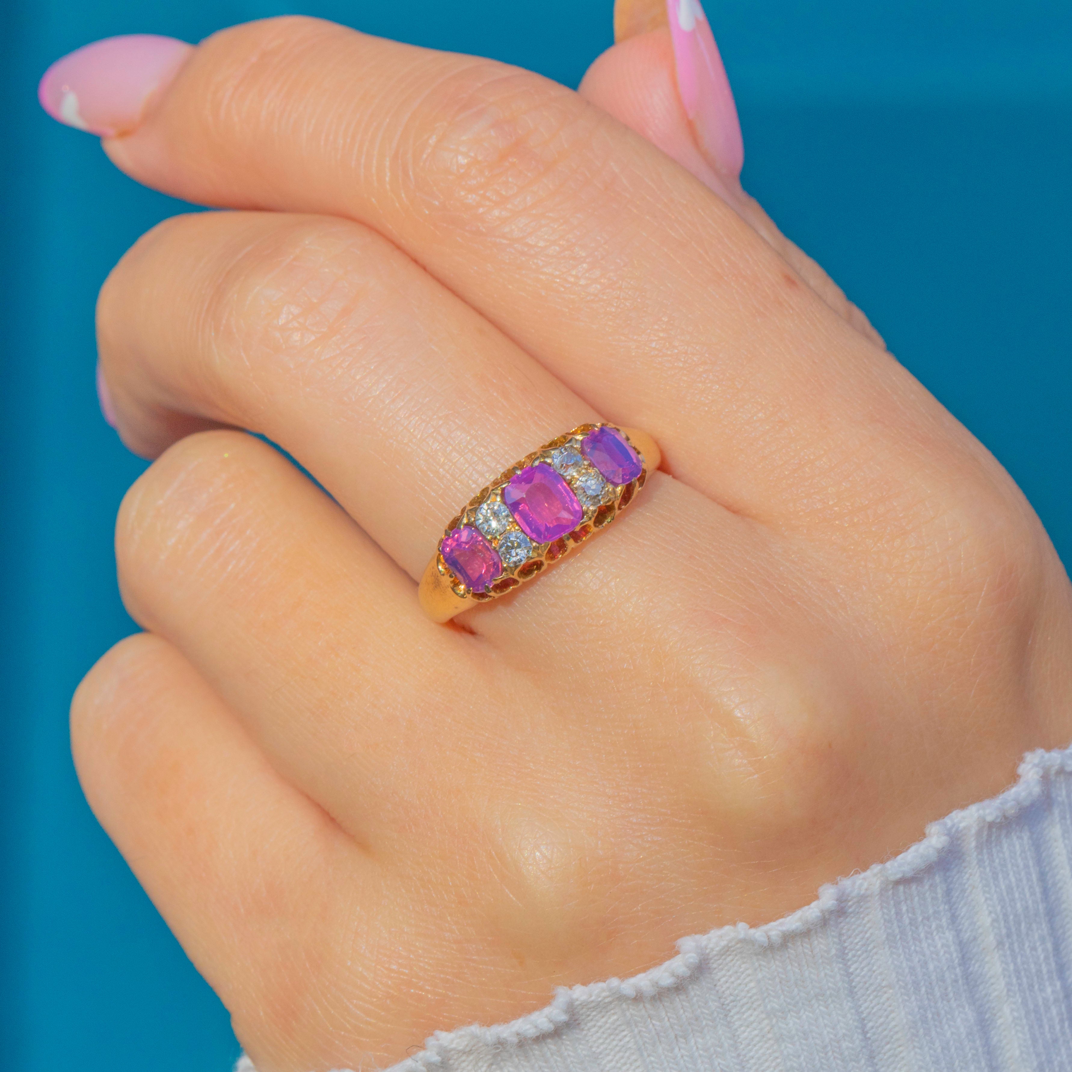 A stunning Edwardian seven-stone ring crafted in 18ct Gold, set with a beautiful row of vibrant fuchsia Rubies adding up to 1.45ct interspersed with twinkling old-cut Diamonds. The combination of vivid colour and sparkle makes this piece both eye-catching and timeless.